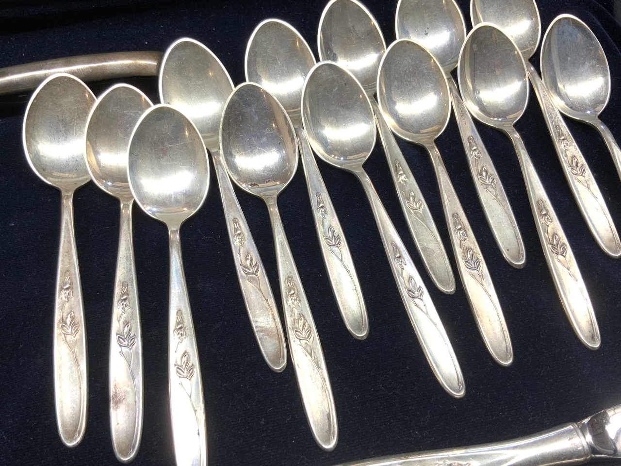 70 piece Towle sterling silver flatware service for 12. Spoons, Serving Pieces, Forks Weight: 5lbs 2.3 avg. ozDinner Knives Weight: 1lb. 12.4 avg. oz. Three pc. Carving Set Weight: 1lb. 1.8 avg. oz. Total weight: 8lb .5 avg. oz Overall