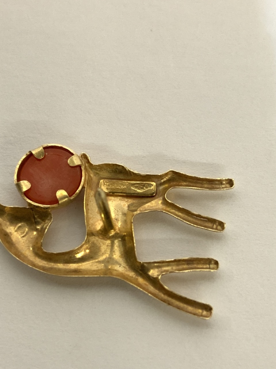 A small 18k yellow gold deer tack pin with coral stone.
