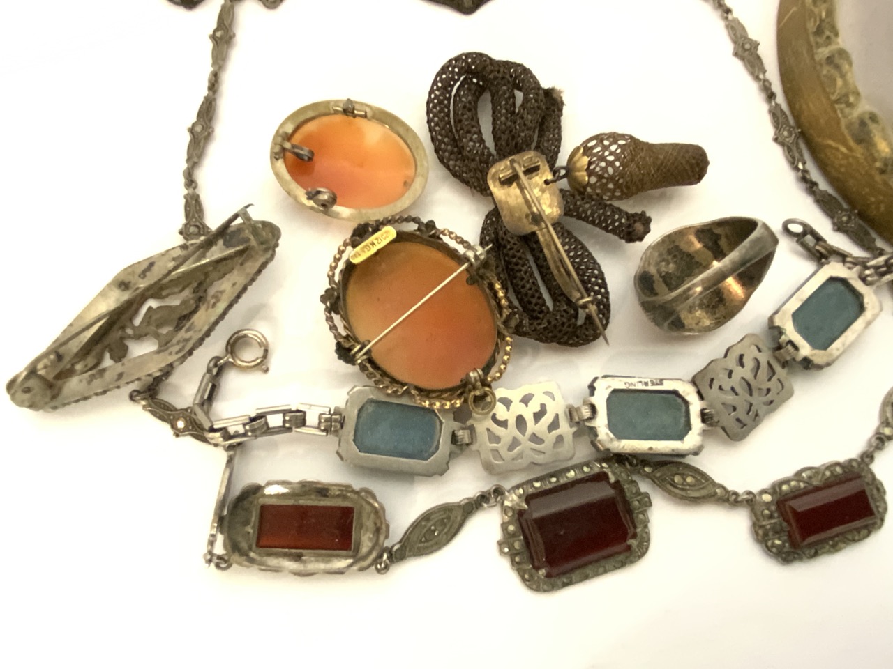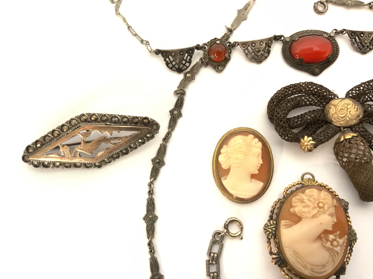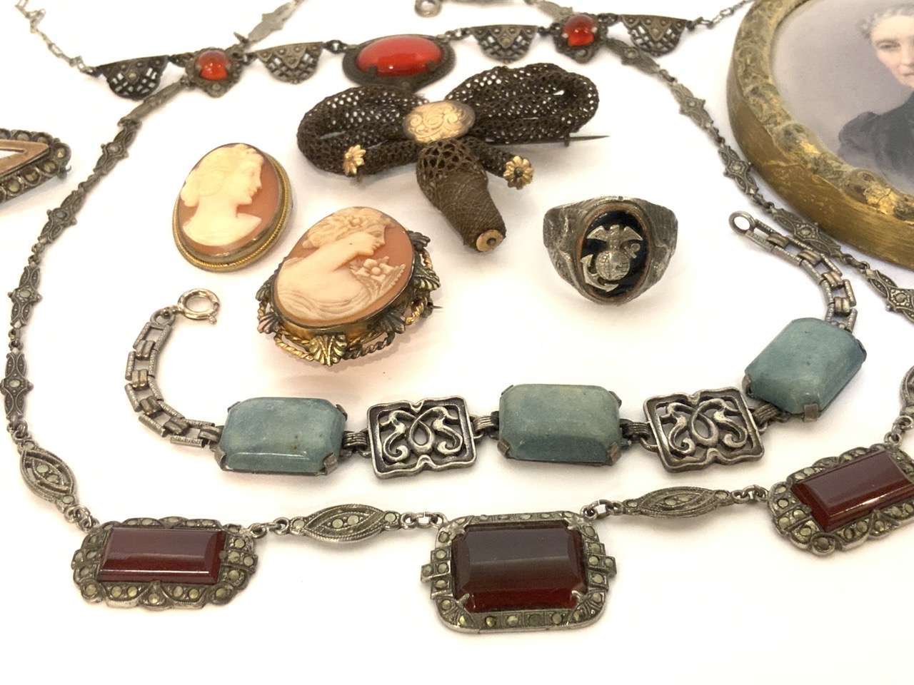 Victorian And Art Nouveau era jewelry group. Cameos, silver, human hair pin, miniature portrait, marcasite, necklaces etc..