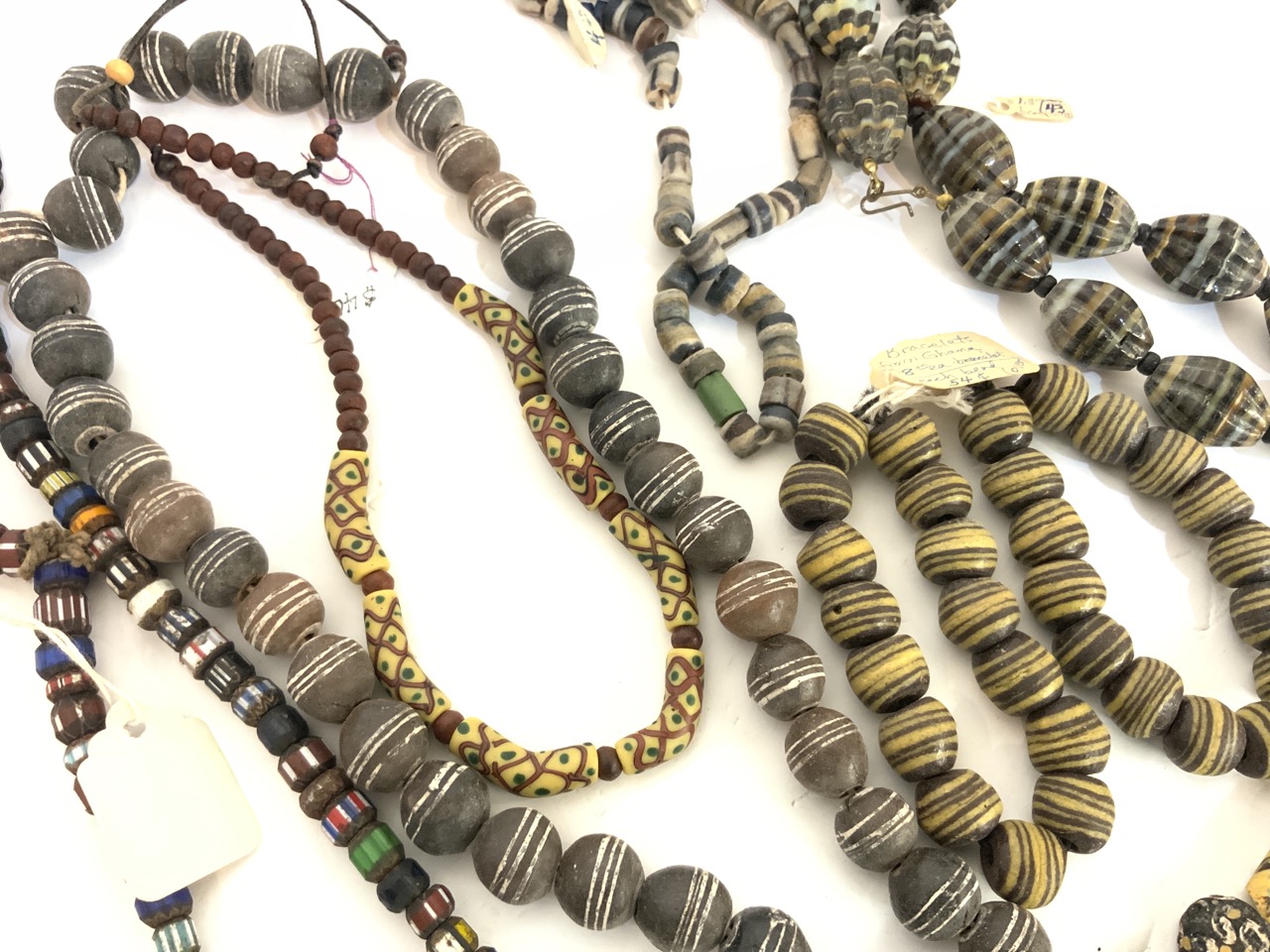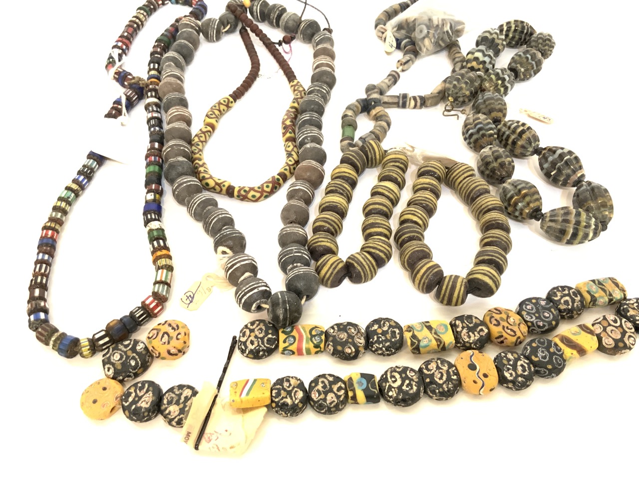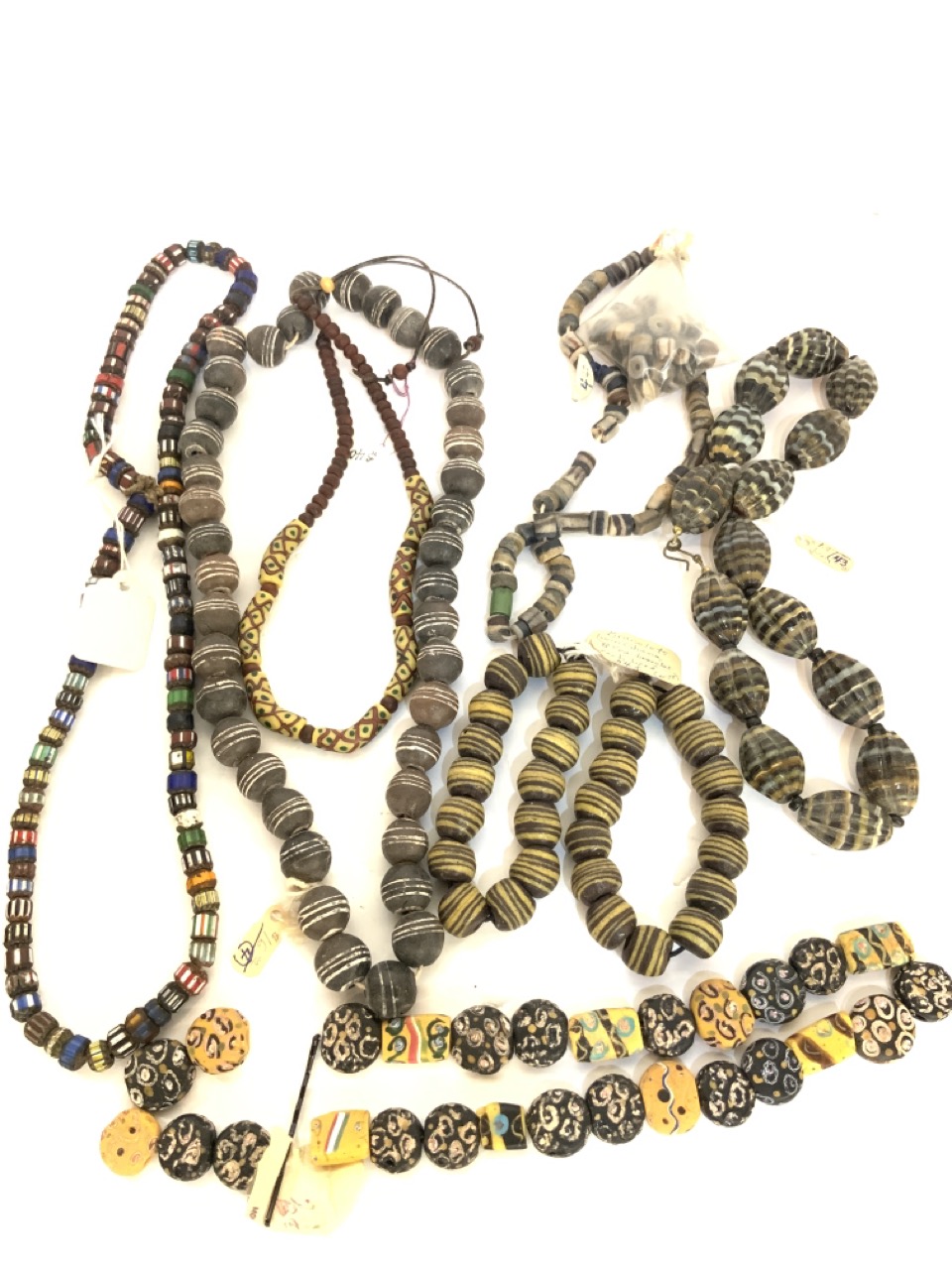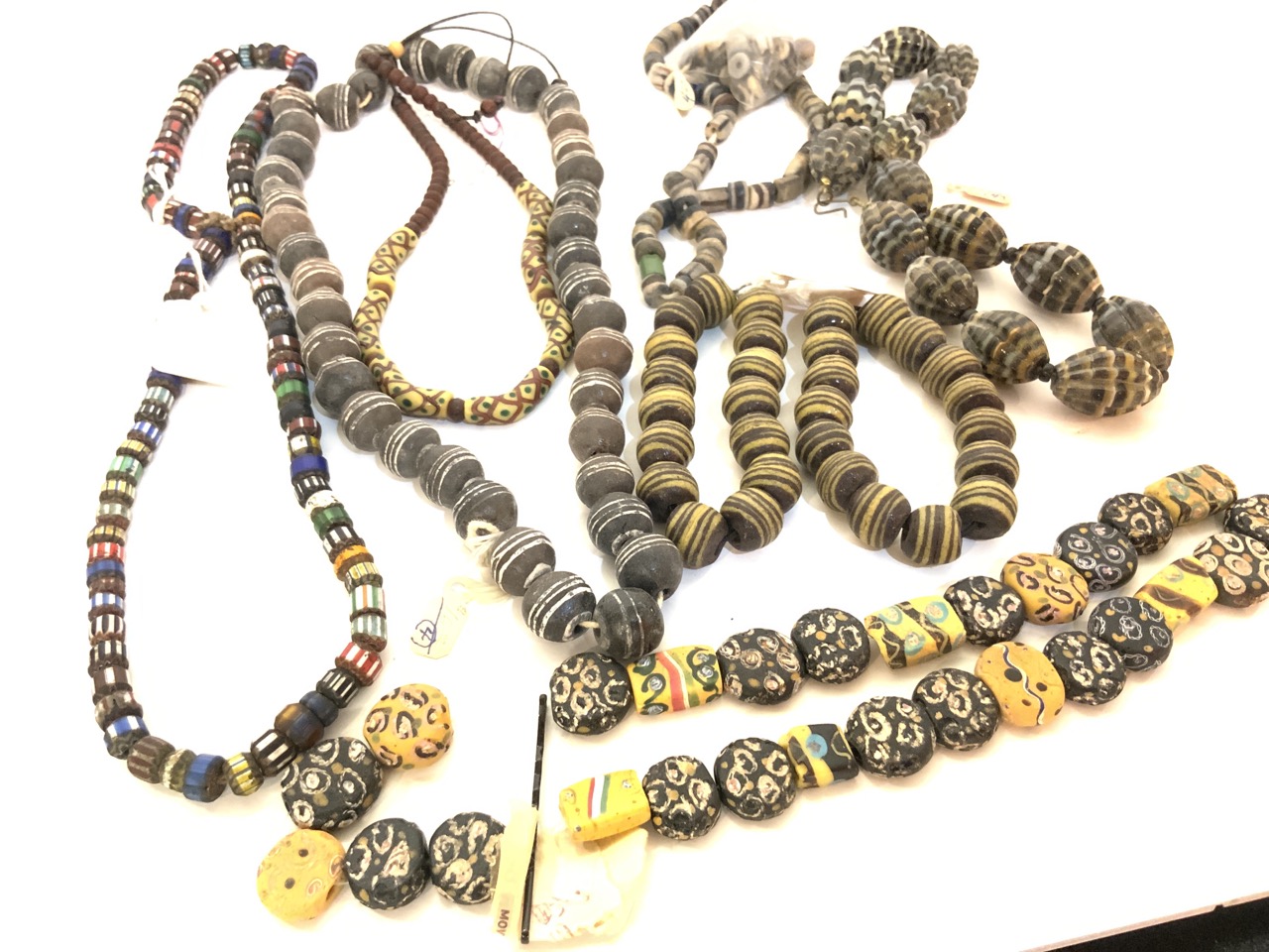 Nine (9) African trade bead strands. Chevron, Ghana beads etc. As seen in photograph preview.