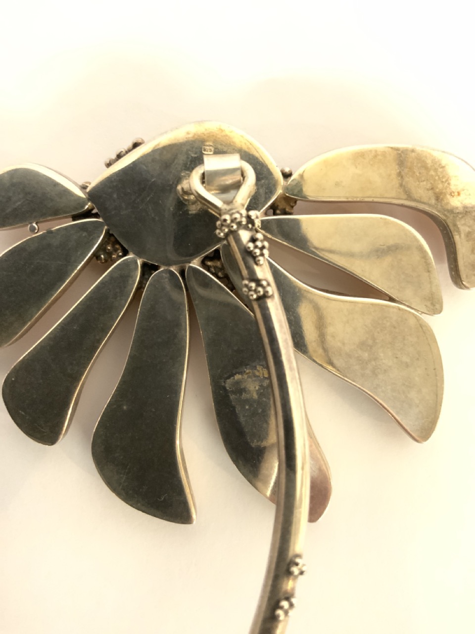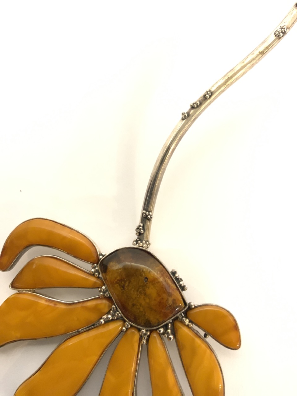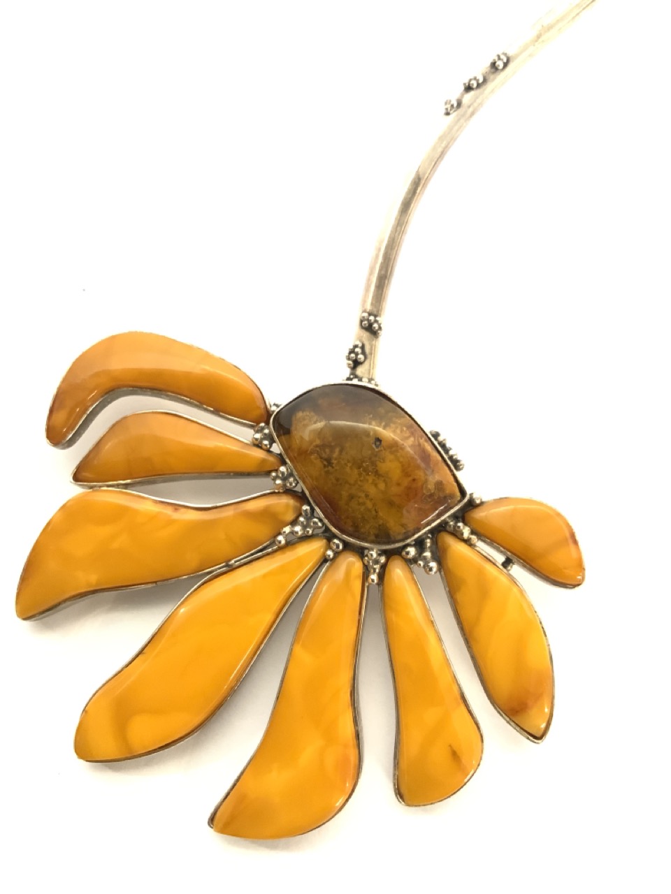 A sterling silver Amber open sided necklace. A large amber sunflower pendant with a 5 1/2" width.