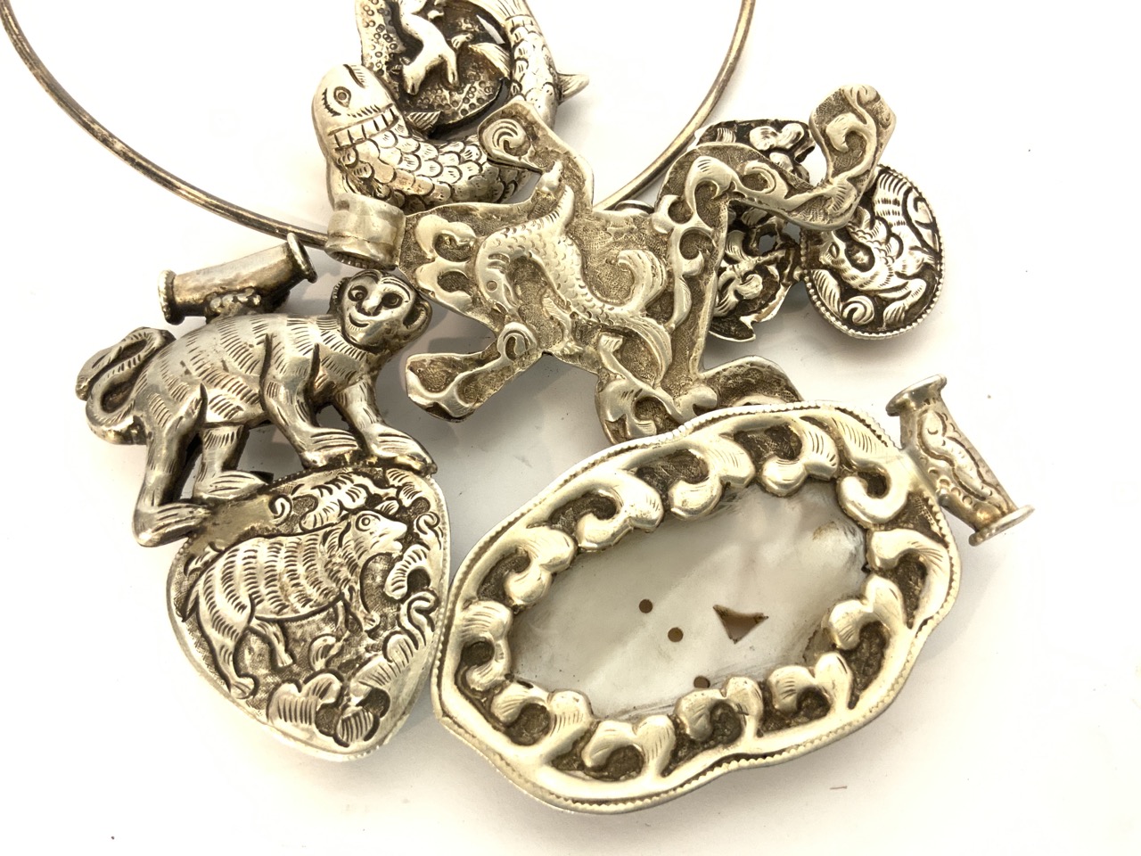 Five (5) Asian sterling silver oversized animal pendants turquoise, abalone, coral and malachite stones. Two monkeys, fish, frog and rabbit.