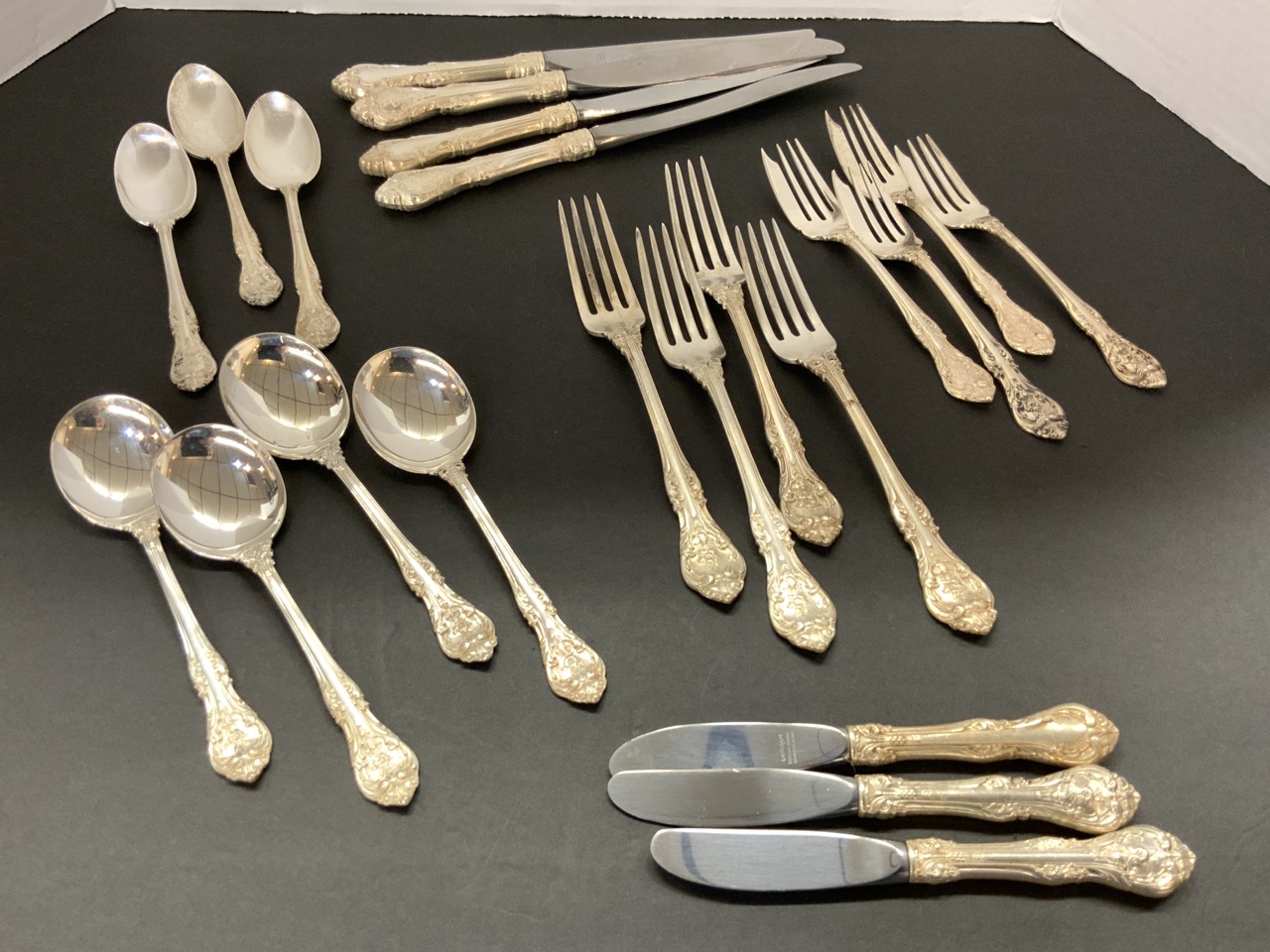 Twenty-Two (22) piece King Edward by Gorham sterling silver flatware assorted. Not complede. No monogram.