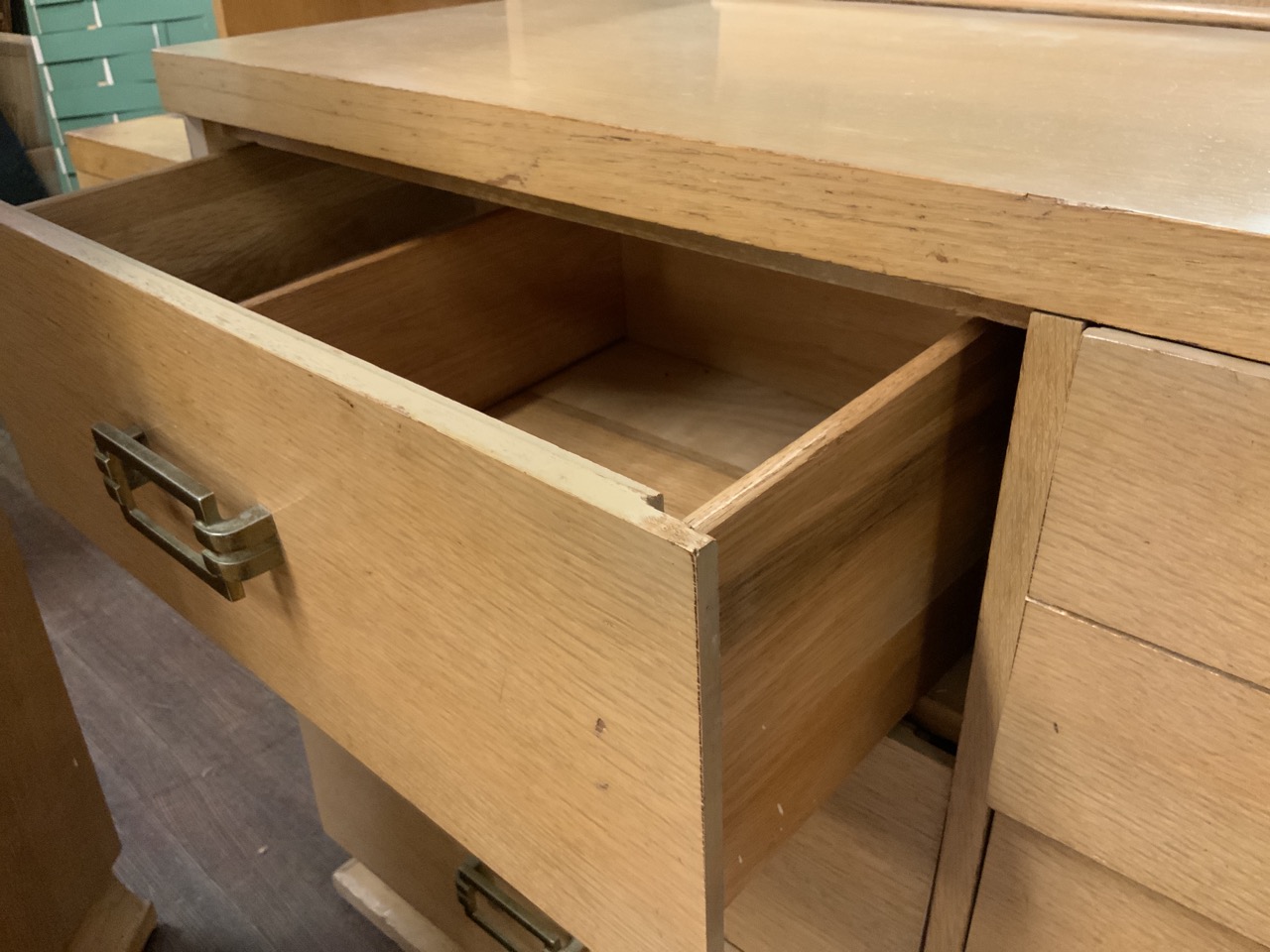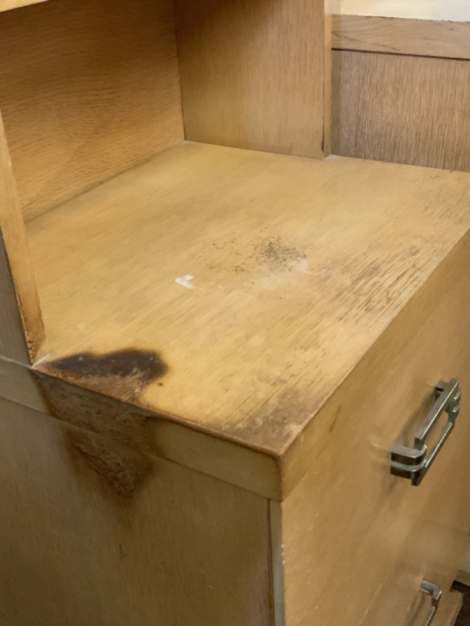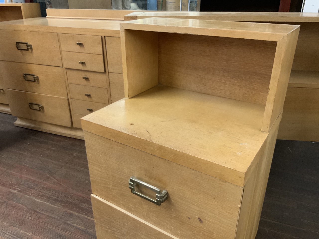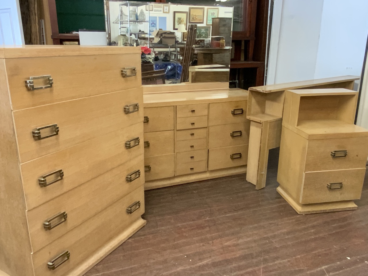 A Mid Century Modern bedroom set. Dresser with mirror, bureau, two nightstands and full size bed. Restoration needed. Heavy staining to one nightstand.