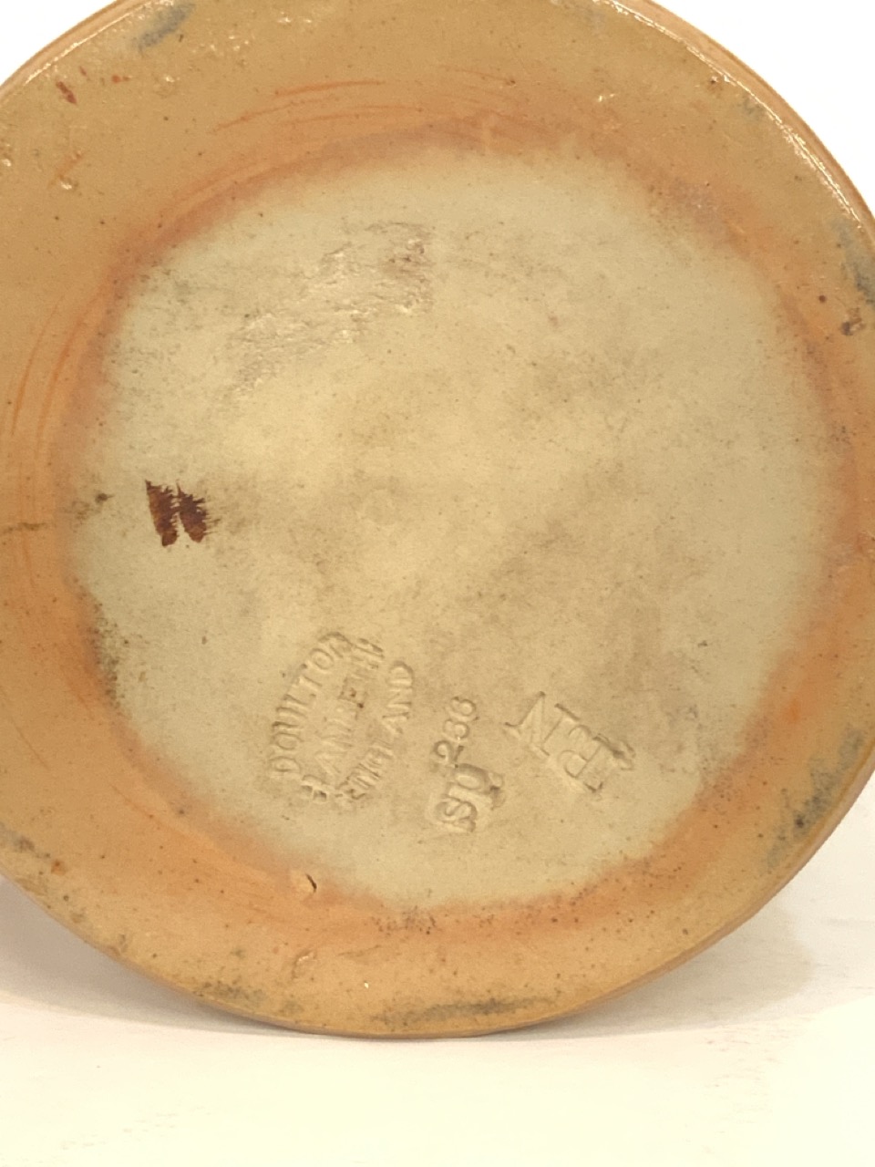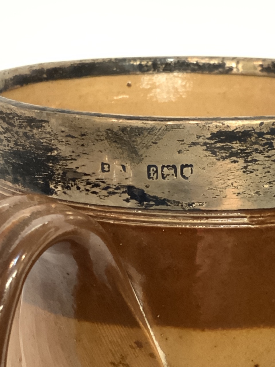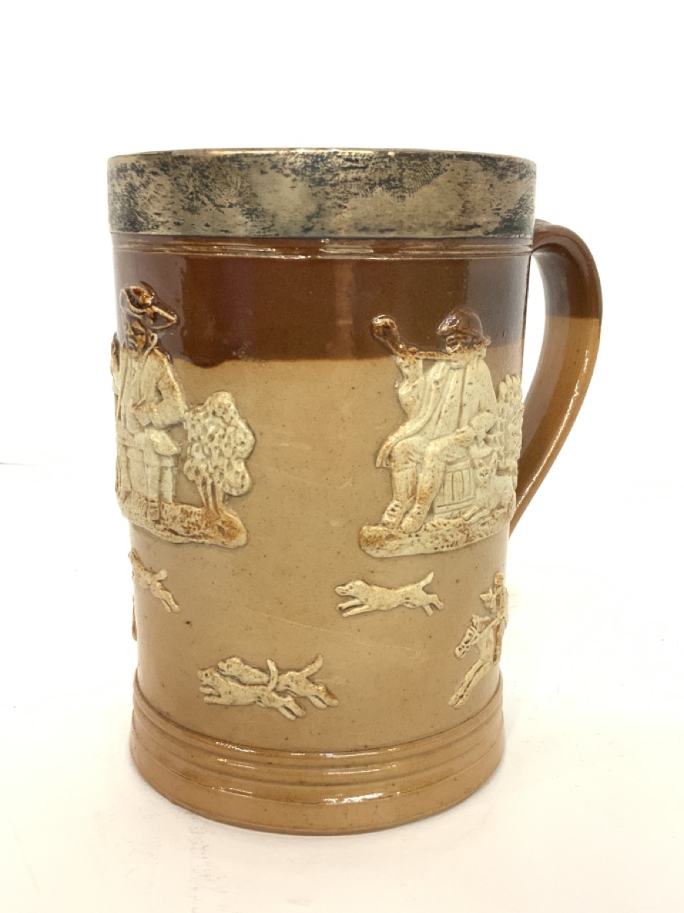 Doulton Lambeth tankard with sterling silver mounted rim.