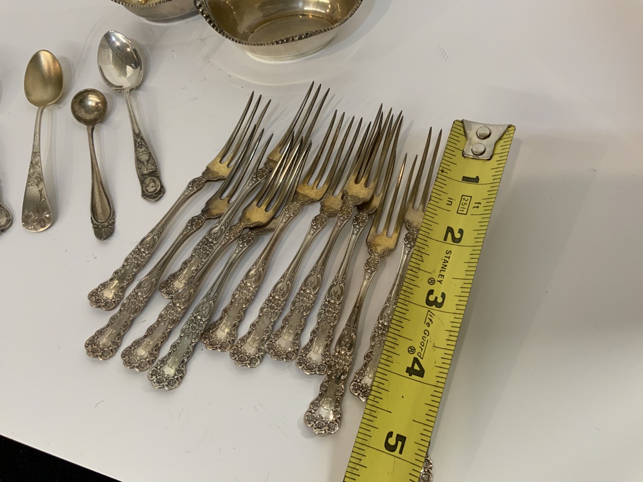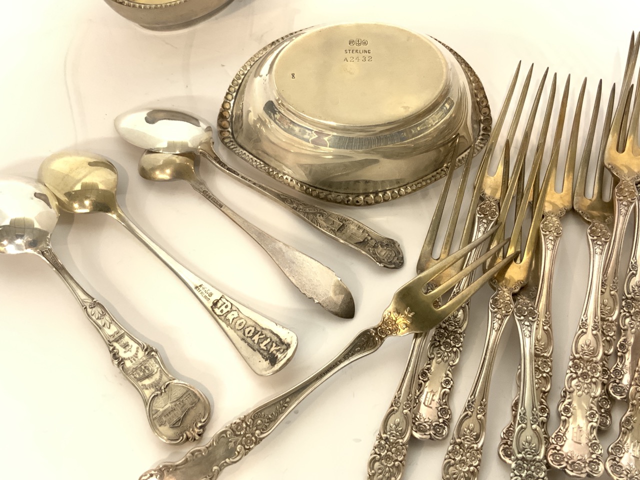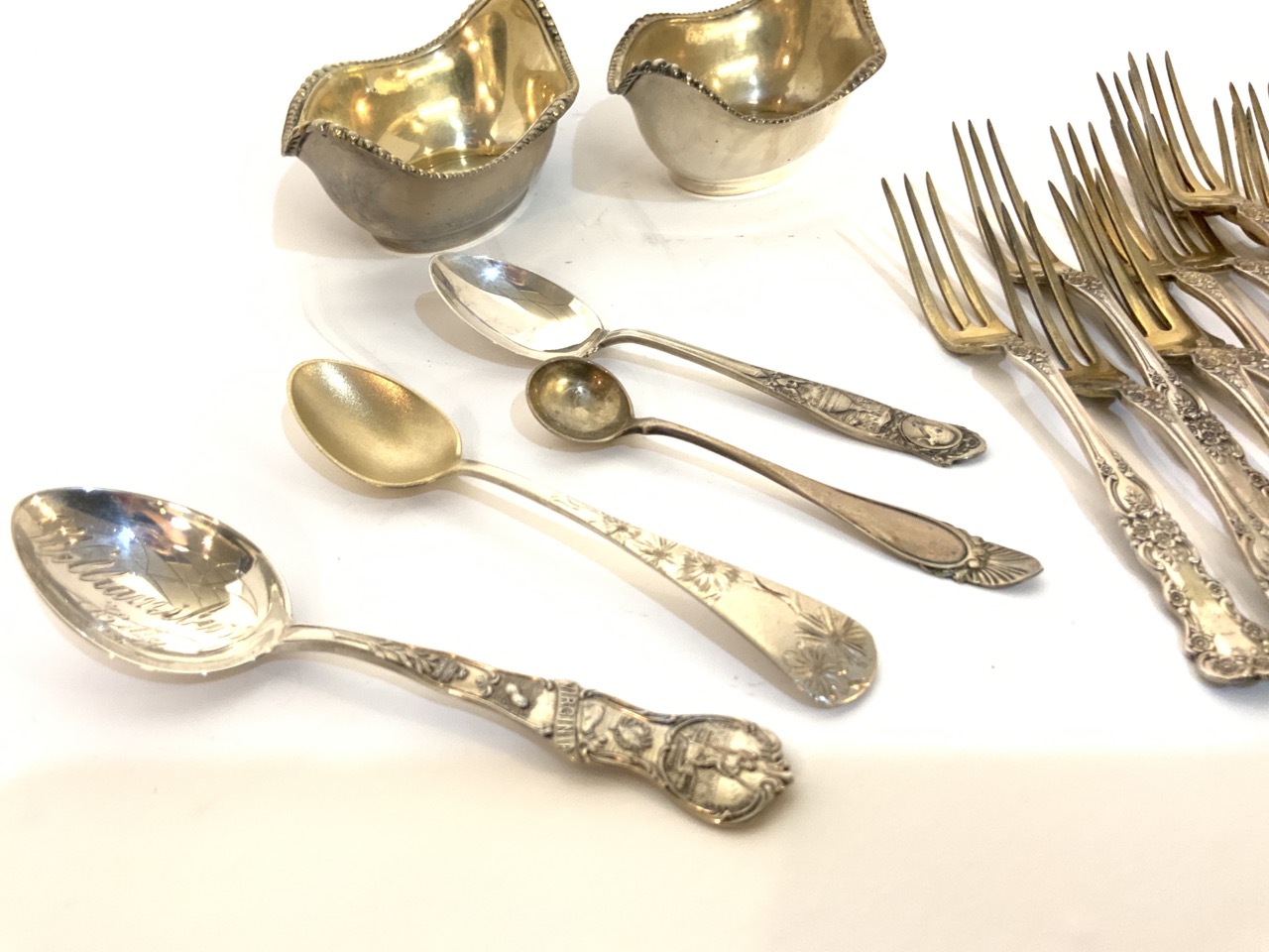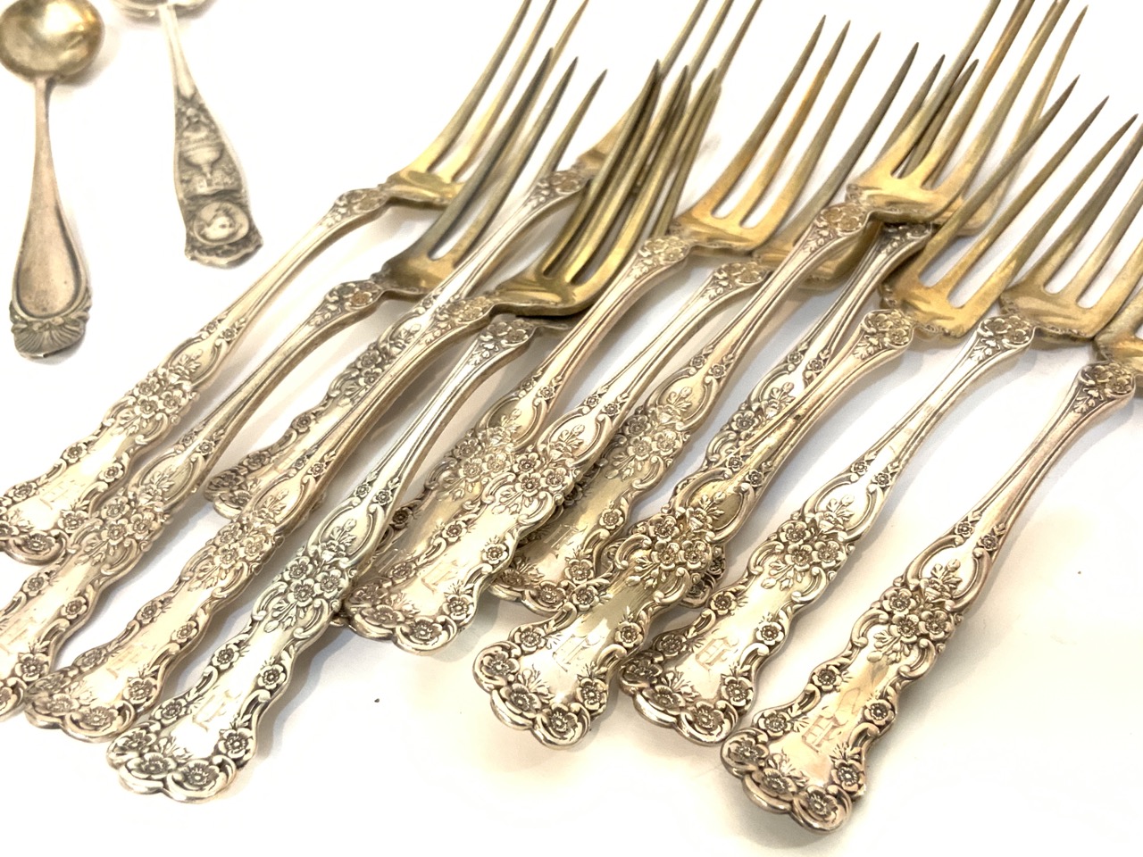 Compiled estate sterling silver flatware with Gorham salts and pickle forks service.