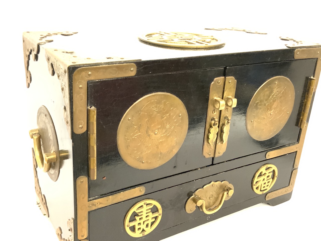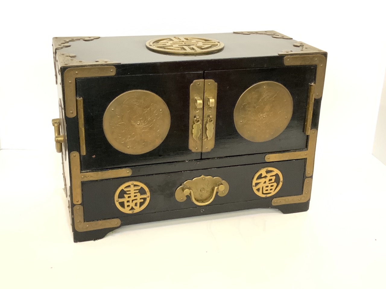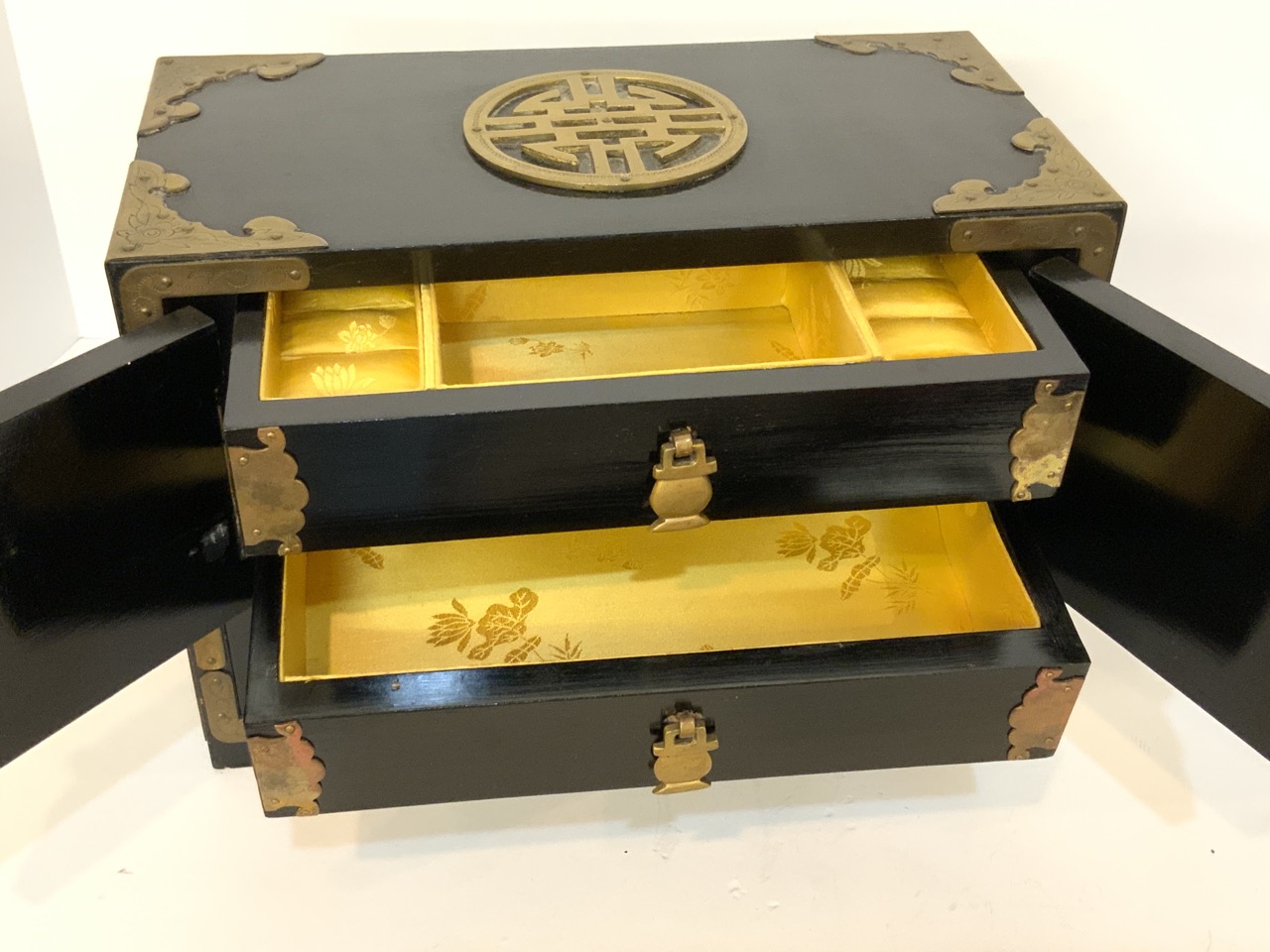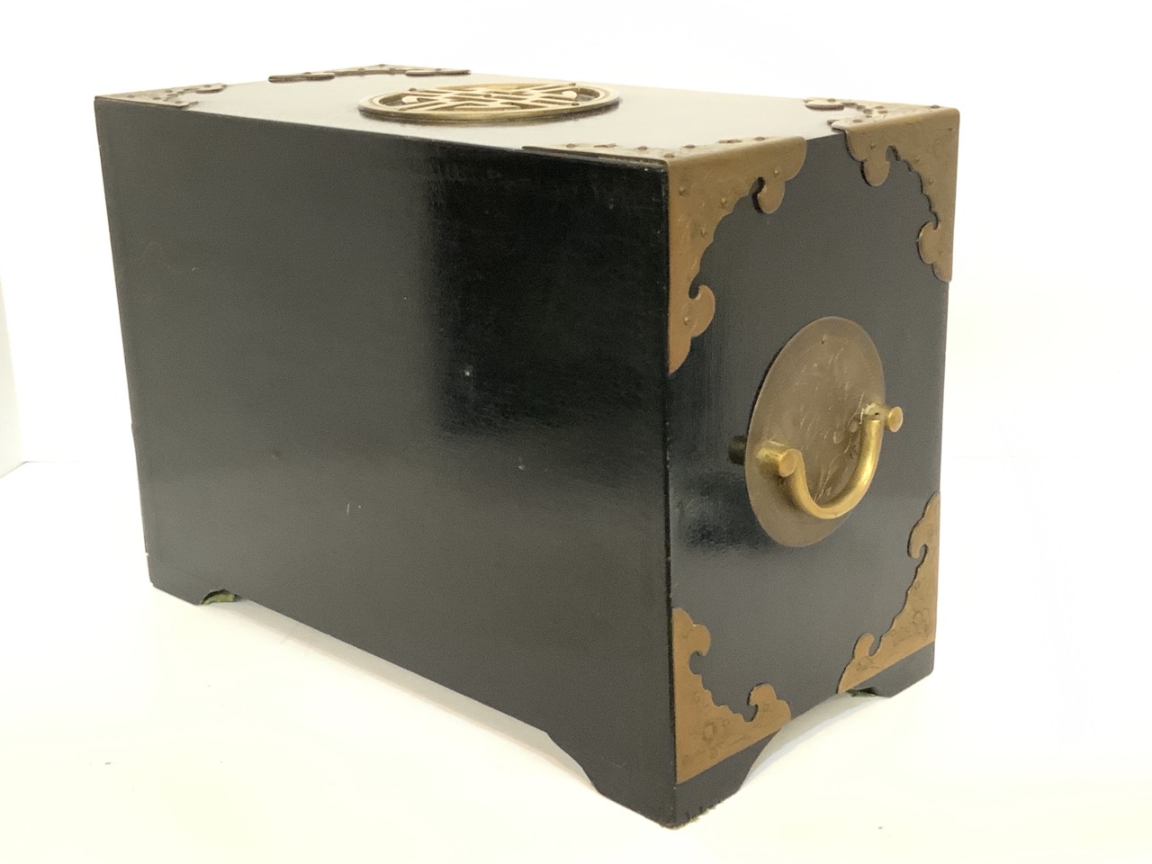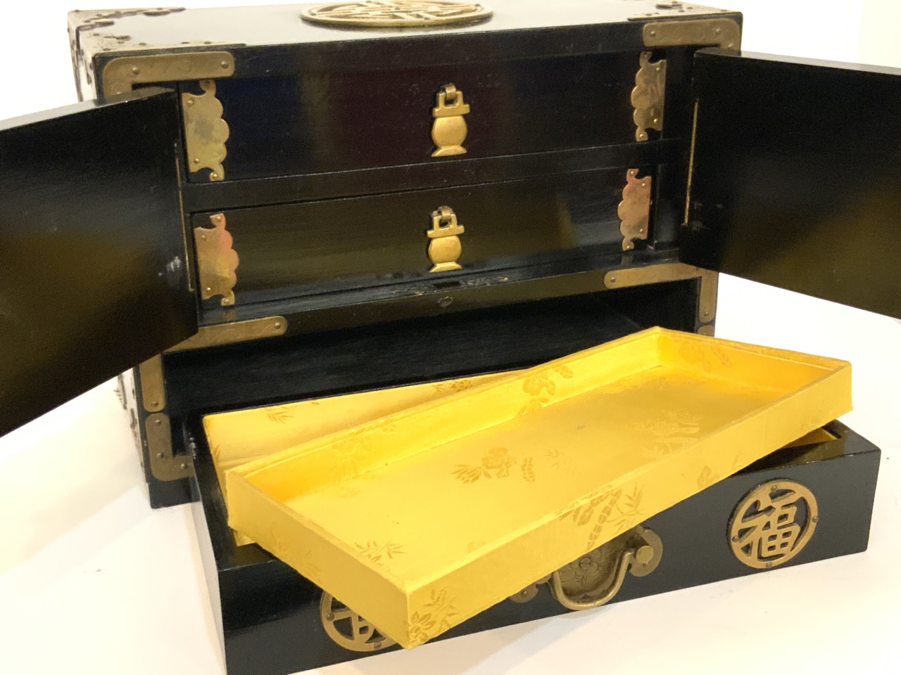 A fine antique Chinese ebonized wood with brass jewelry box. Yellow silk lining. Very fine. Missing lock.