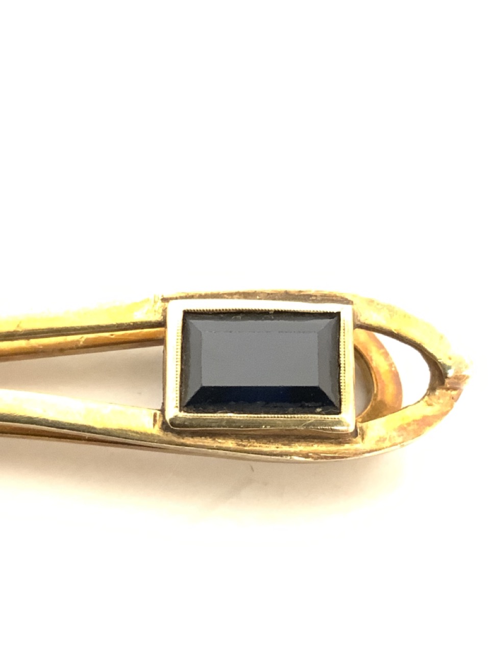 14k gold sapphire men's tie clip. Fine heavy gold clip with emerald cut blue sapphire.