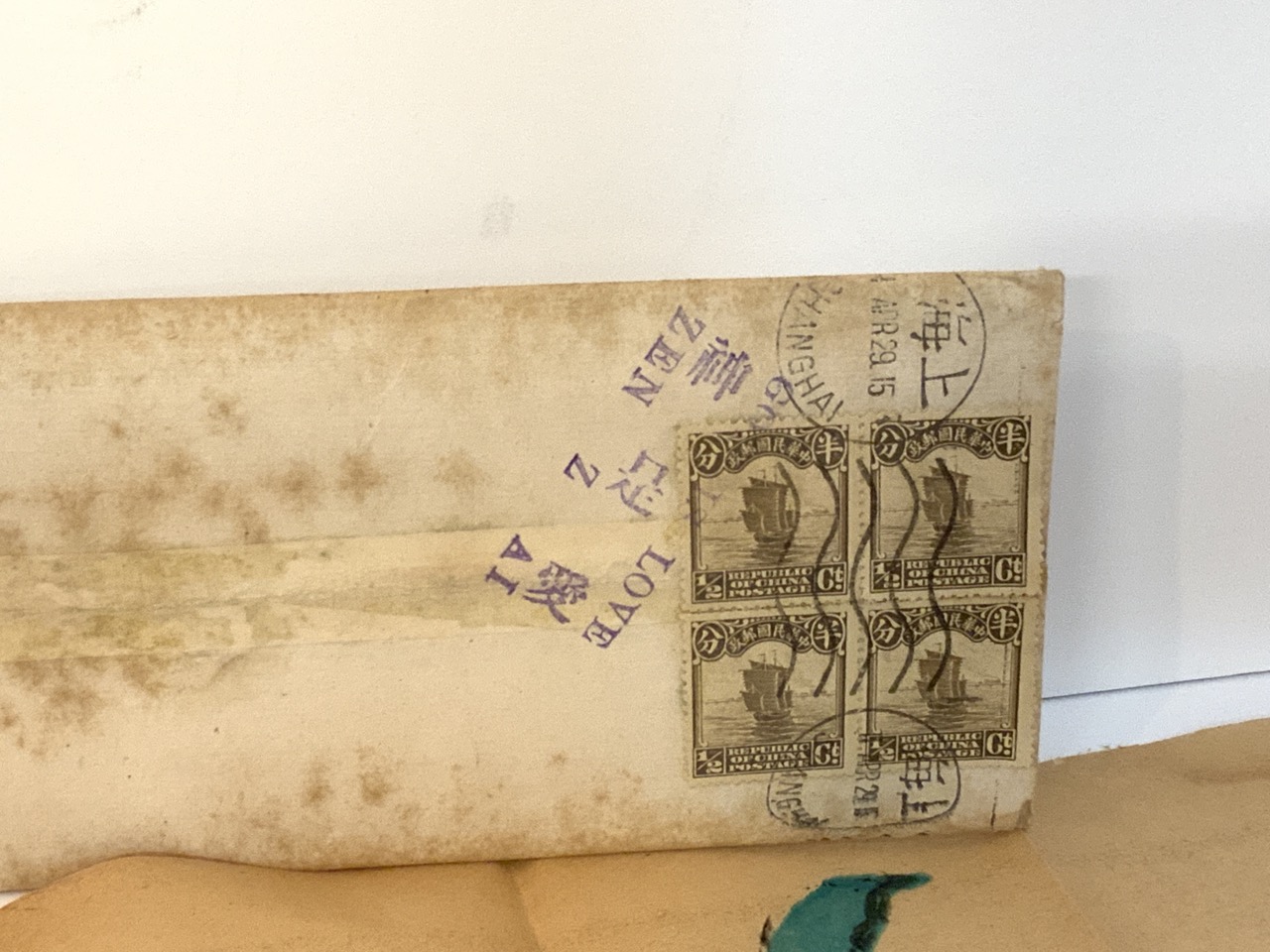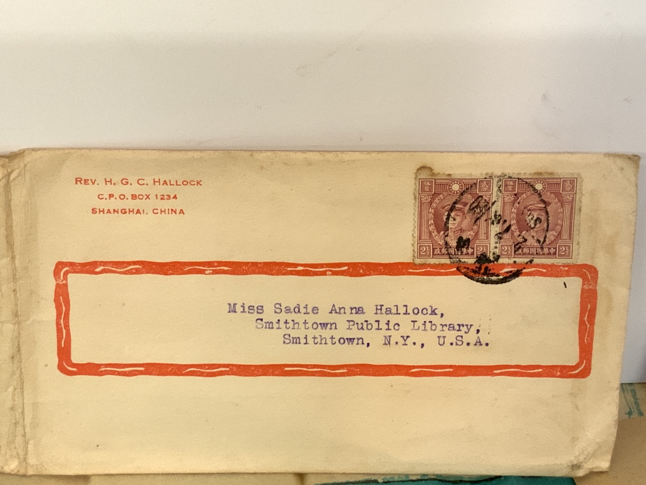 Two c.1915 Mailed Chinese prints from Missionary Reverend H.G.C. Hallock to his cousin Miss Sadie Hallock of Smithtown, NY. Chinese postmarked stamp envelopes noted.