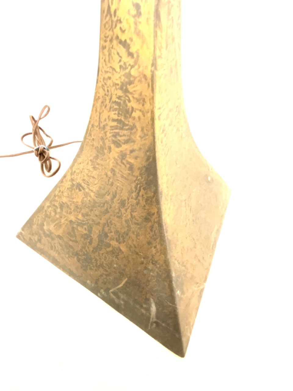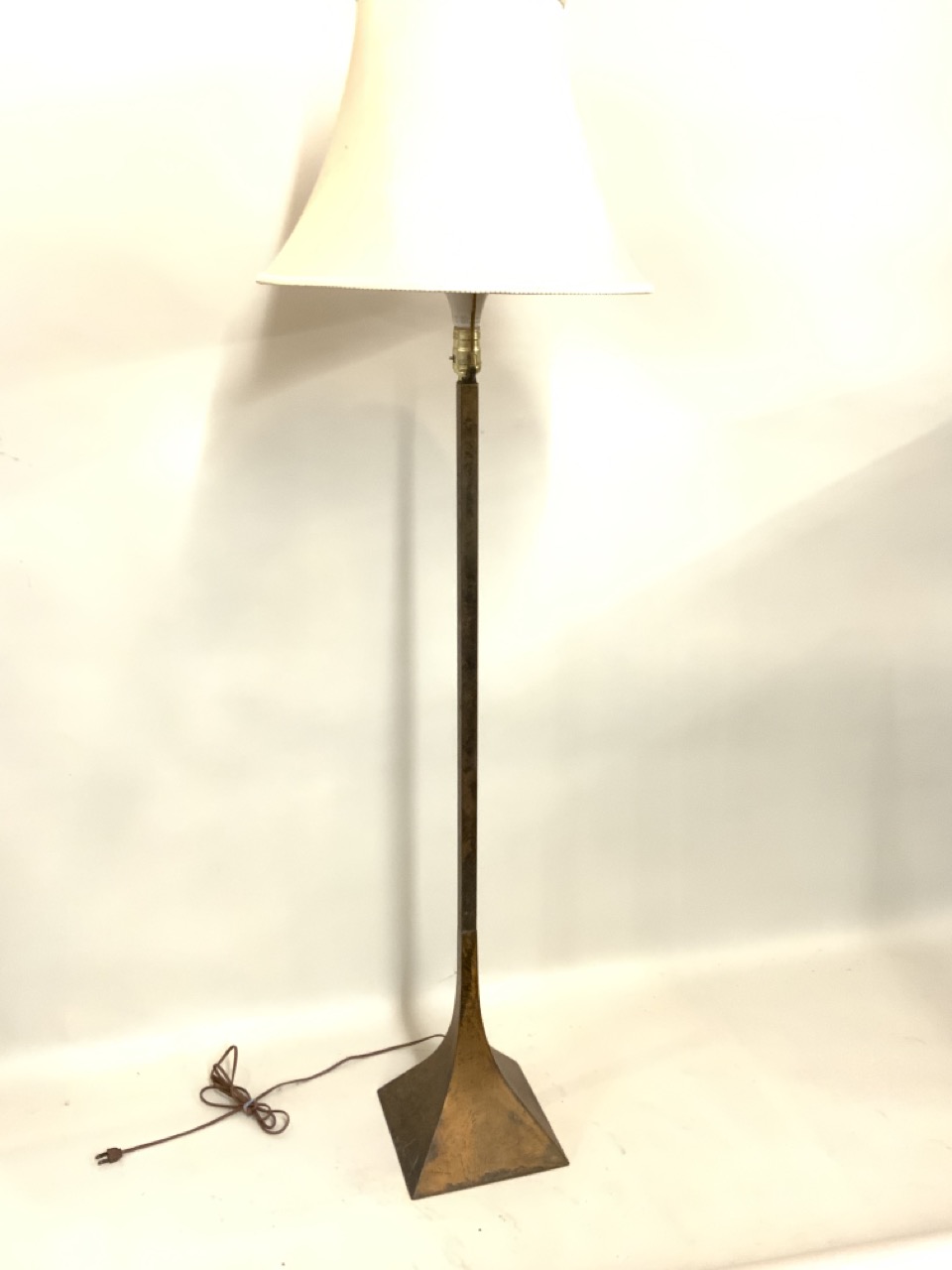A distressed metal floor lamp.