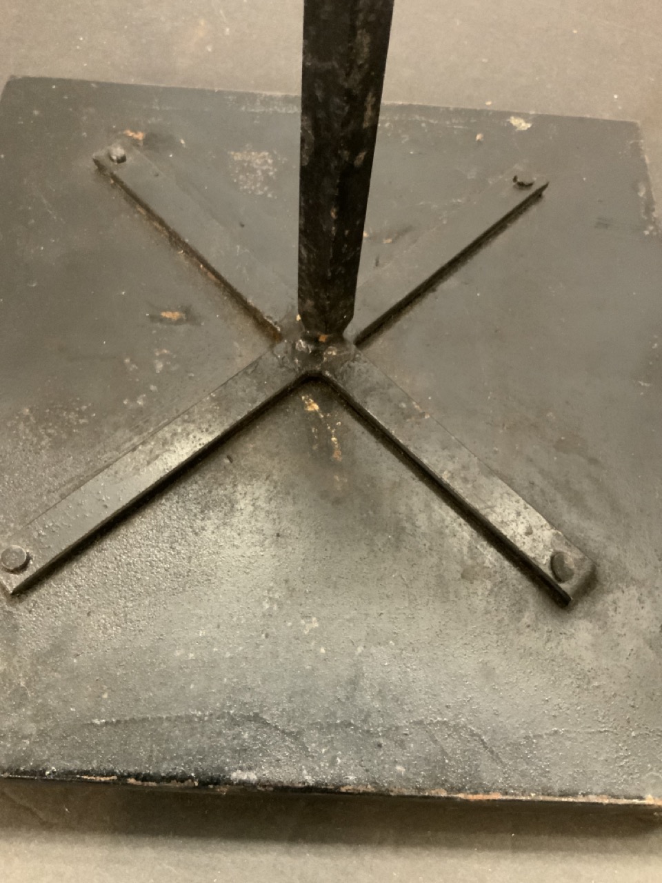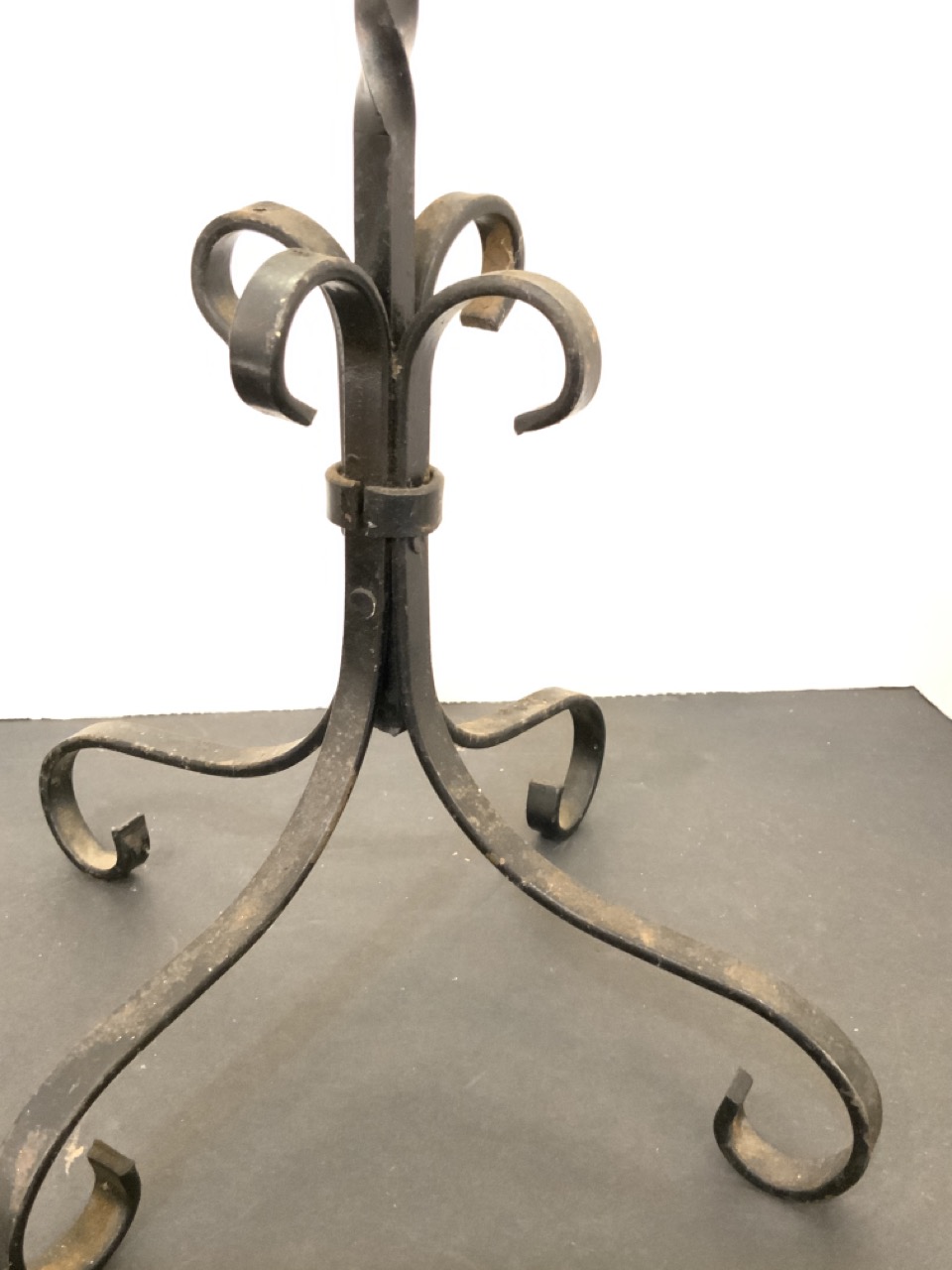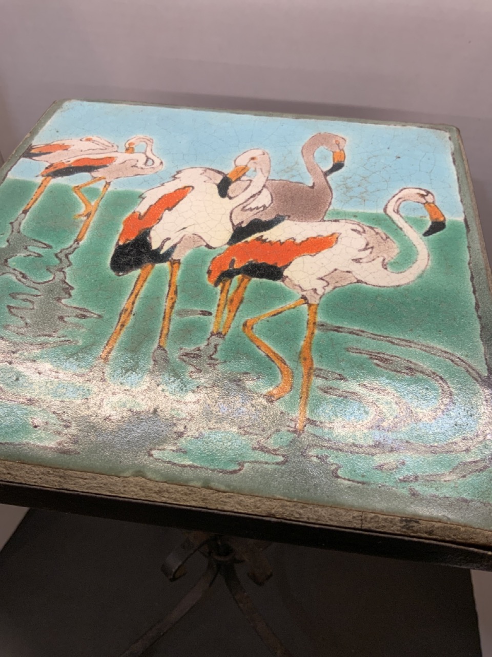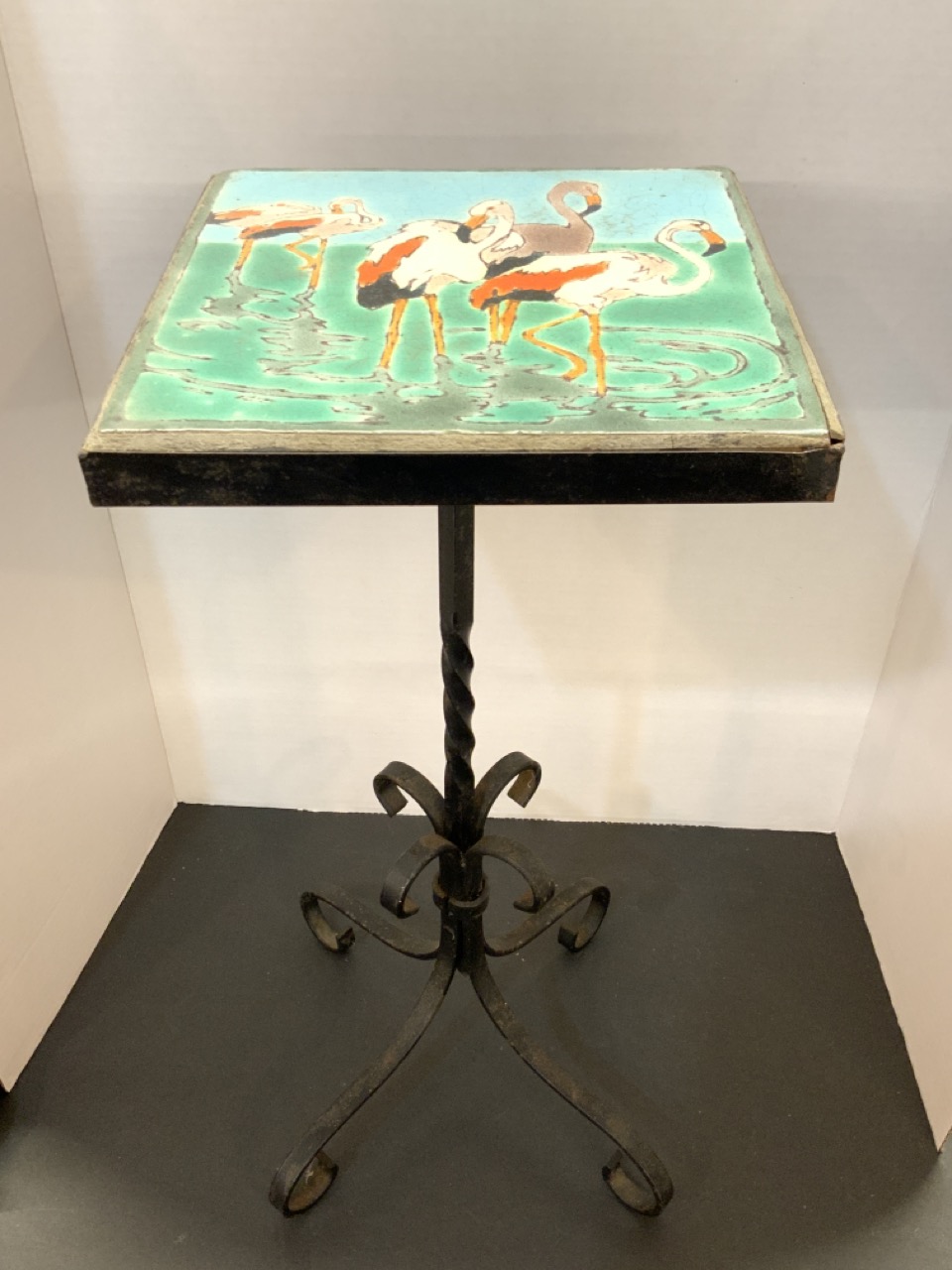 California tile top table with pink flamingos set in iron base.
