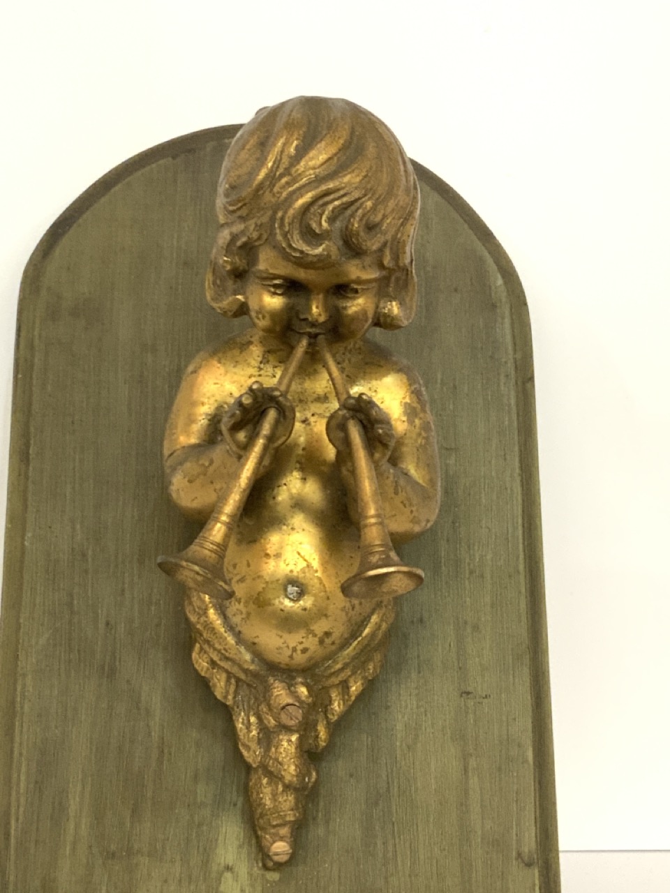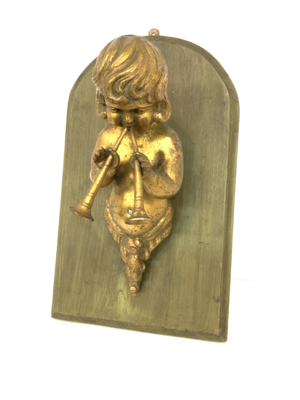 A solid bronze architectural flute player mounted on pine board for display.