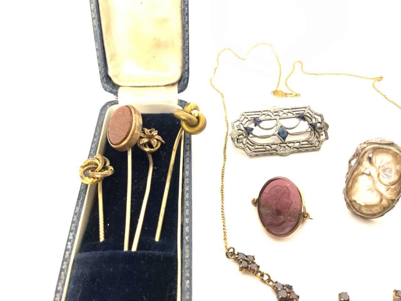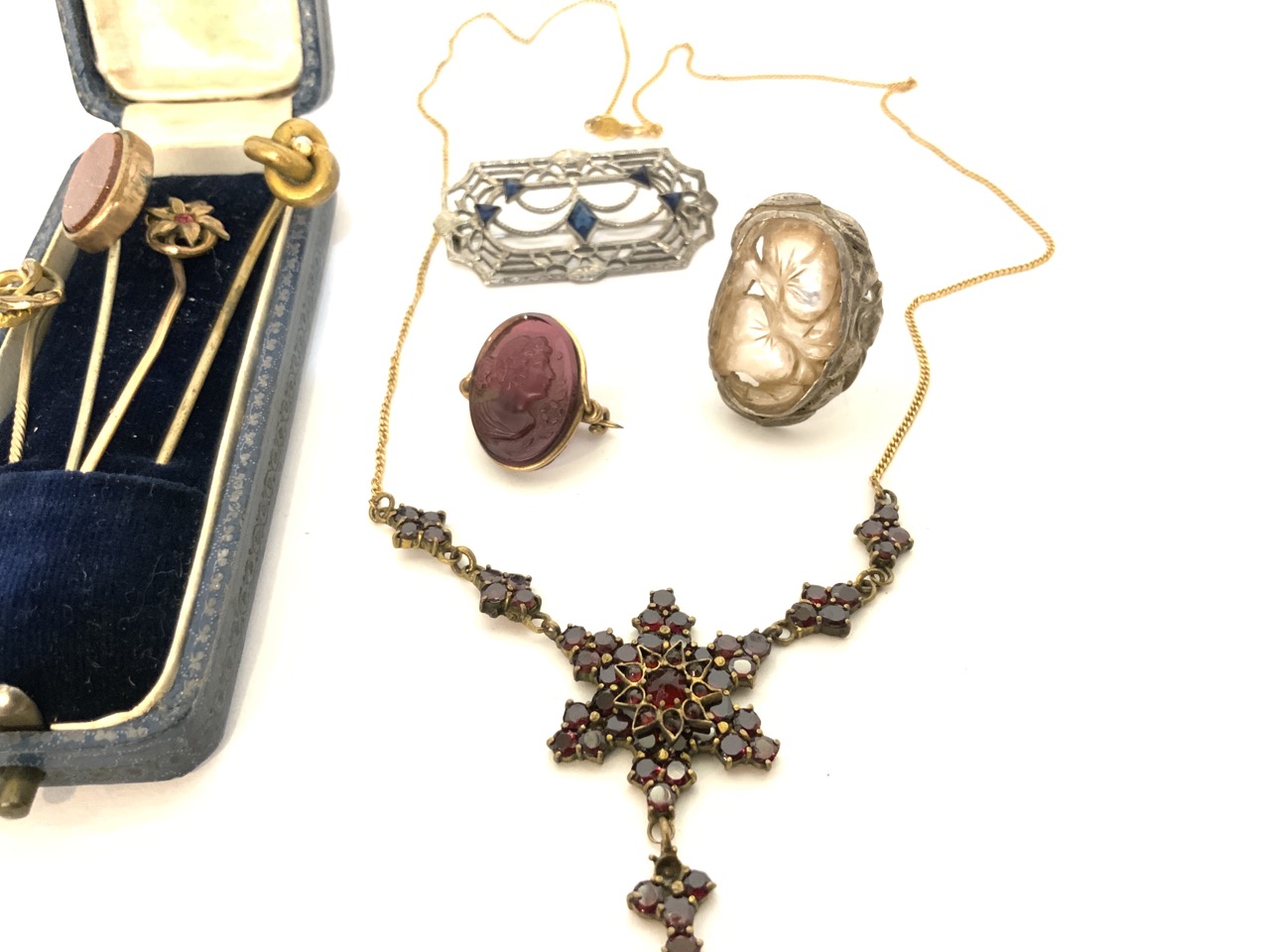 Mixed estate jewelry including stick pins, Bohemian garnet necklace with 14k y.g. chain, sterling sapphire pin etc. Please see photograph preview or call.