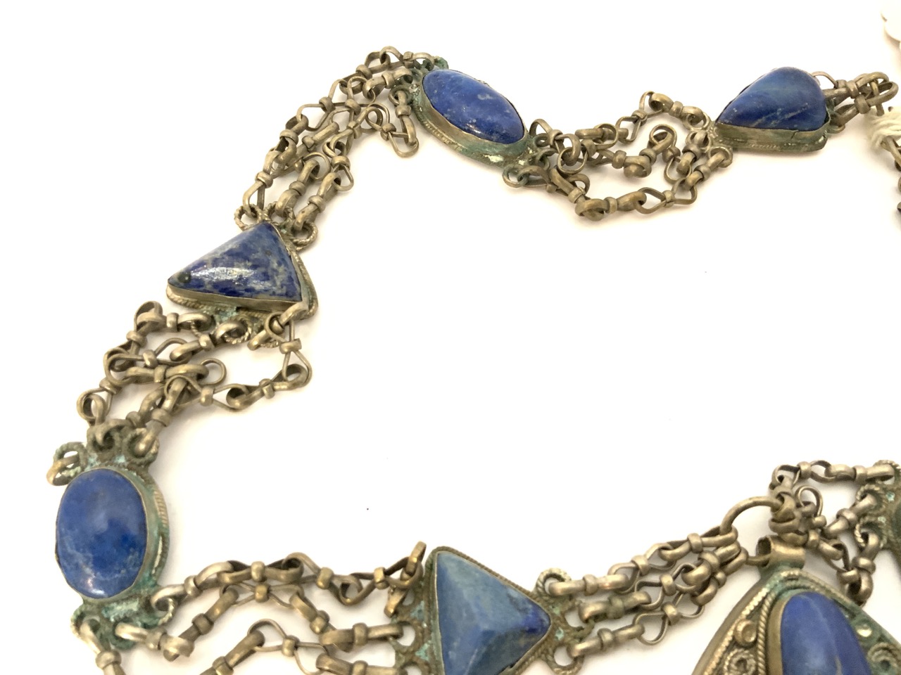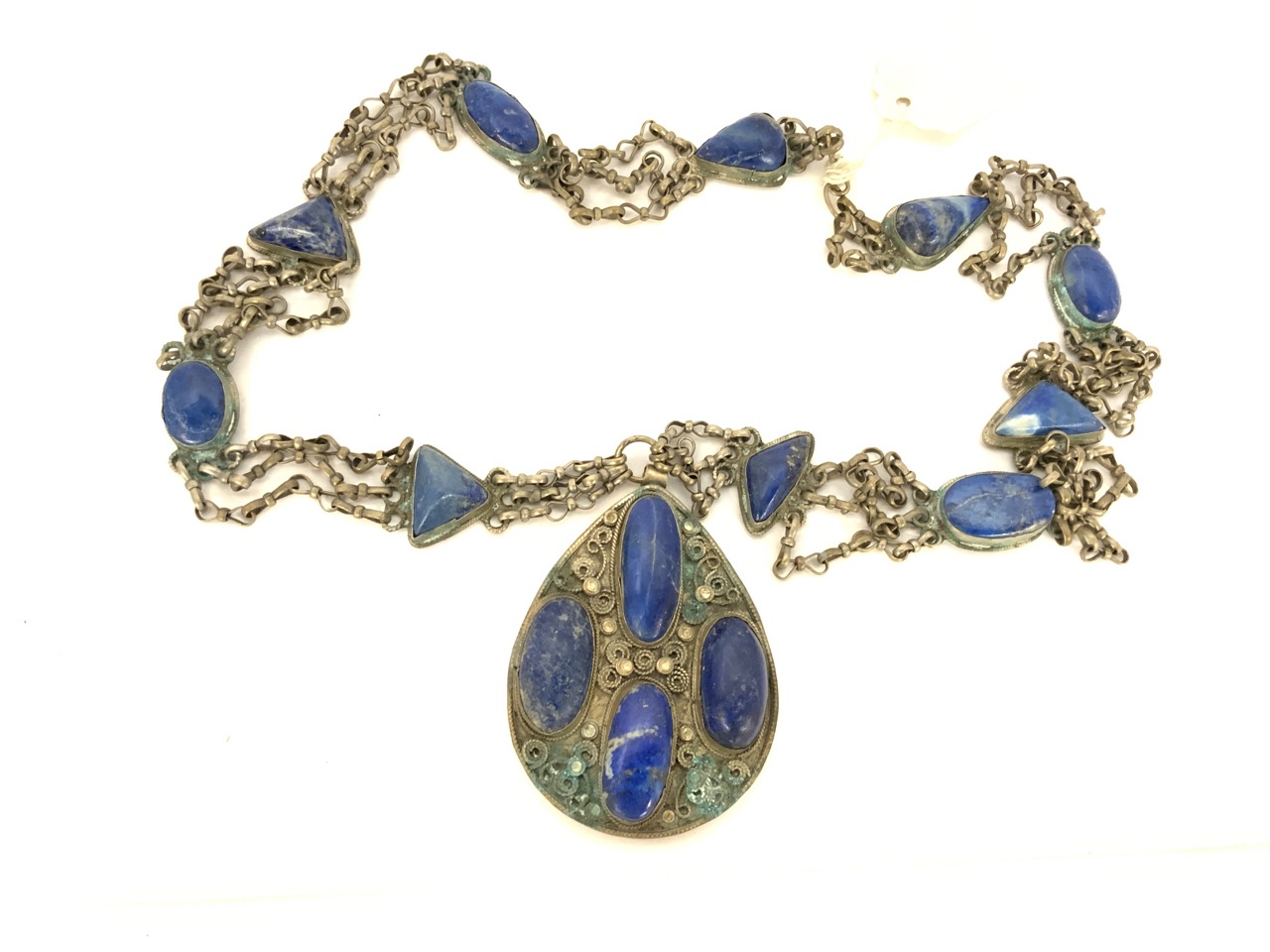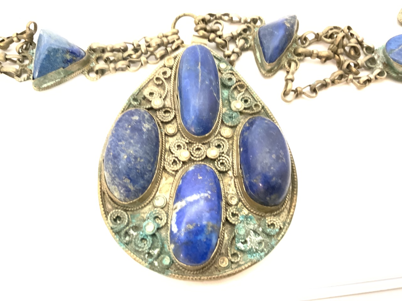 A large Afghan Lapis Lazulli stone necklace. Some metal corrosion noted. Stones are very good and large sizes.