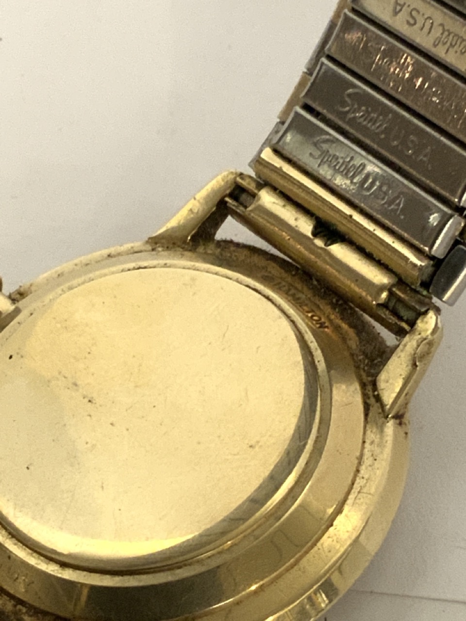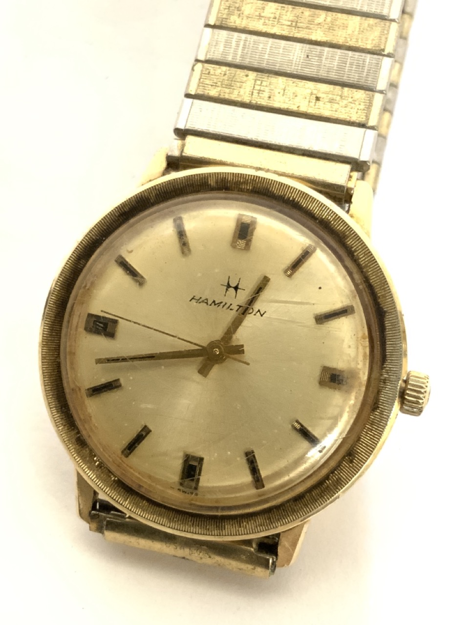 14k yellow gold Hamilton watch. Art Deco style with stainless band. The watch was not inspected however is running and keeping time. 14k yellow gold frame and backing.