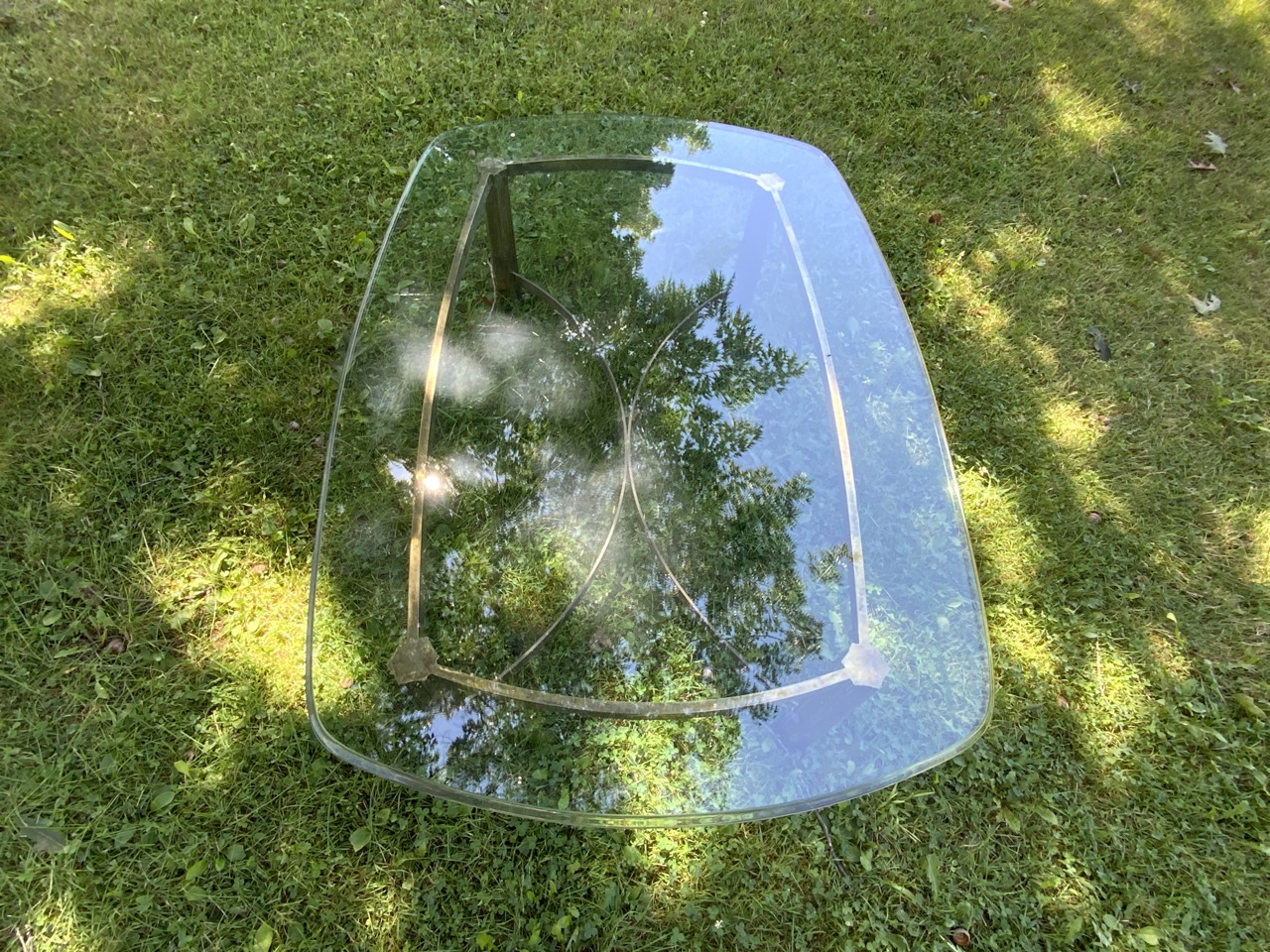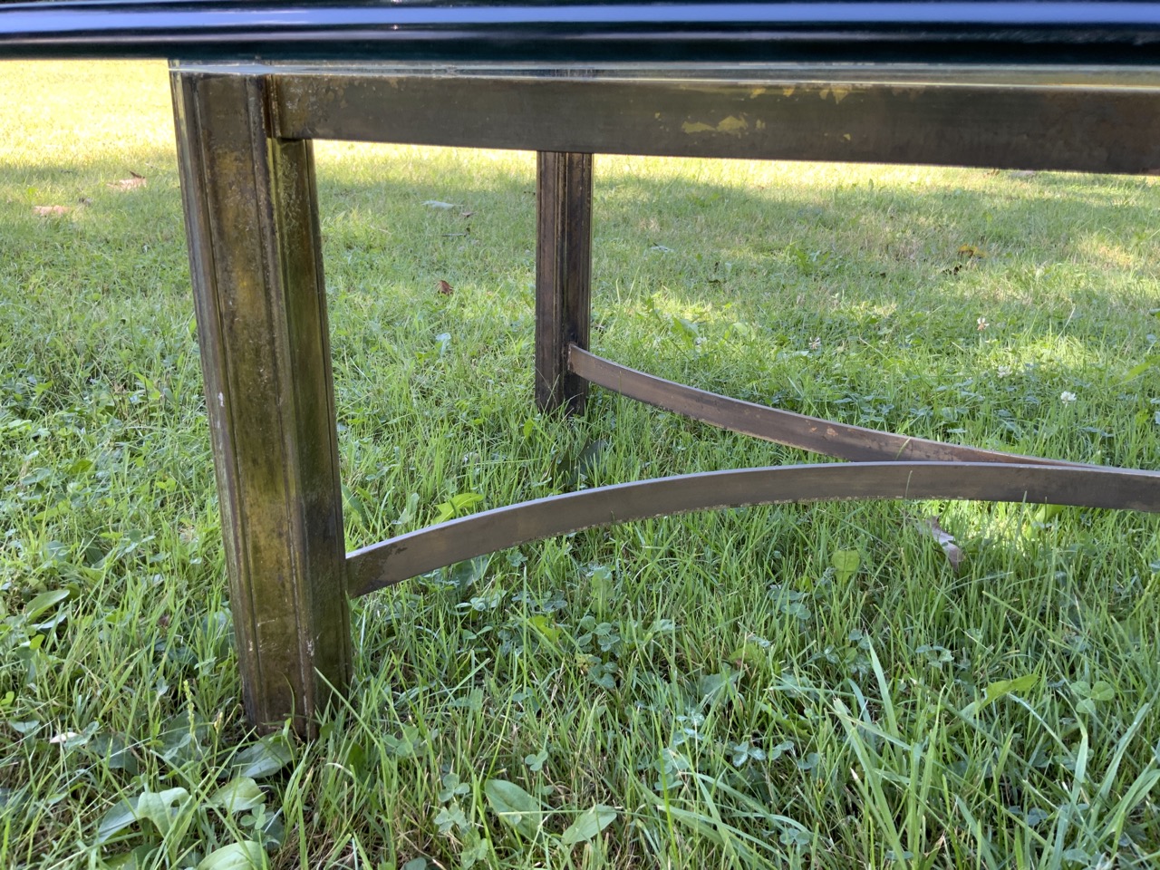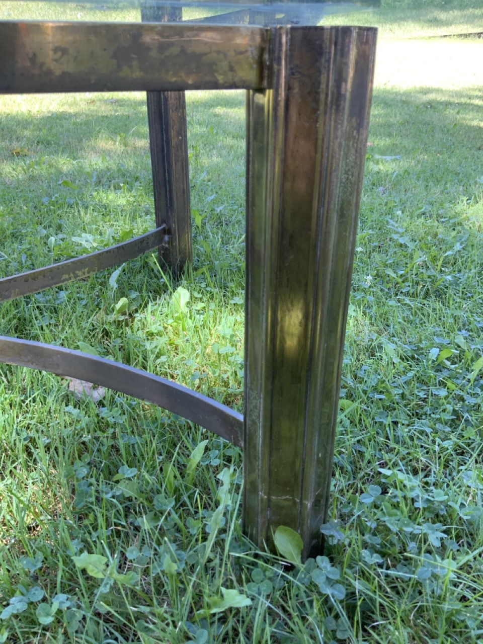 1970's glass top coffee table with iron brass base.