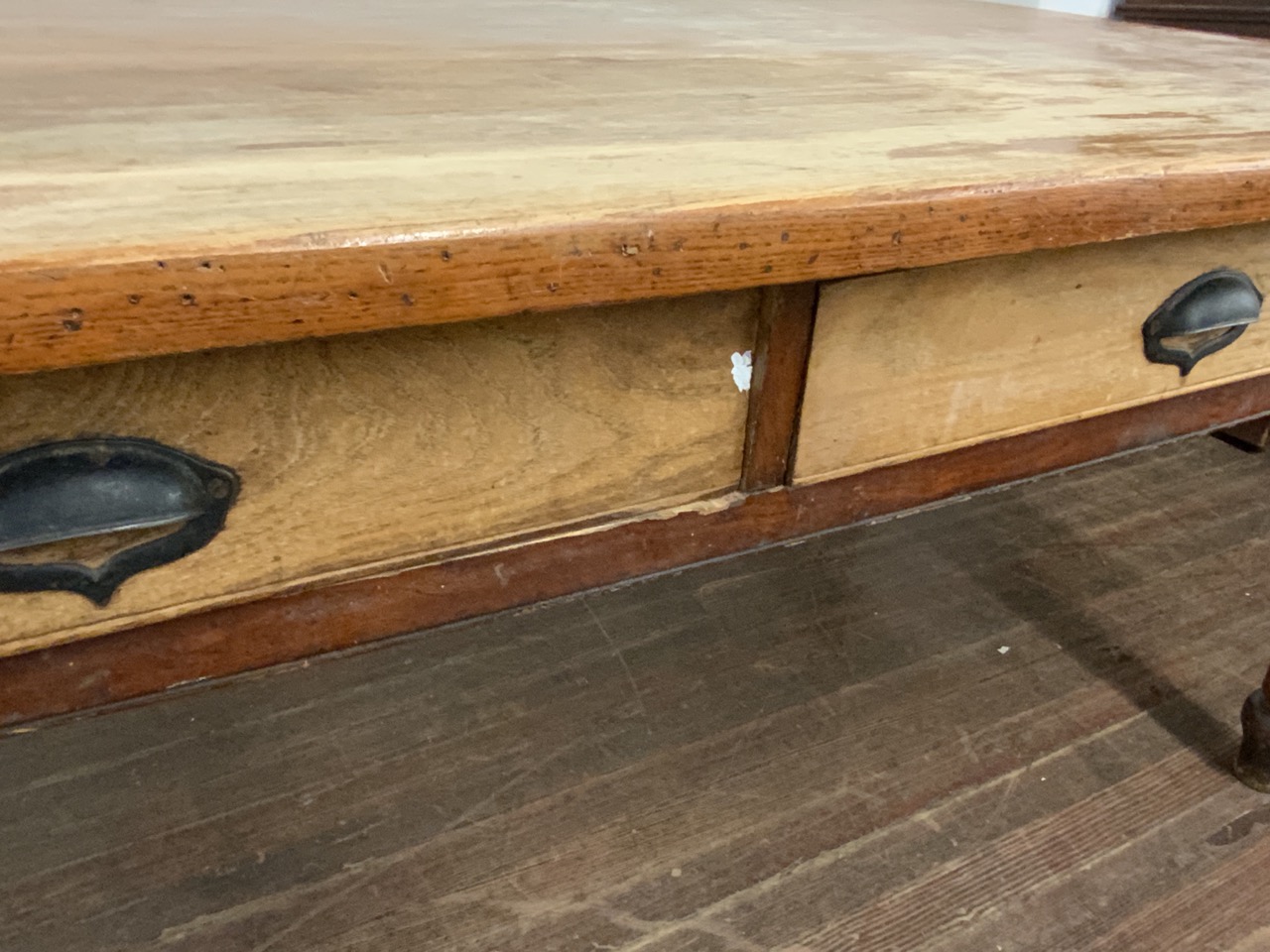 Base is currently being reinforced with newer screws. Restoration to strengthen base back up is needed. Top and drawers are heavy and are getting too much for the base. Amazing table and well worth the work.