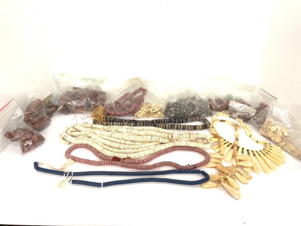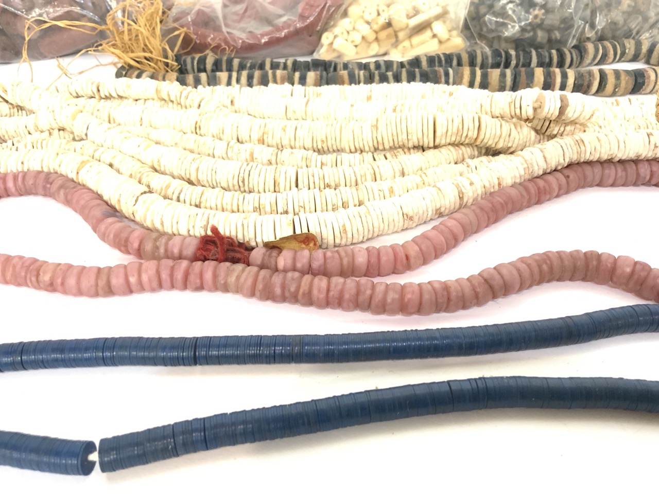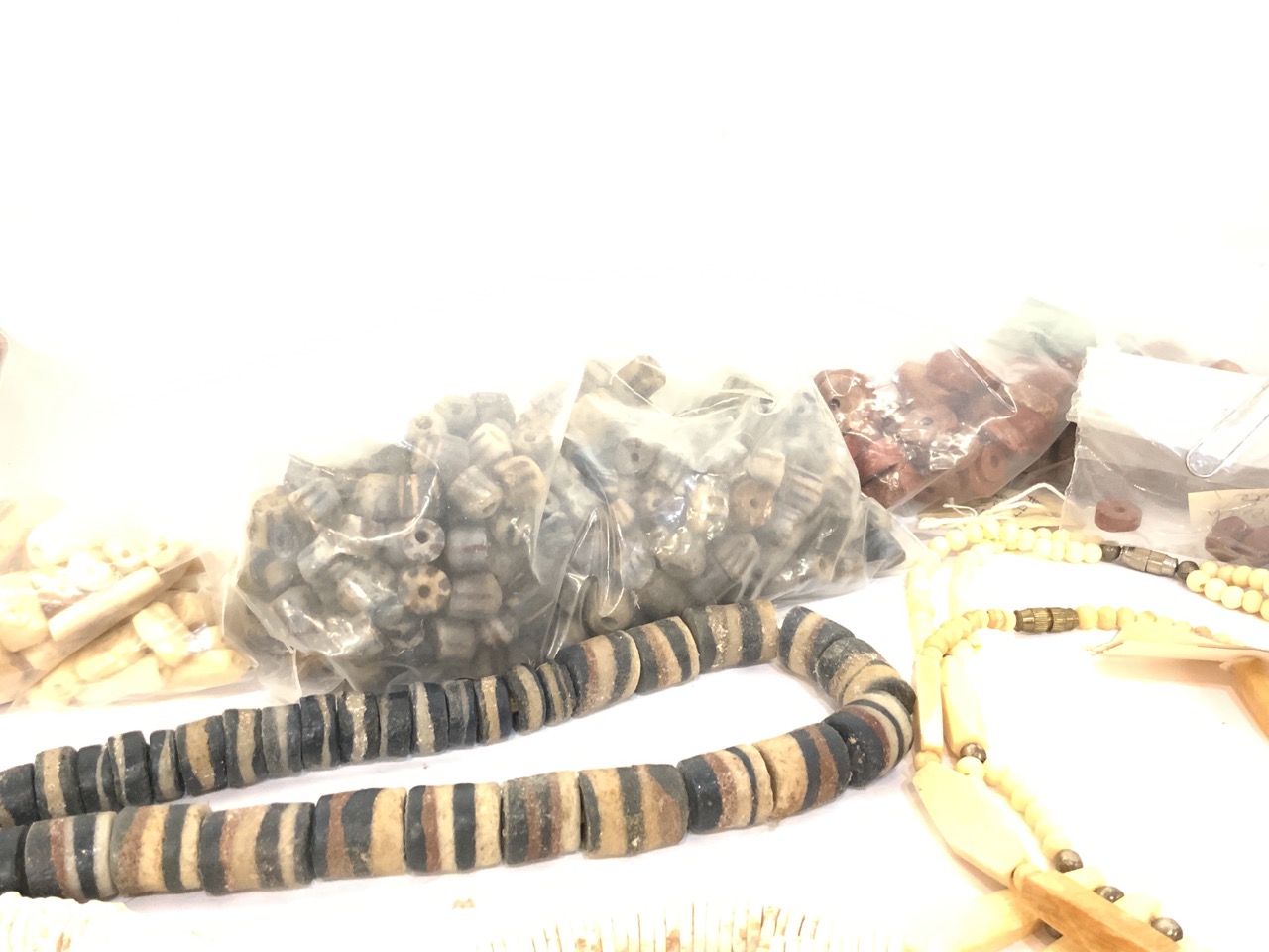 Compiled groupins of African trade bead strands and necklaces. As seen in photograph preview.
