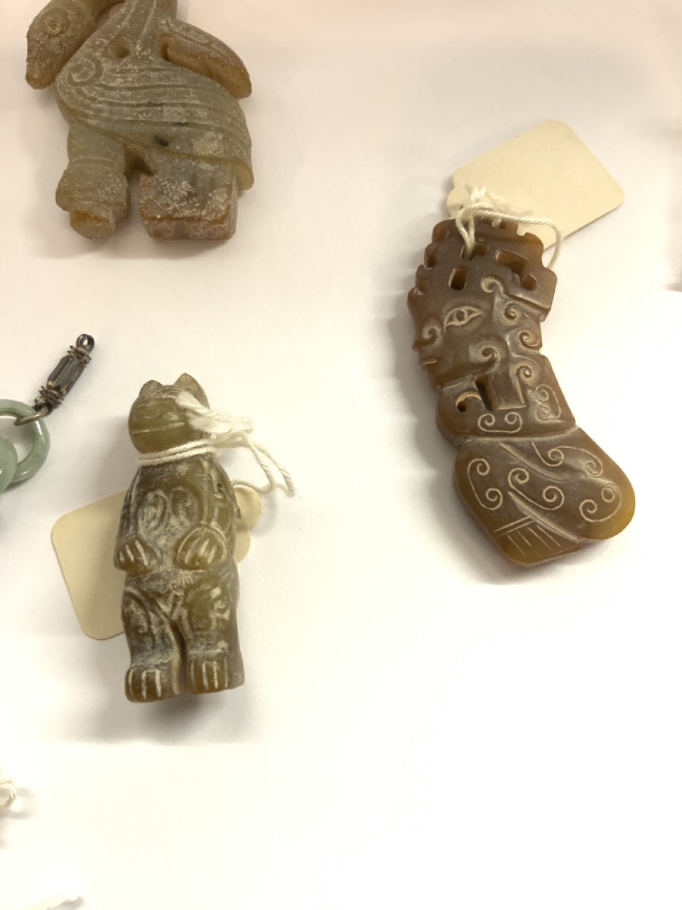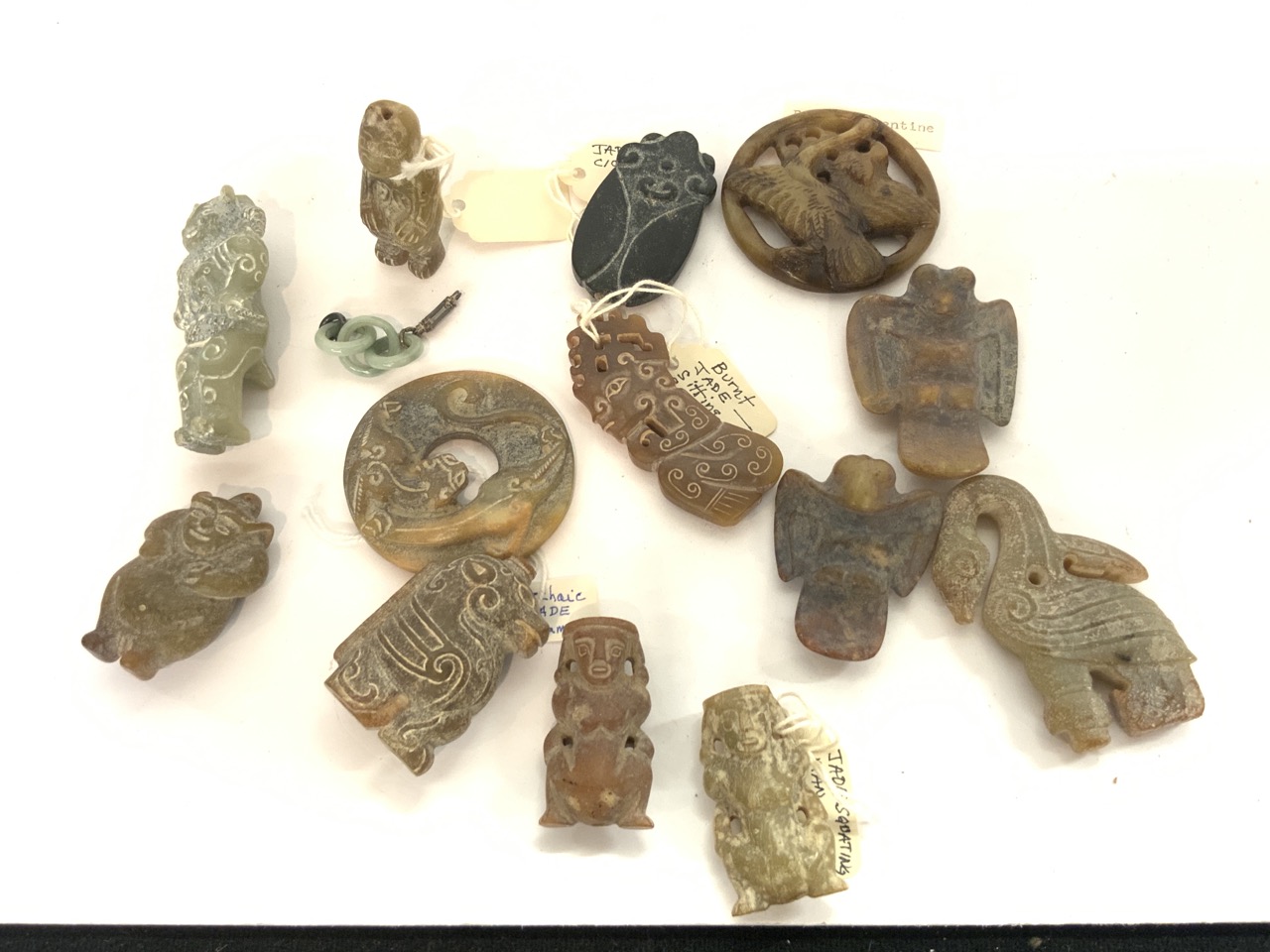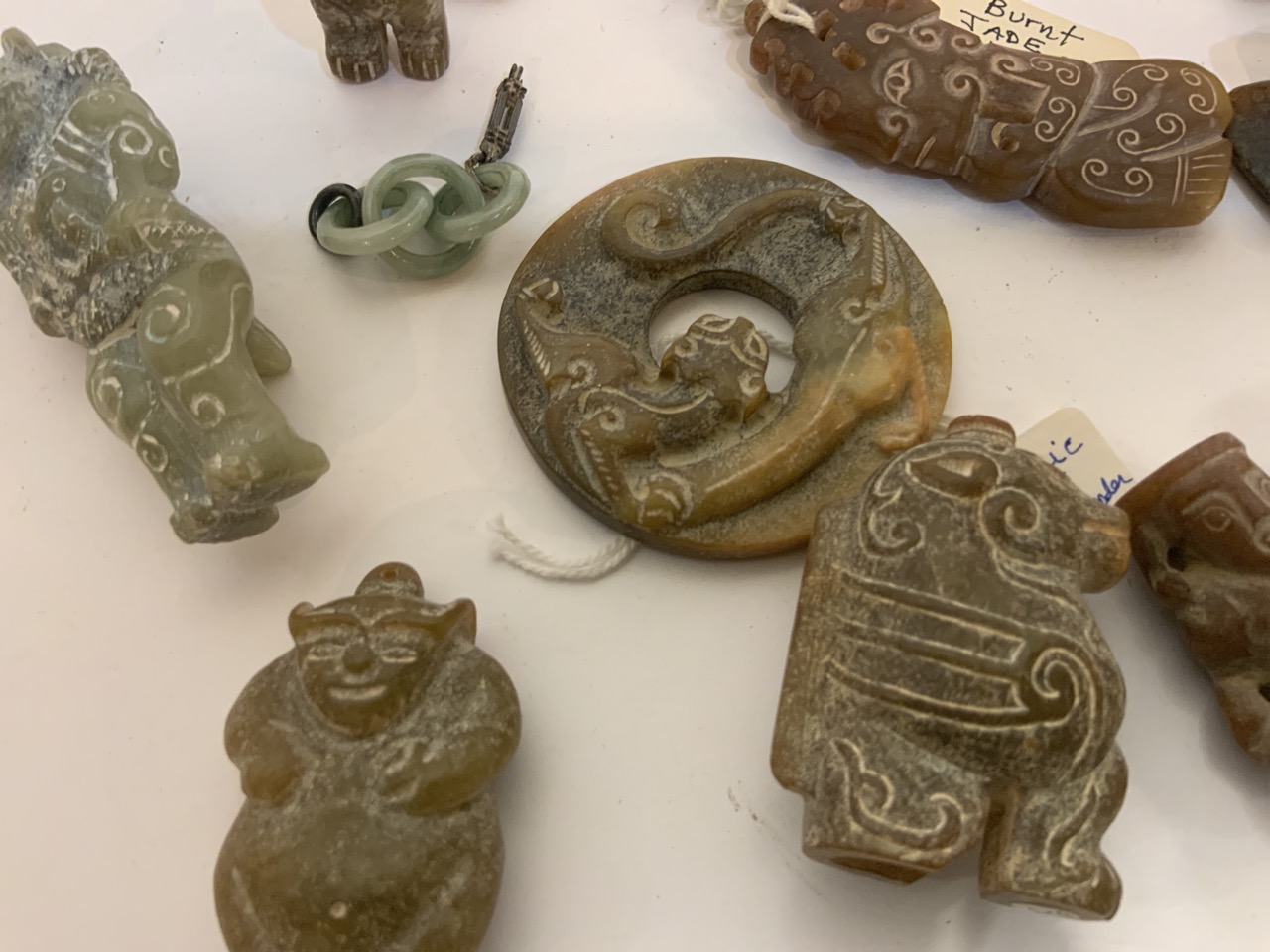 Brown serpentine, flat jade cicada, jade standing cat, animals etc.