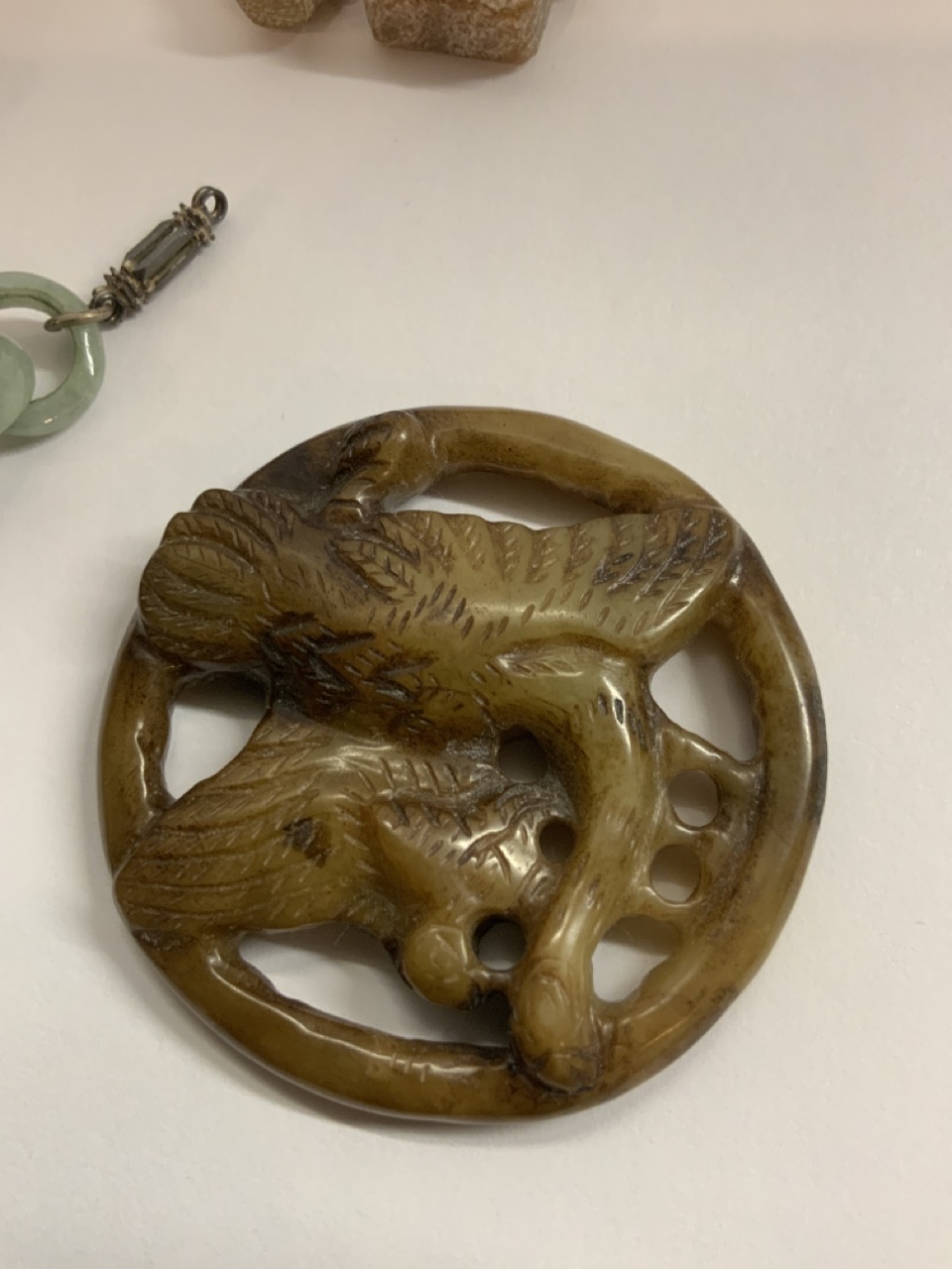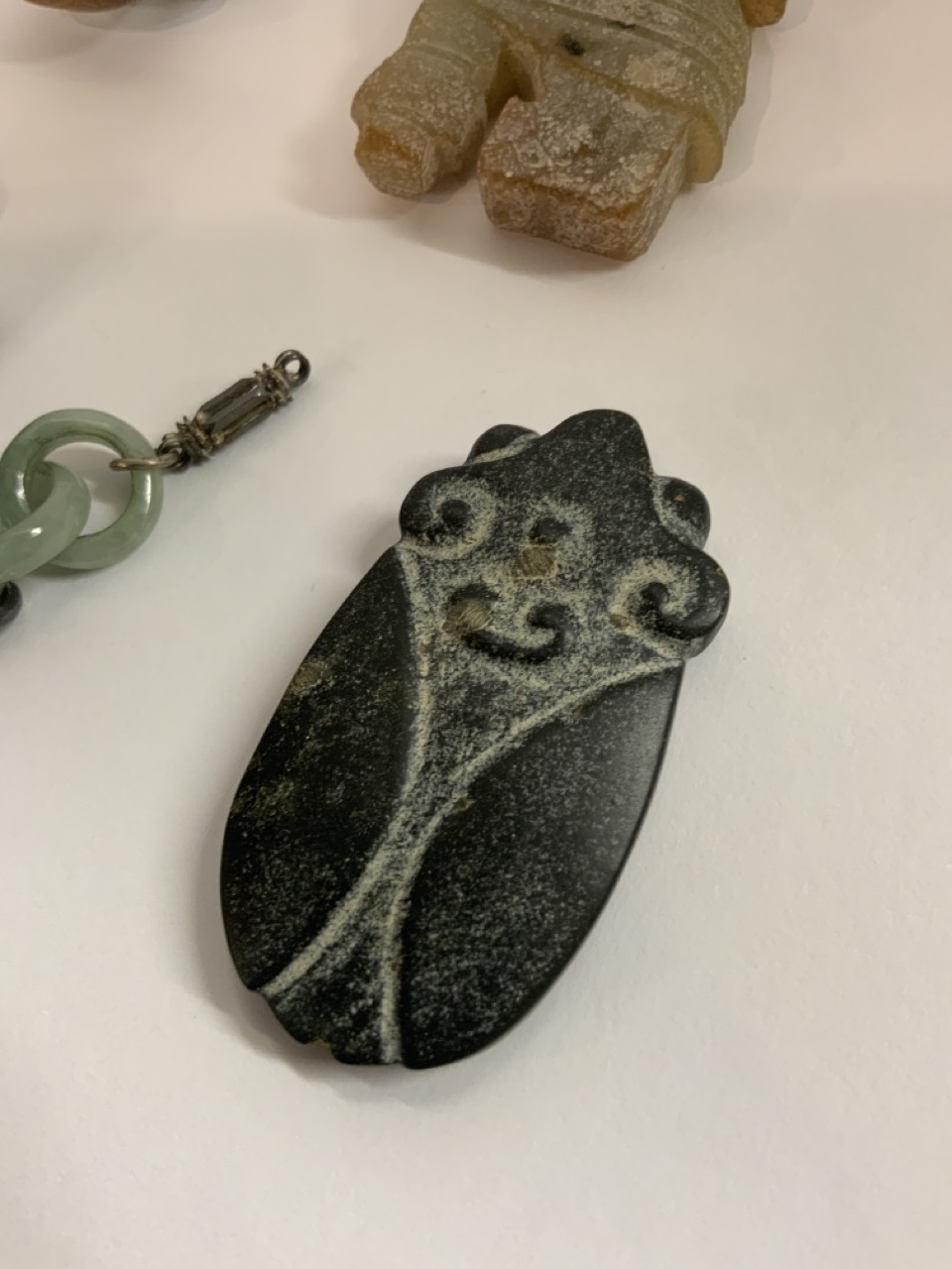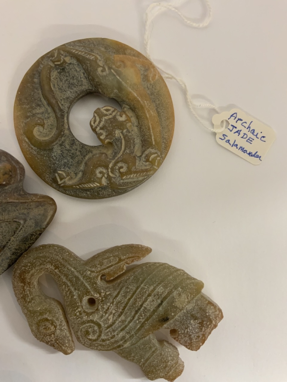 Brown serpentine, flat jade cicada, jade standing cat, animals etc.