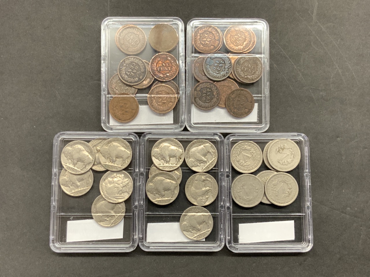 Assorted U.S. coins. Buffalo nickels, Liberty Nickels and Indian head pennies