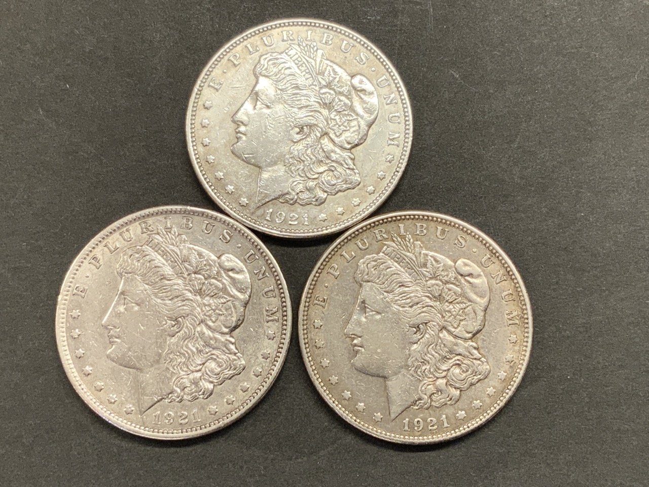 Three (3) 1921 Morgan U.S. Silver Dollars.