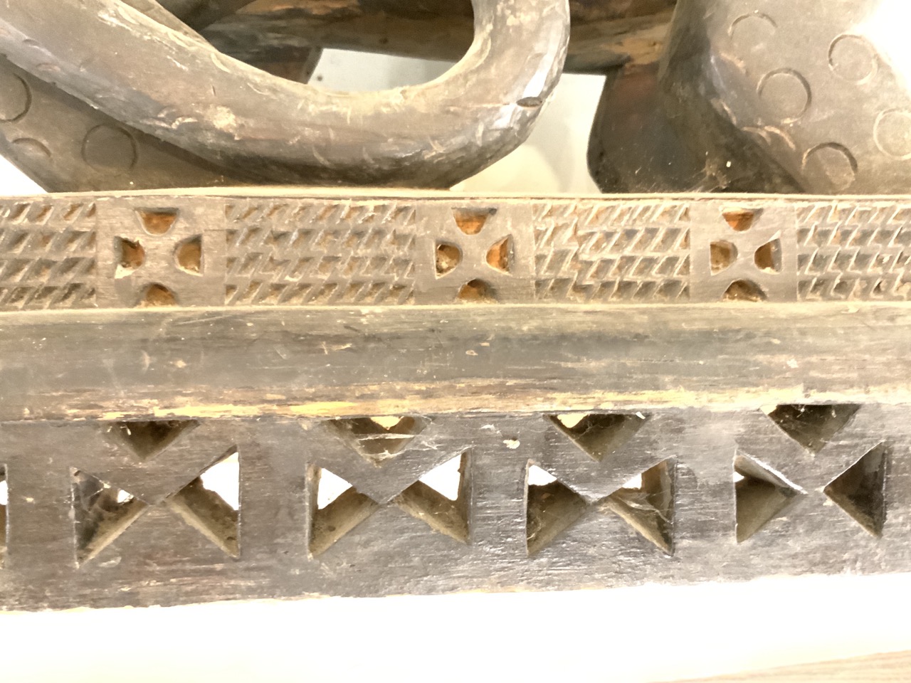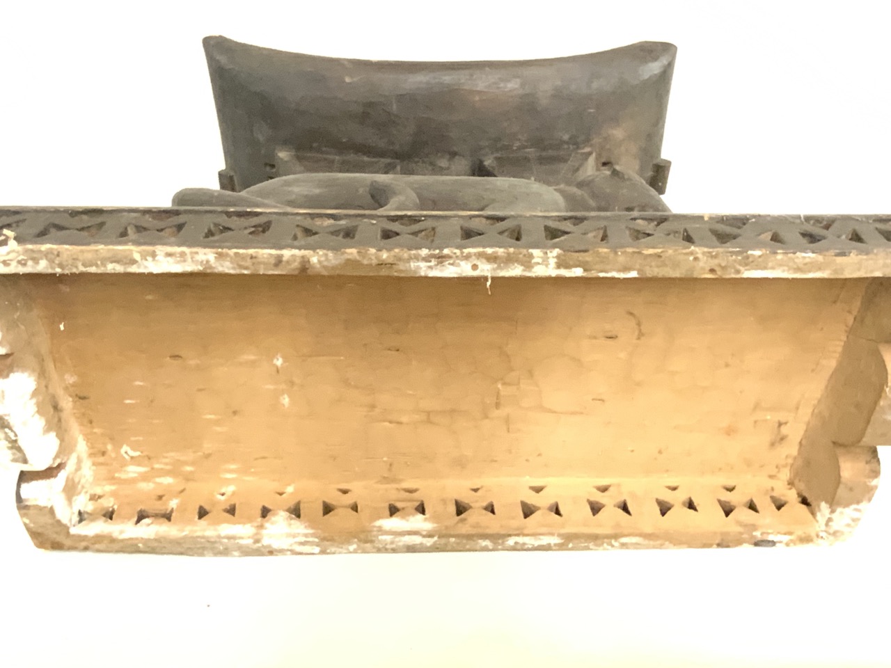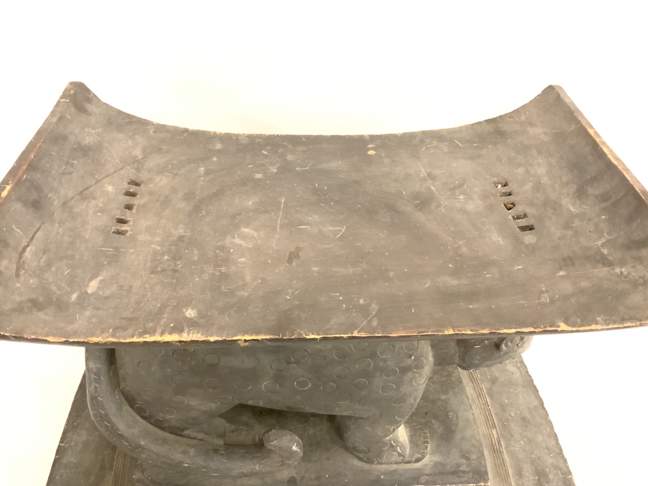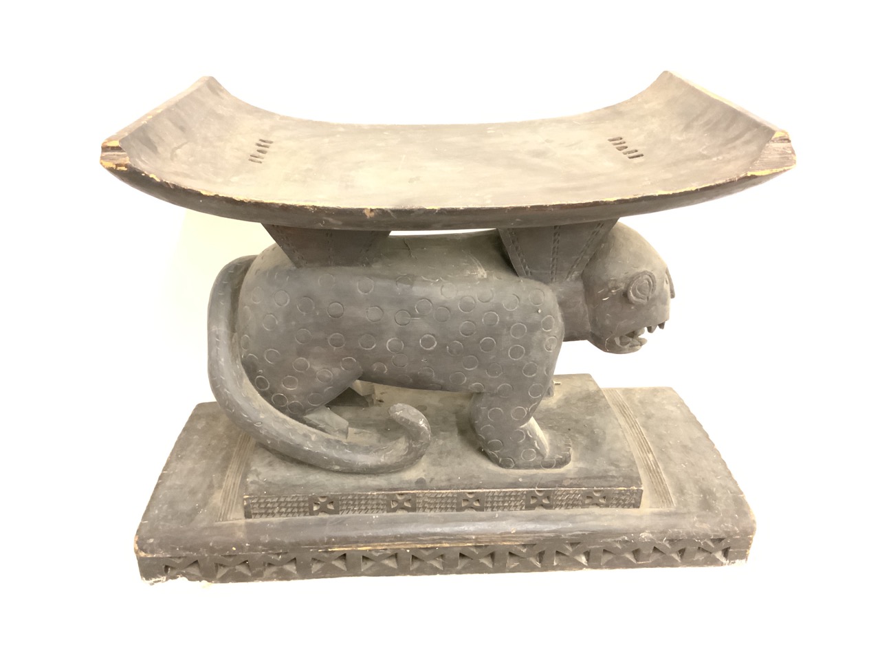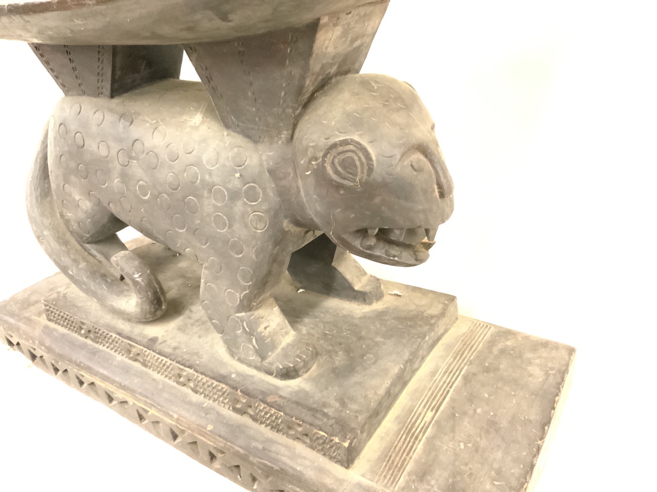 An African carved wood lion seat. Some water damage, chipping. Cleaning needed. Stored in basement.