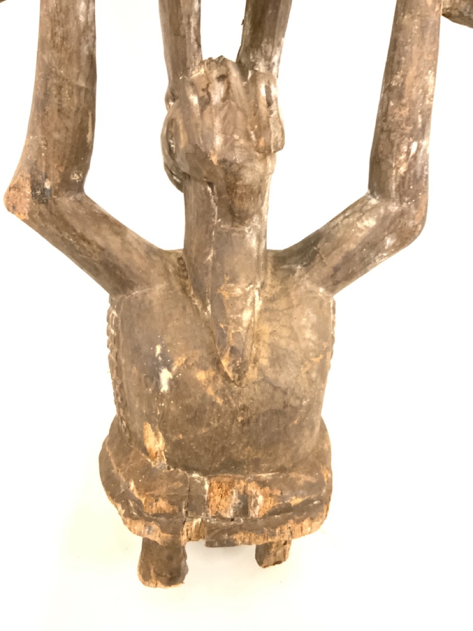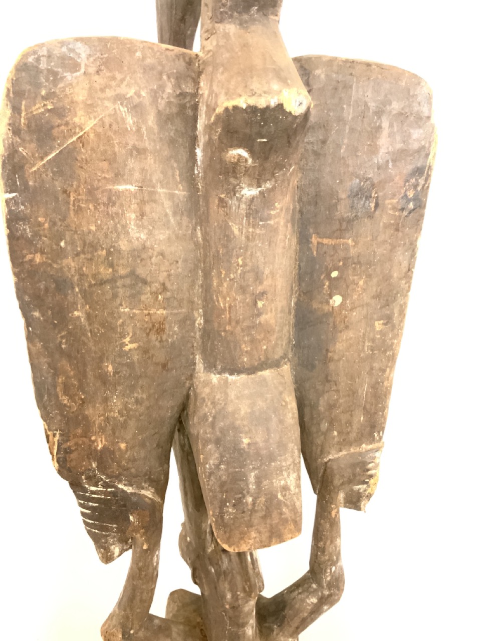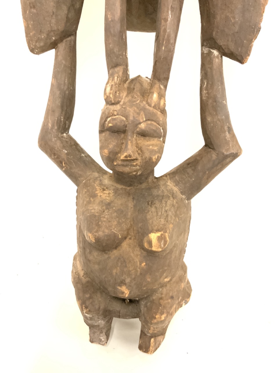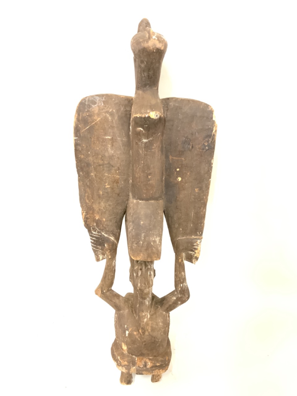 A large carved wood tribal African figure of woman holding bird.
