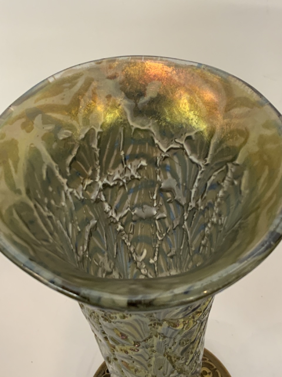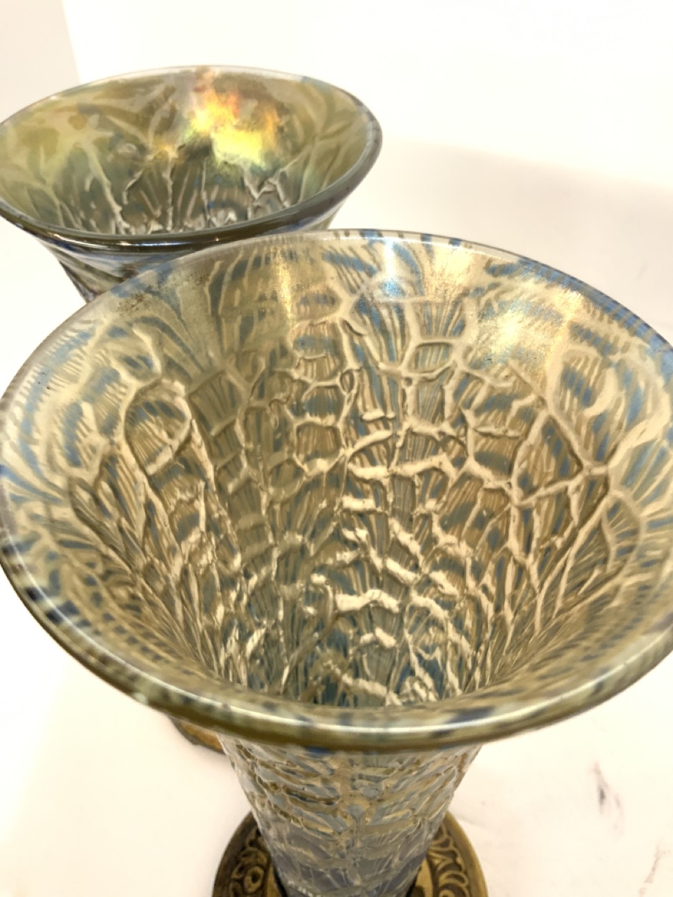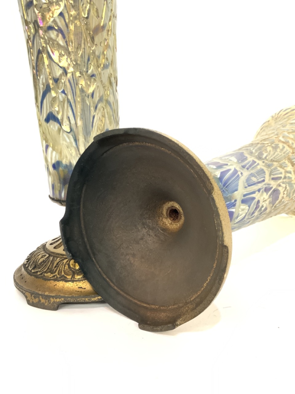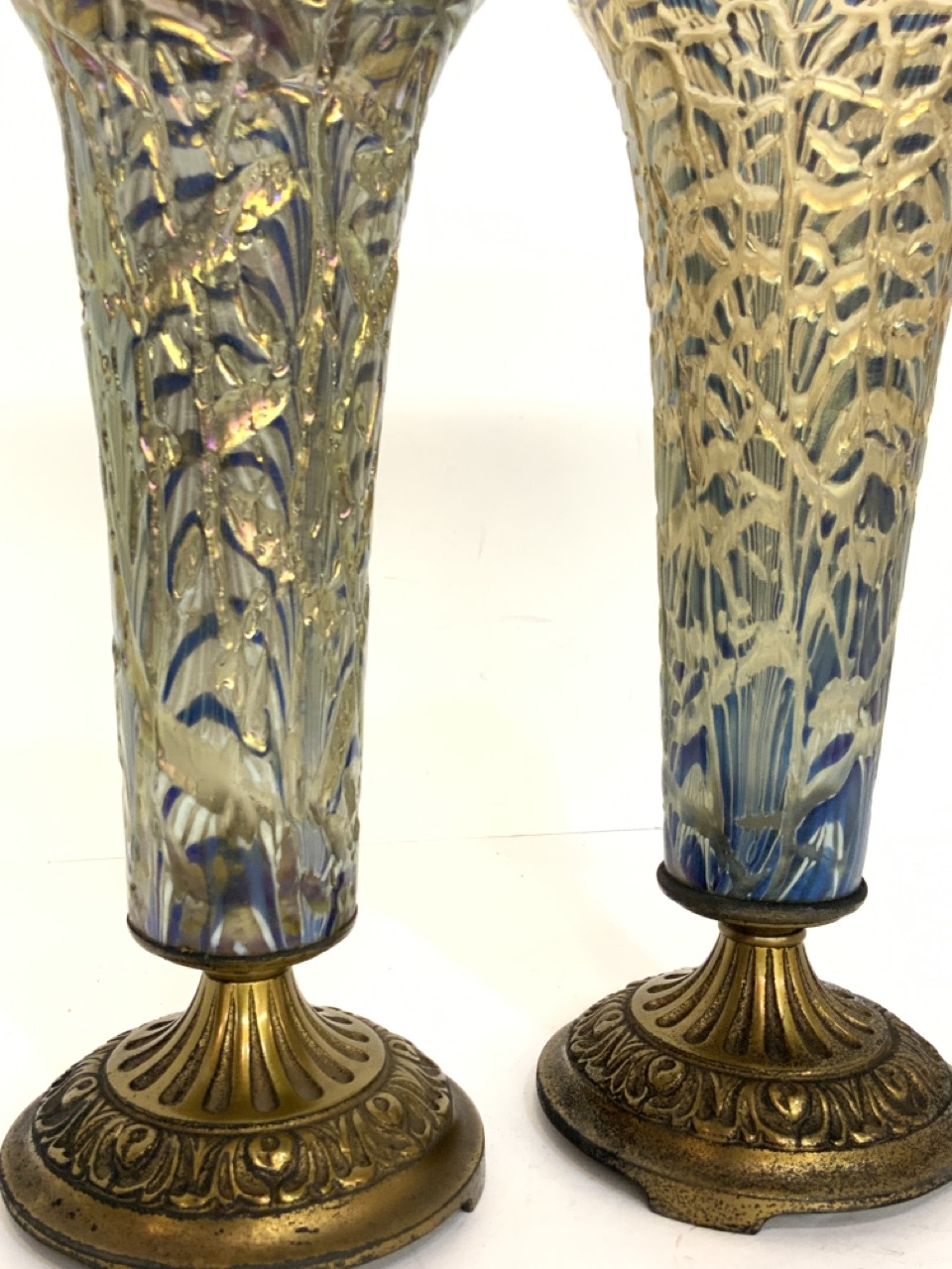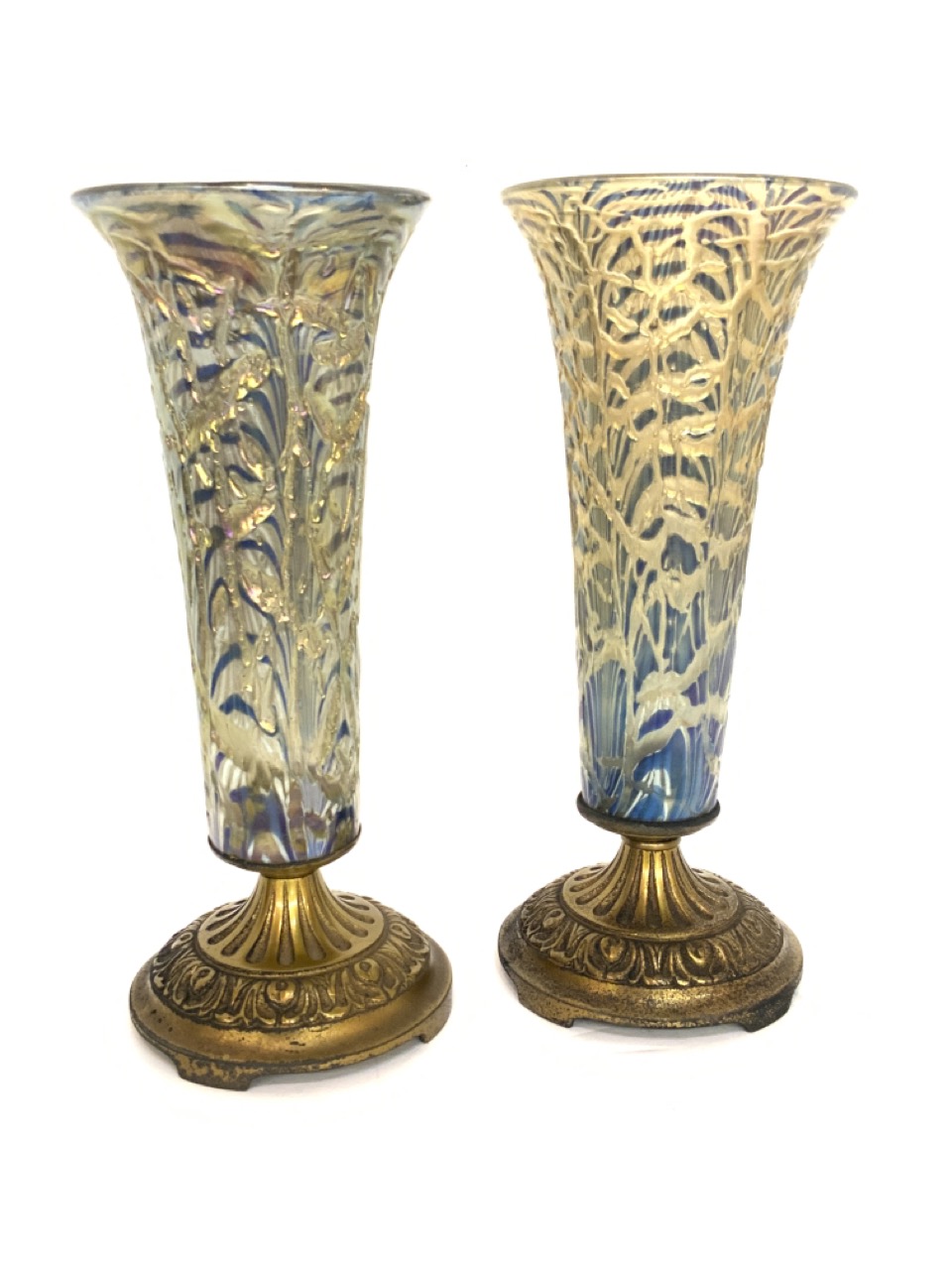 A pair of iridescent glass mounted vases. Early 20th century. Unsigned.