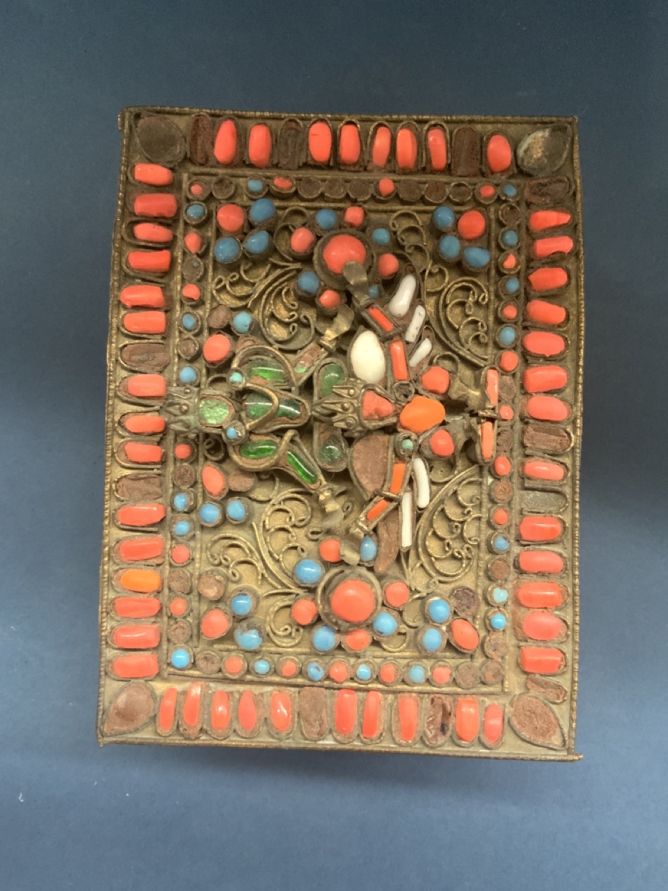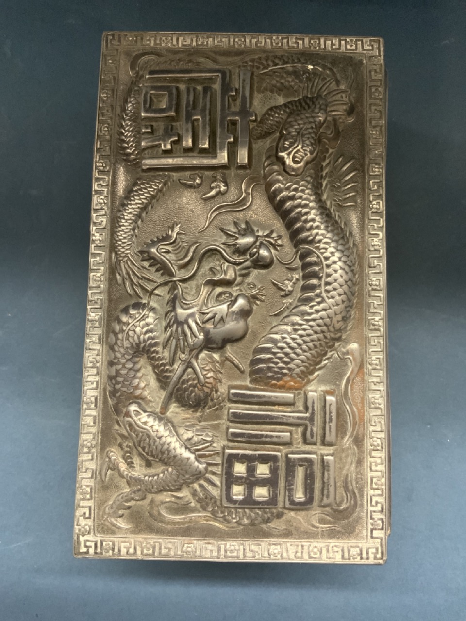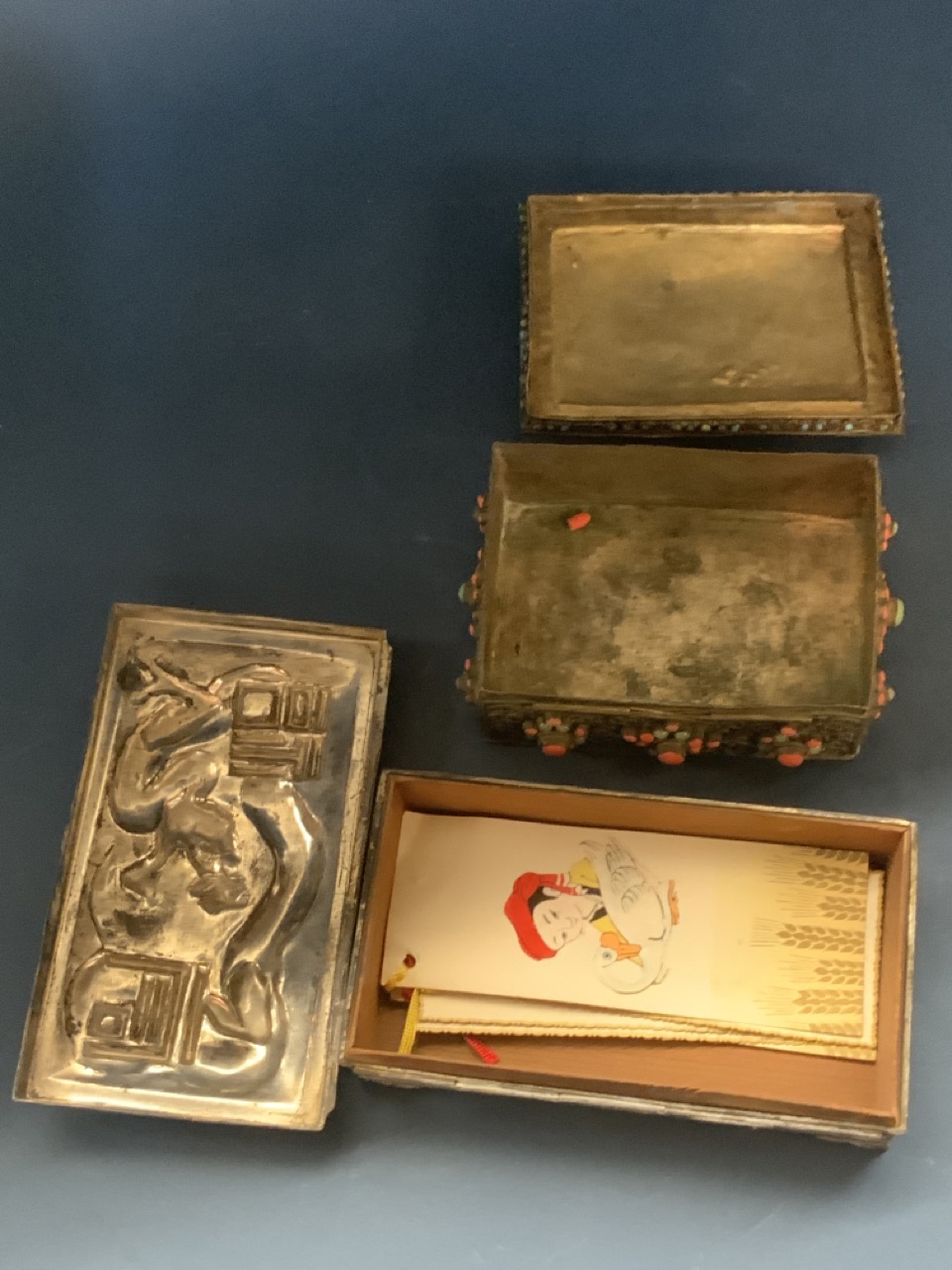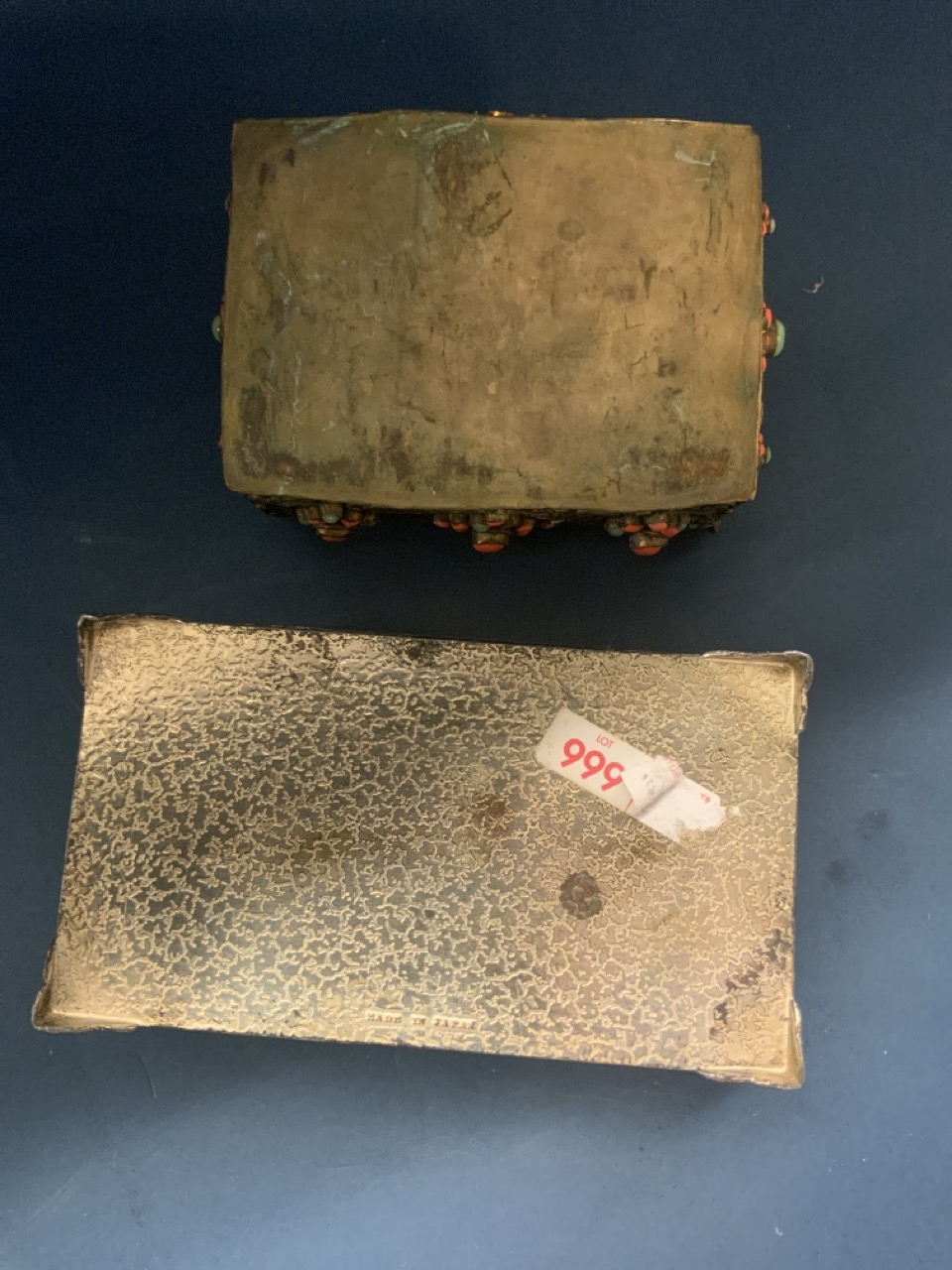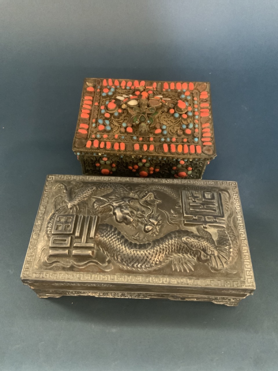 Two (2) vintage antique jewelry or card boxes. Chinese/Asian. One with dragon motif and other encrusted with coral and turquoise stones.