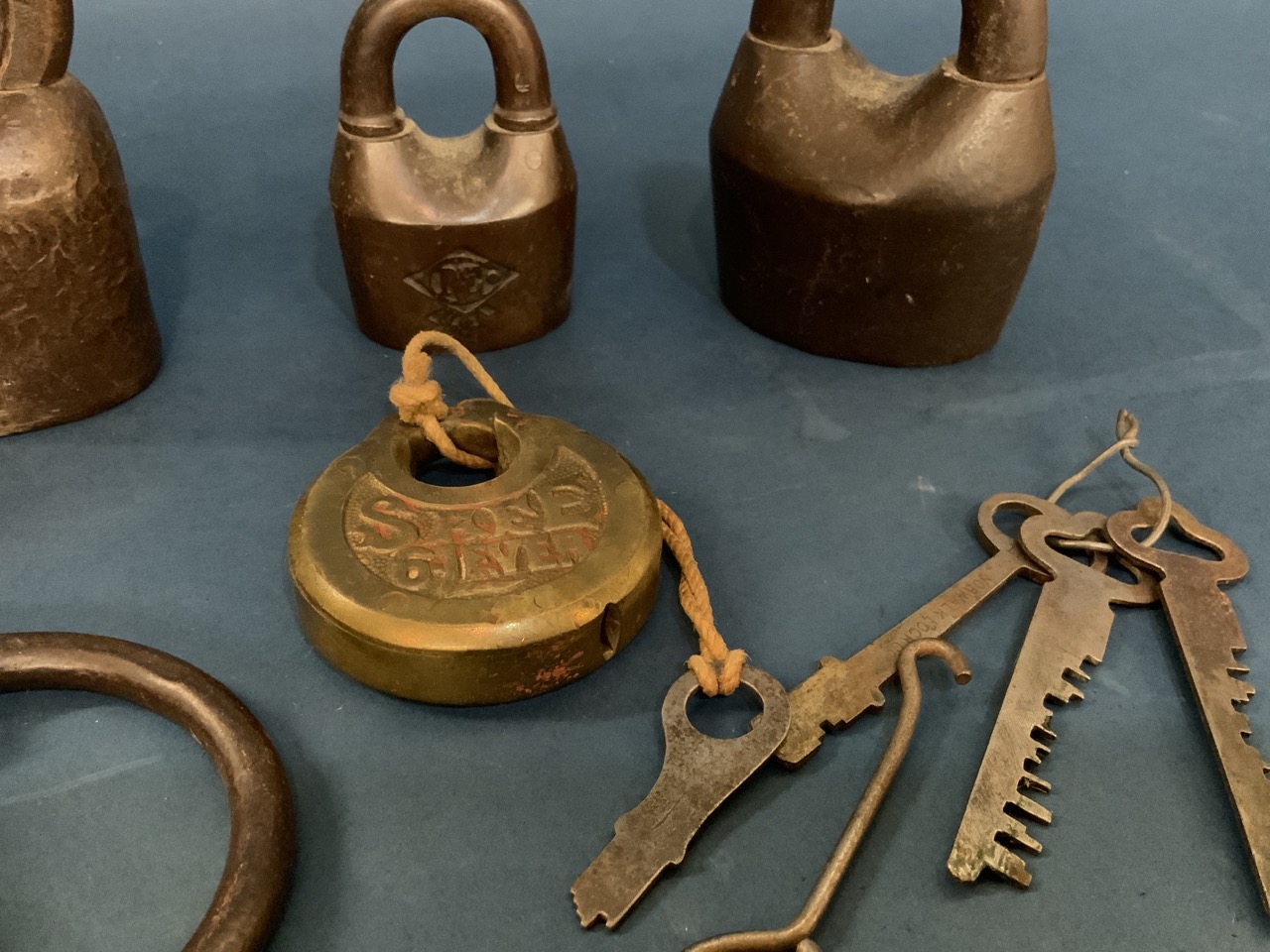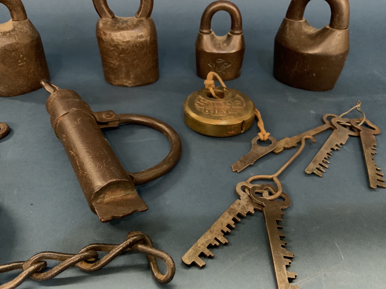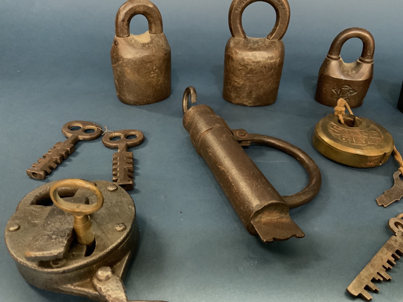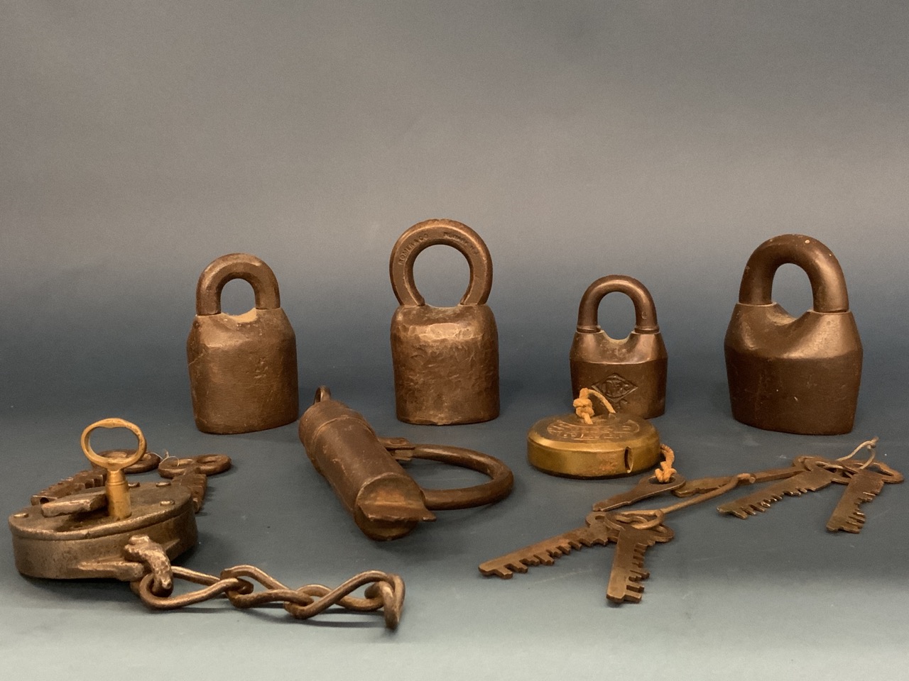 Compiled estate found antique locks. Some with keys and extra keys included. Please see photograph preview or call.
