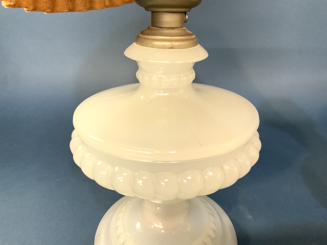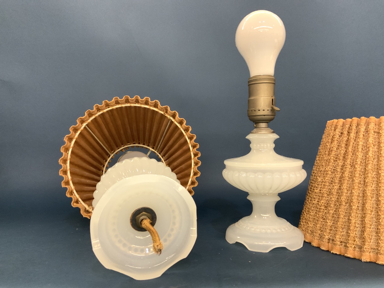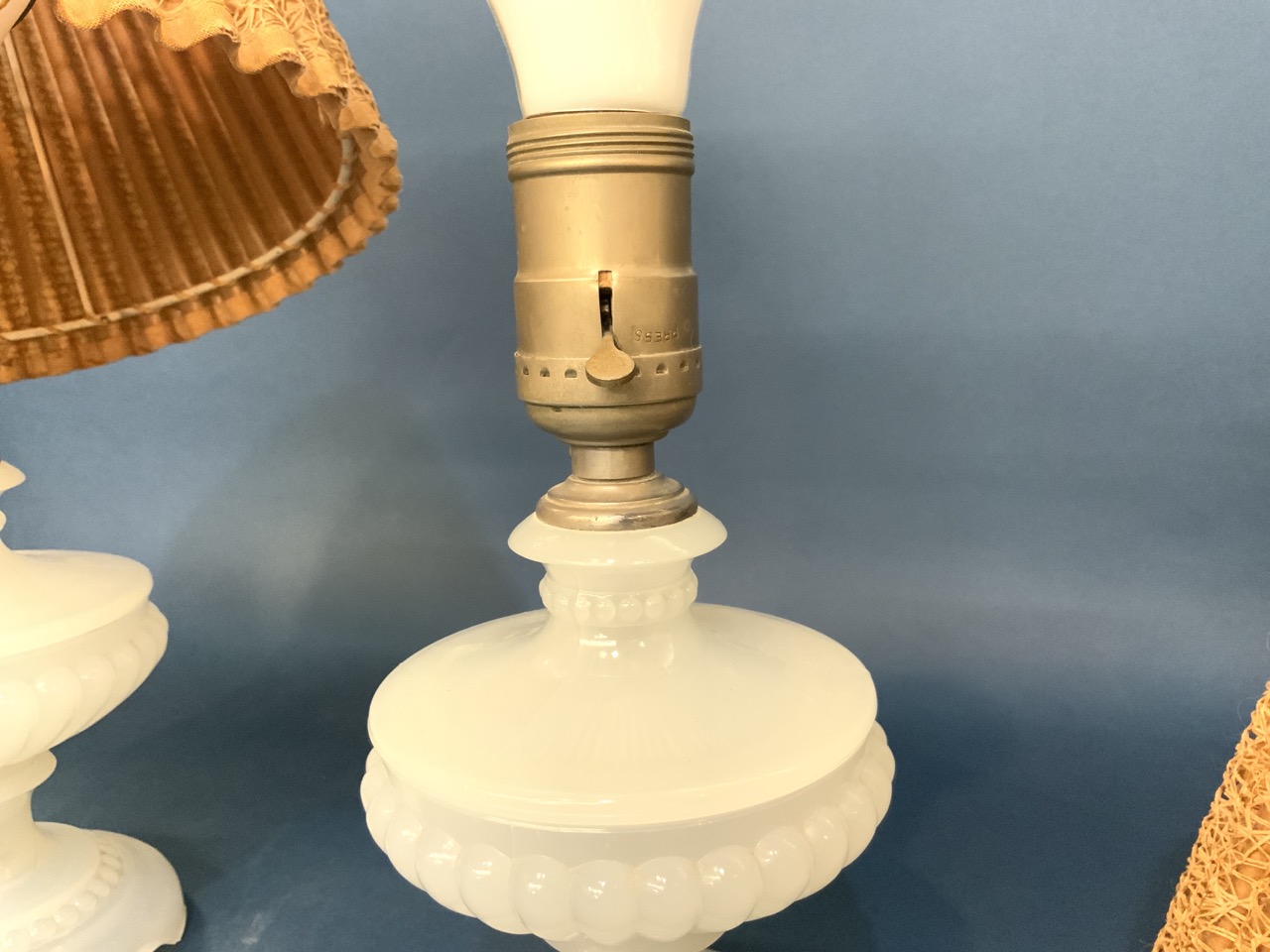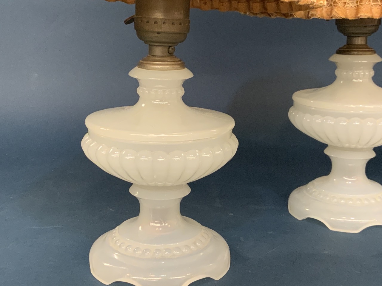 A pair, White opaque glass boudoir lamps. Need to be re-wired.