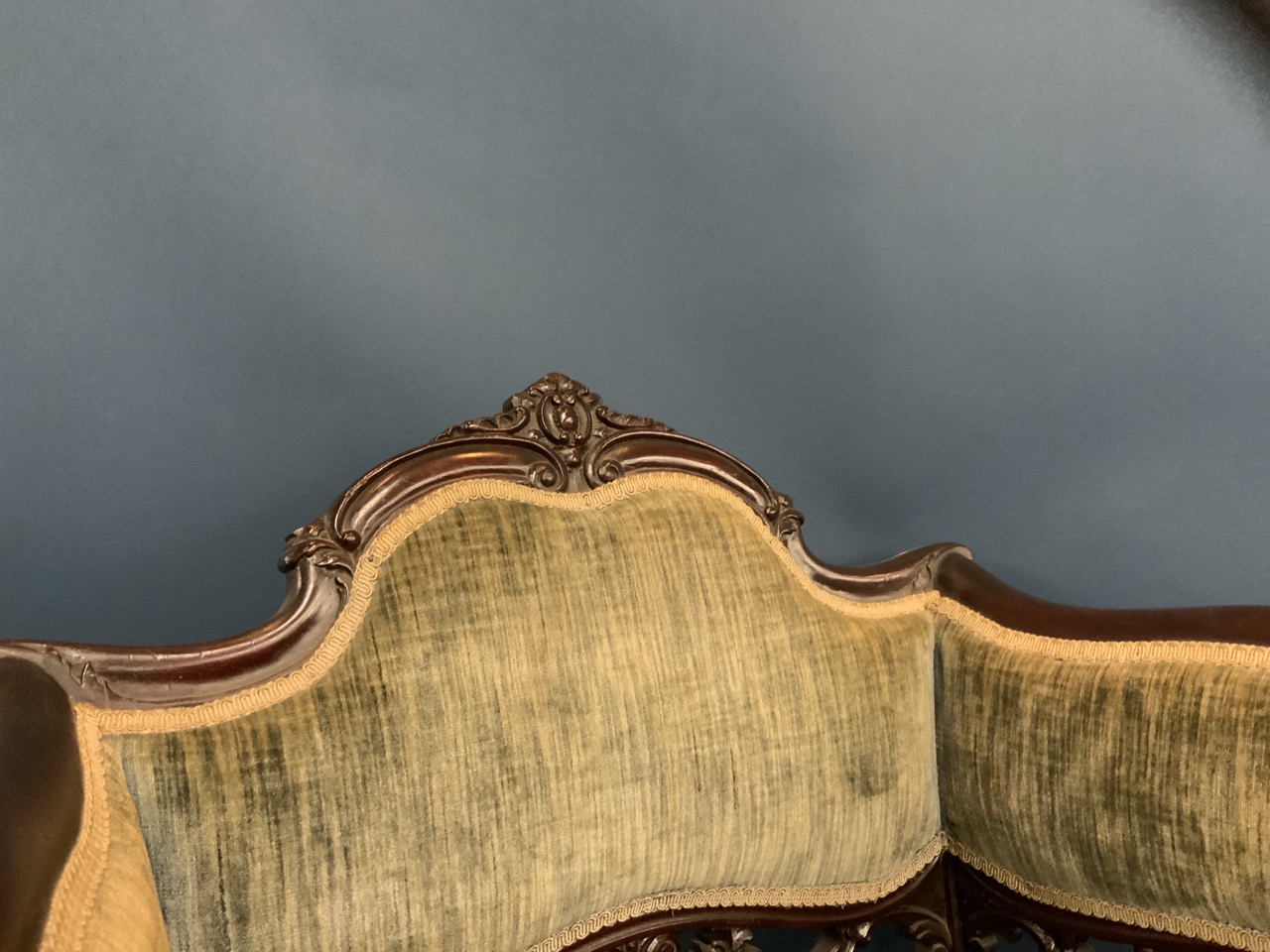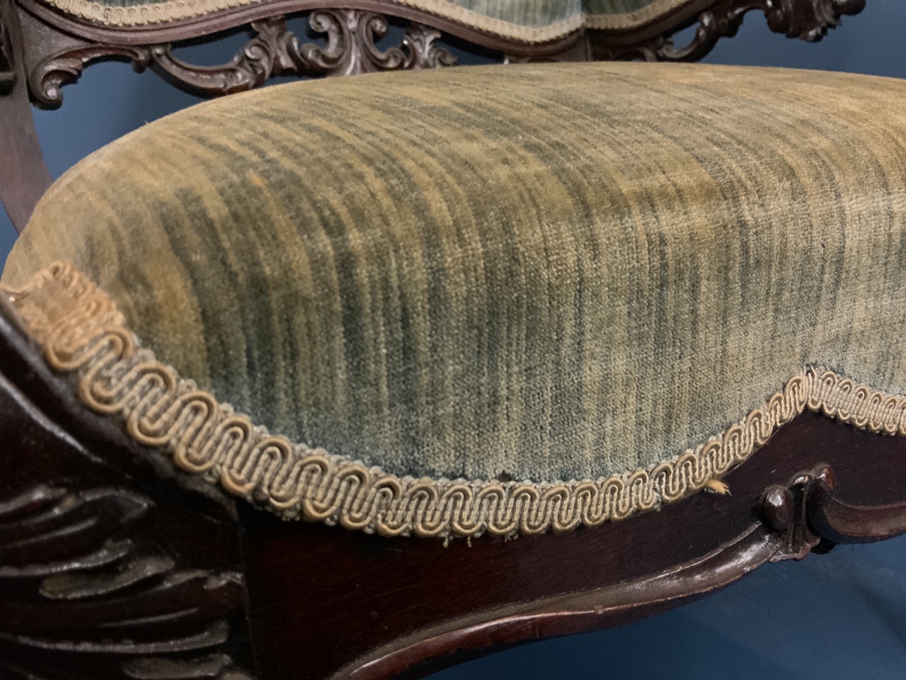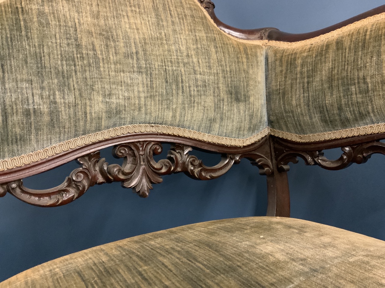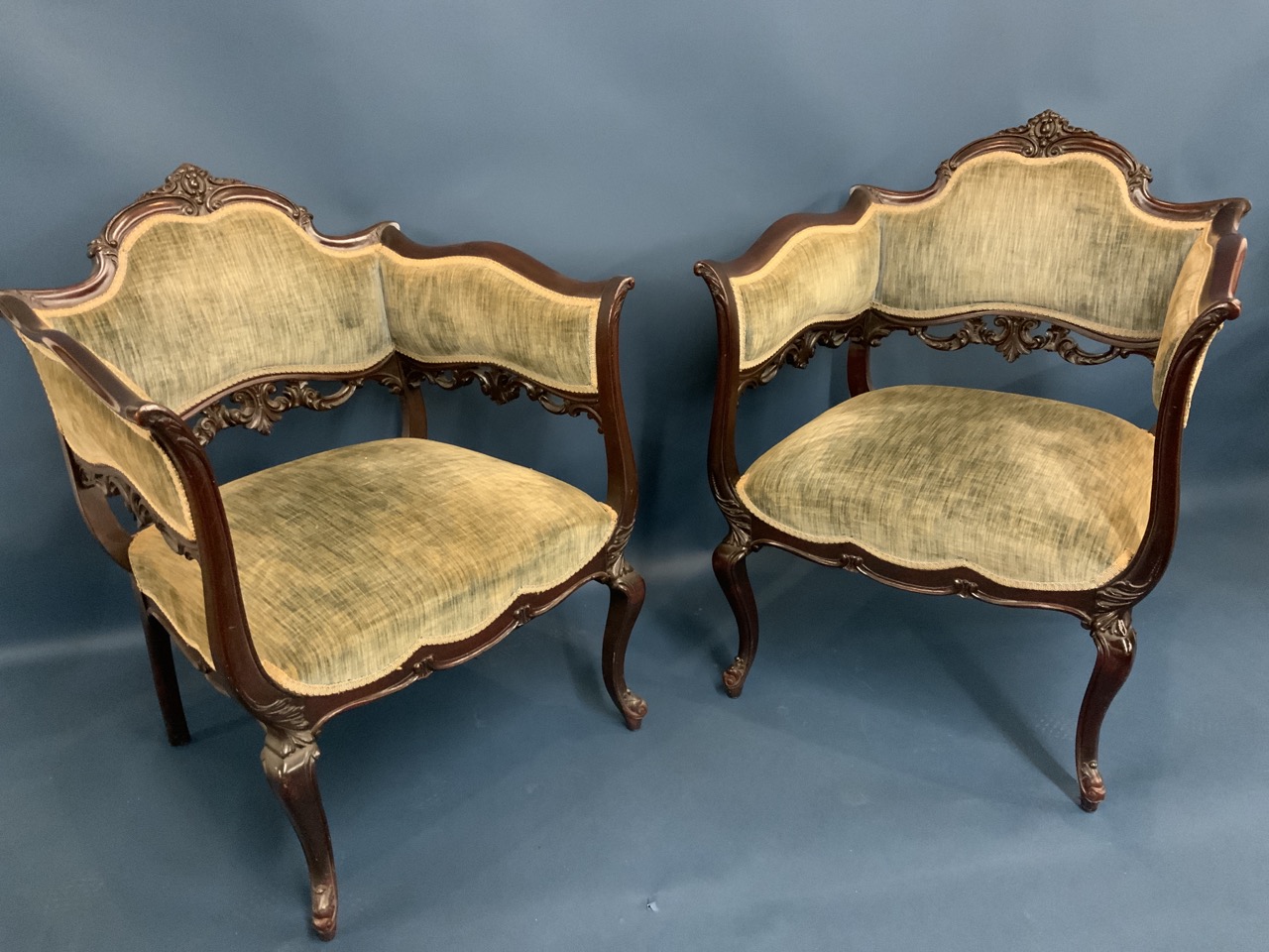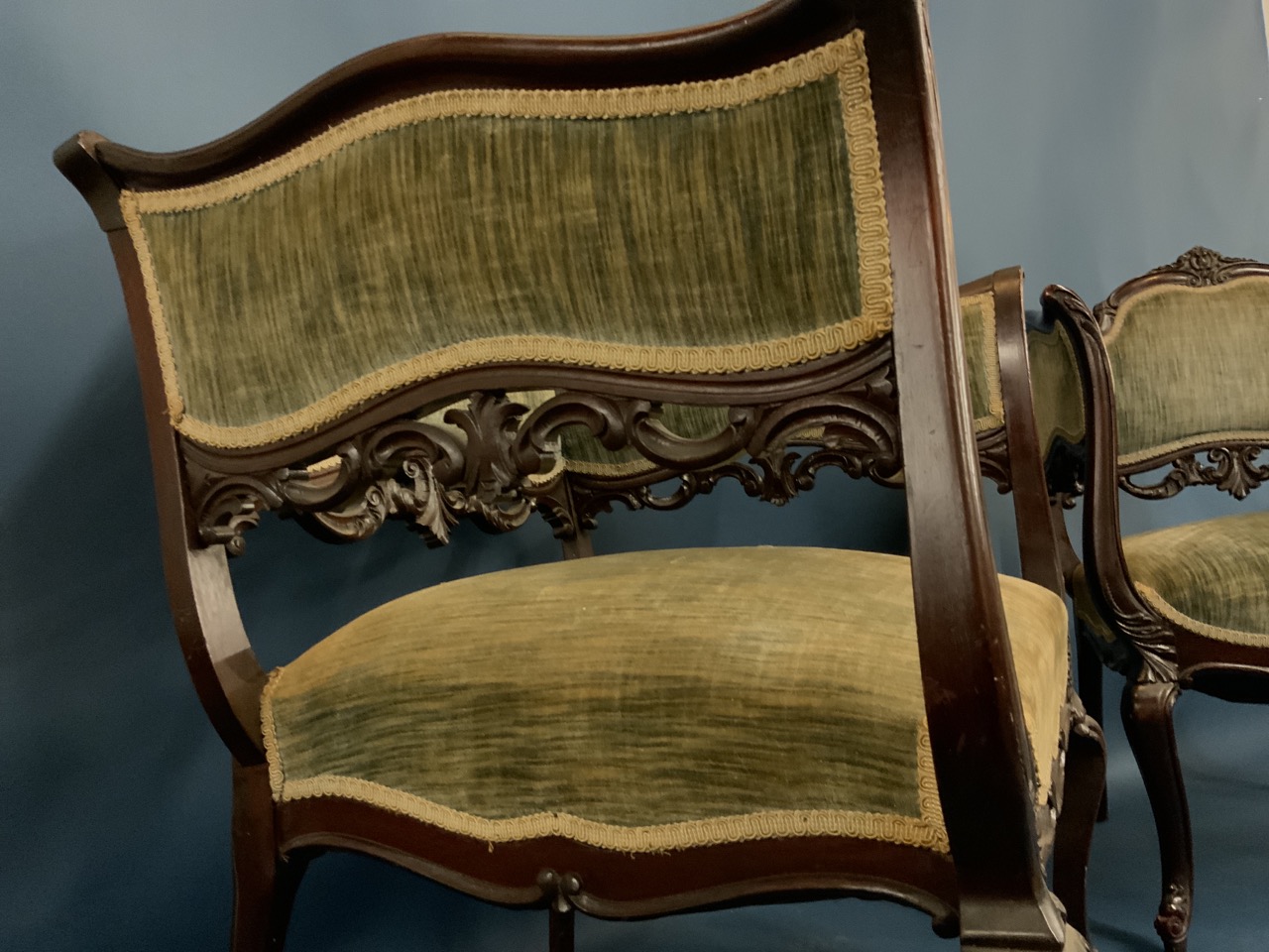 A pair of late 19th or early 20th century high quality carved mahogany arm chairs with celadon green colored upholstery.