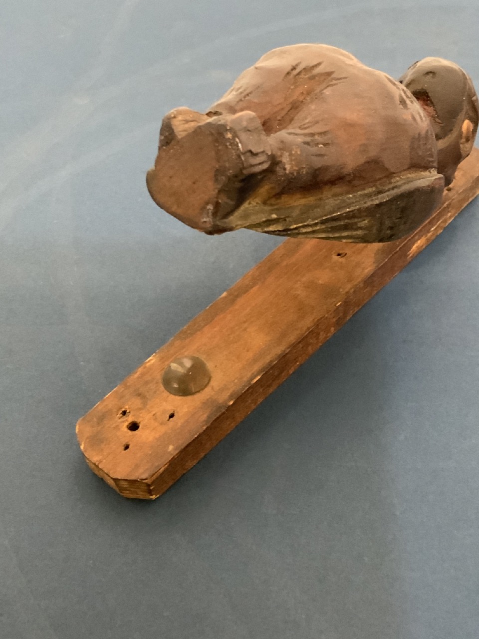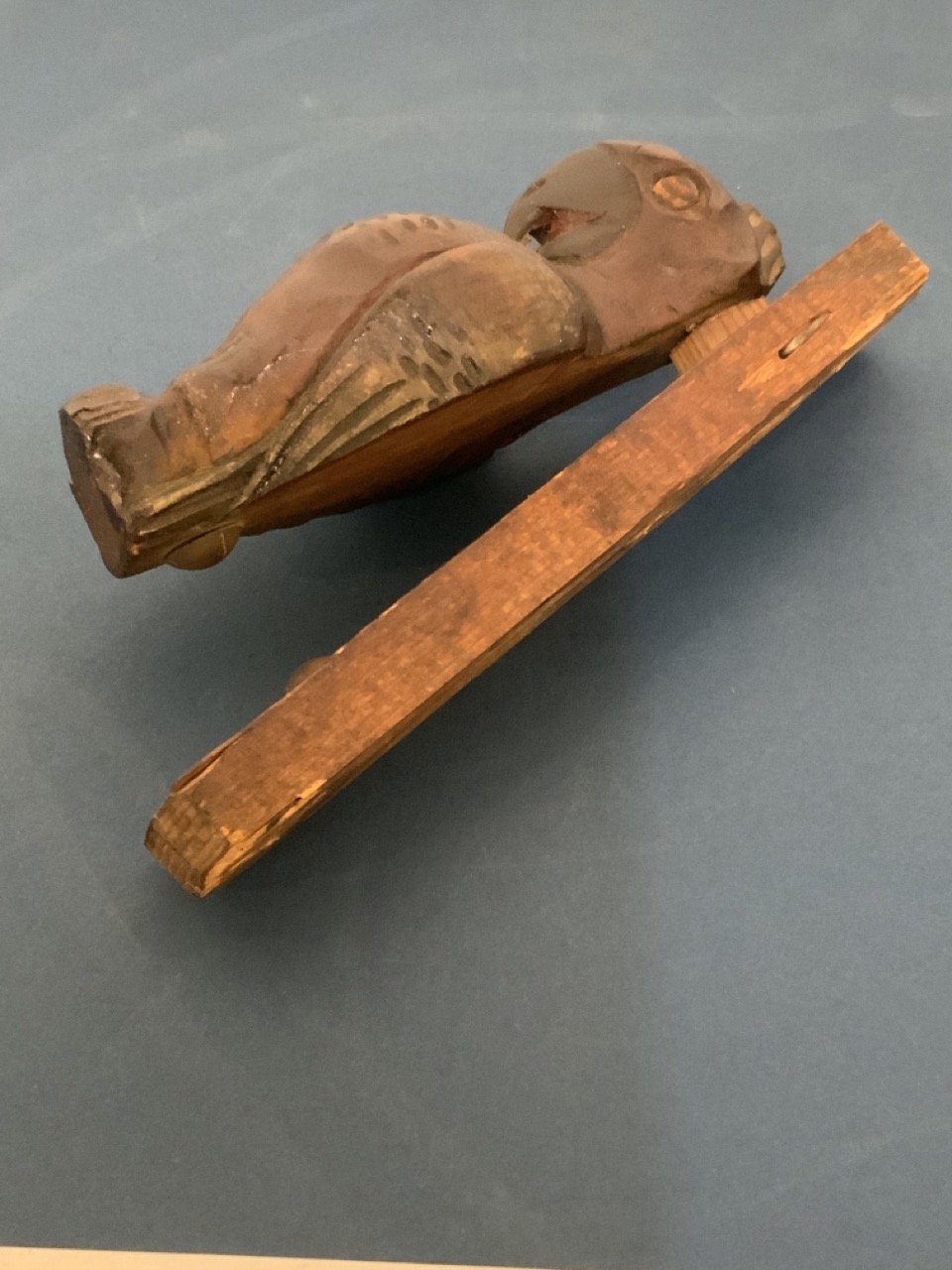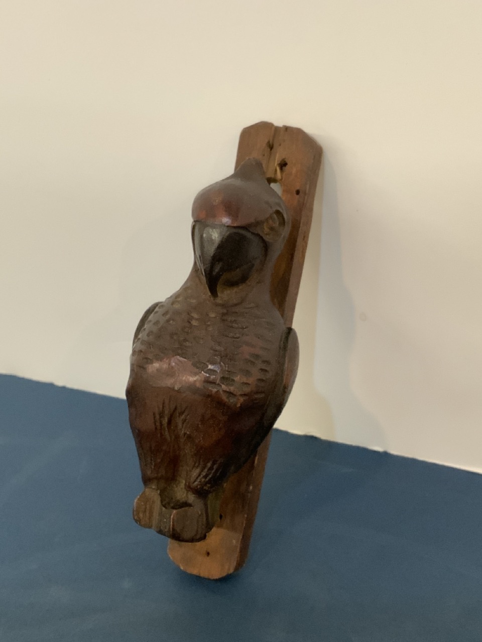 Folk Art Carved Wood Parrot Door Knocker. Brass tacks for knock noise. Early 20th century folk art.