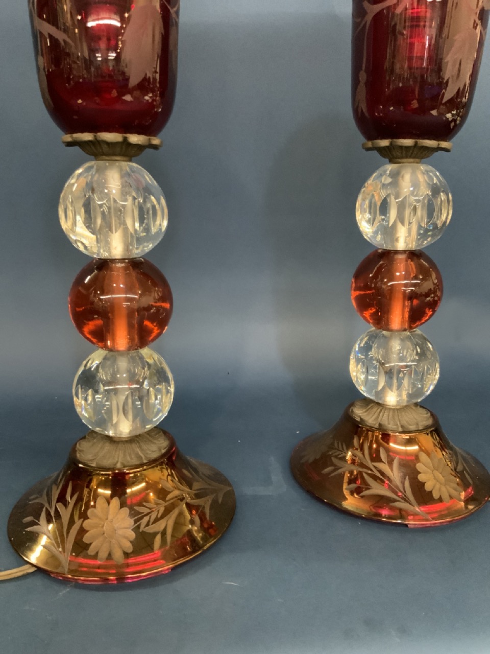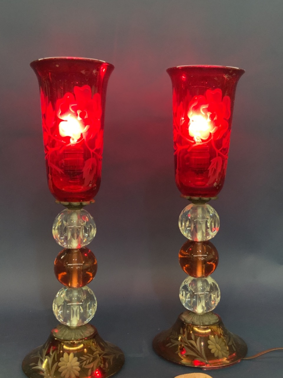 A fine pair of ruby etched glass torchère style table lamps. Large etched roses within shade. No damage noted. Please see photograph preview or call.