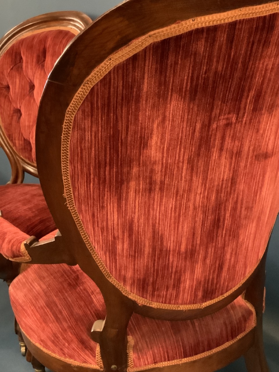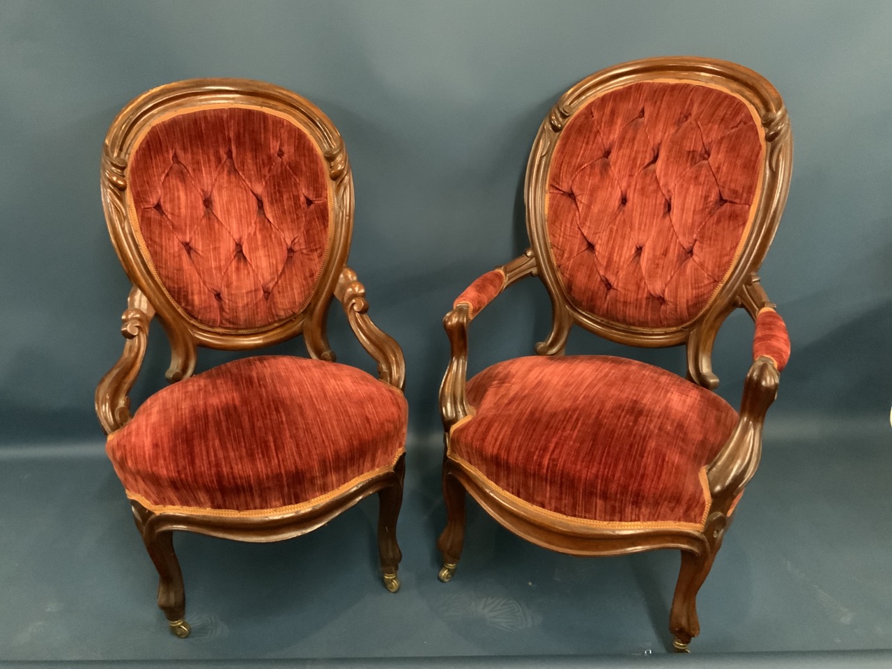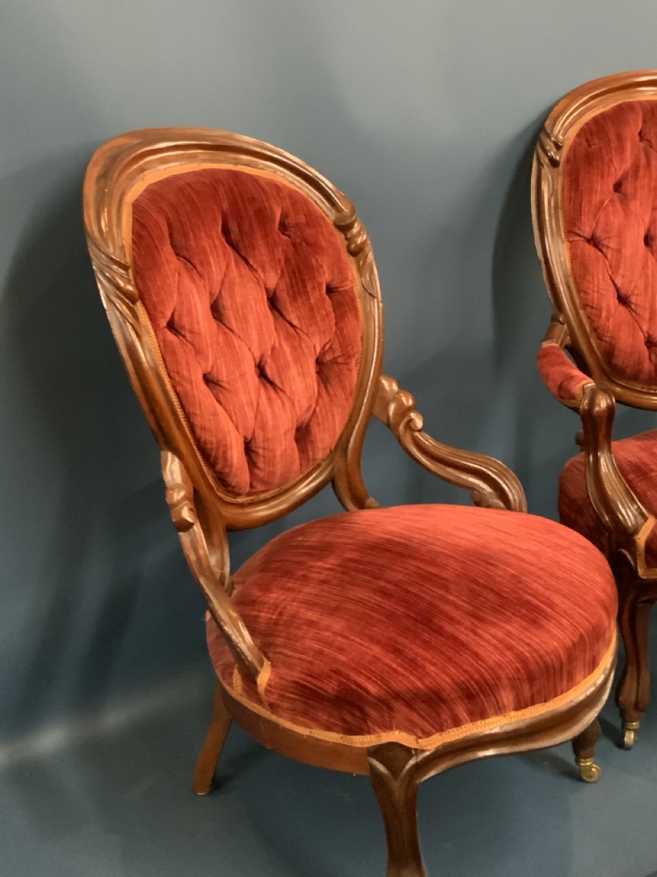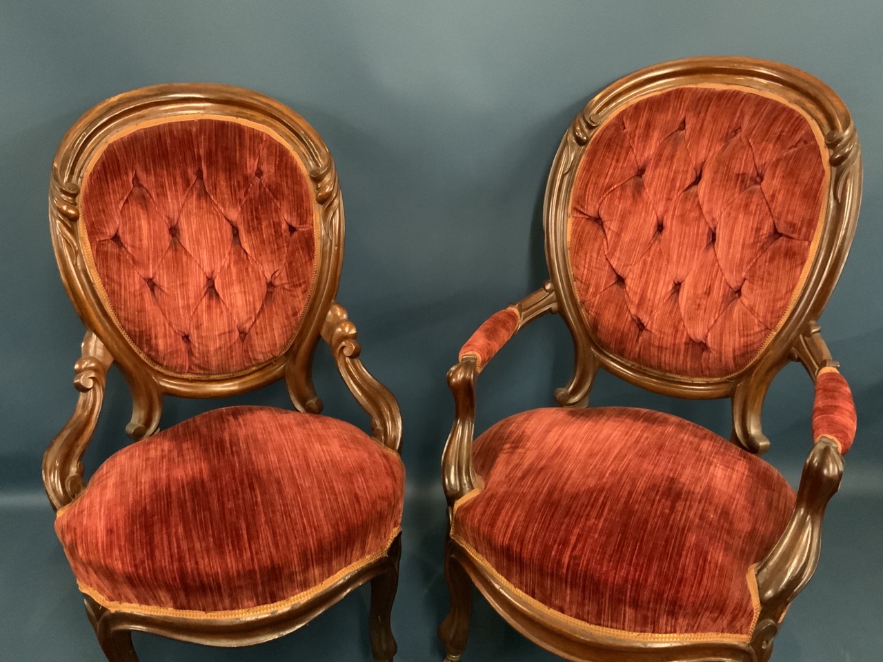 A pair of Victorian parlor chairs with red upholstery.