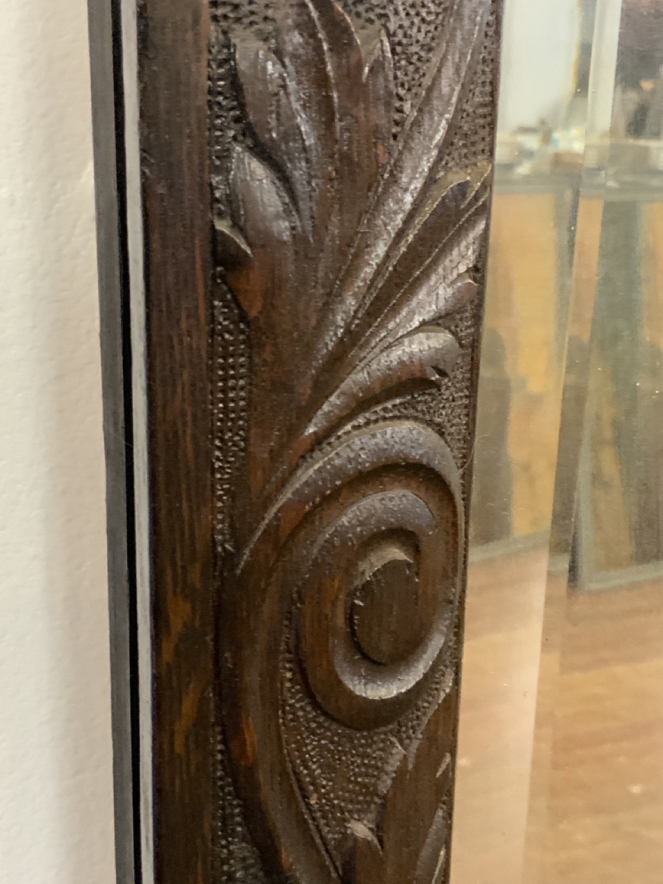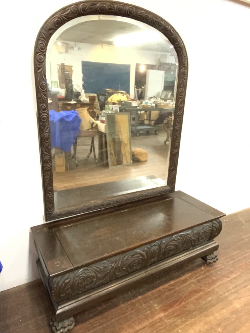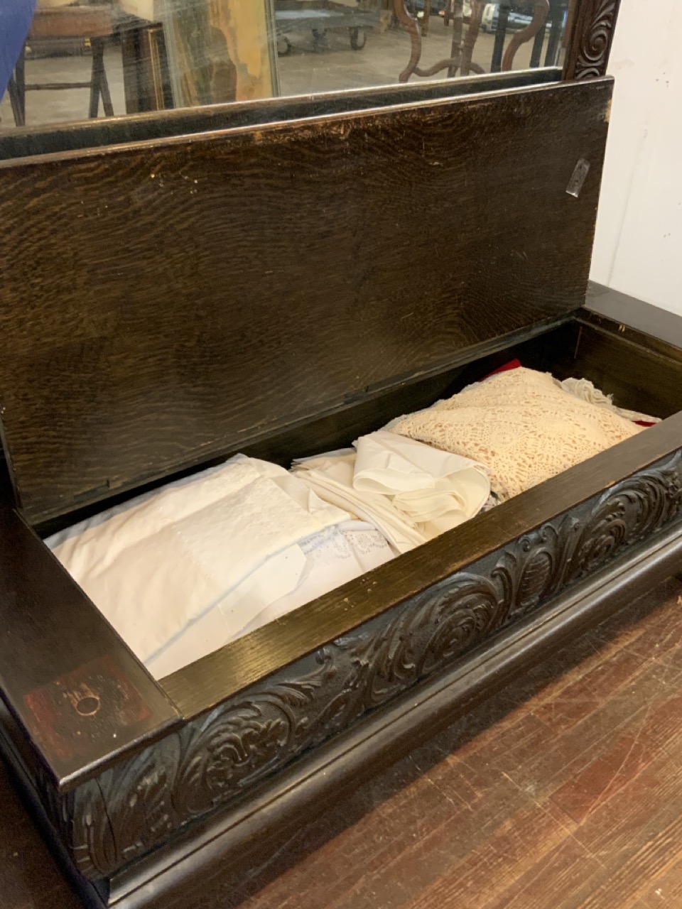 Large carved dark oak pier mirror with matching bench with storage.