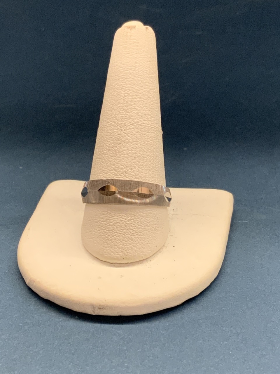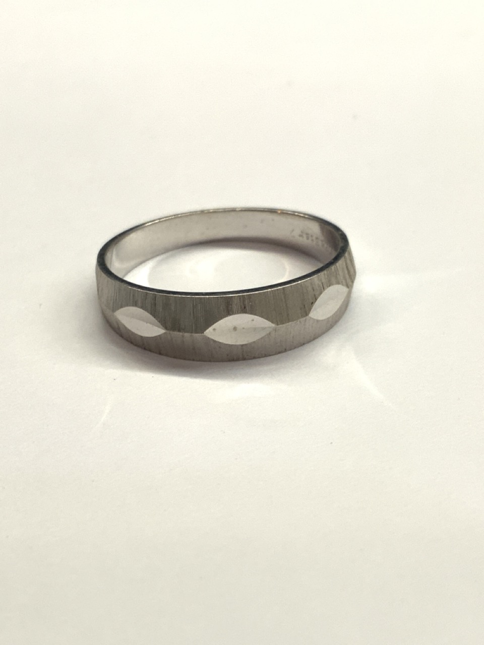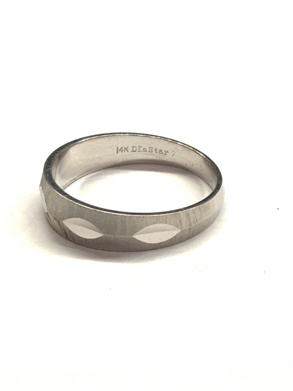 14k bevel cut white gold wedding band. Made by Diastar c. 1960's.