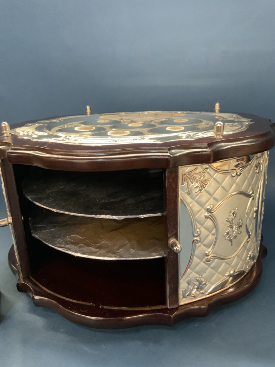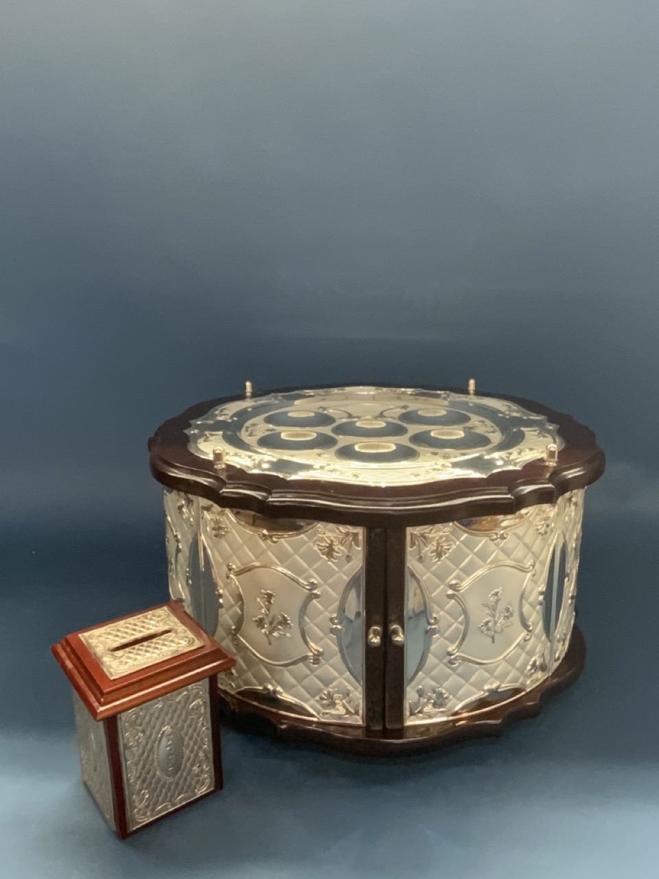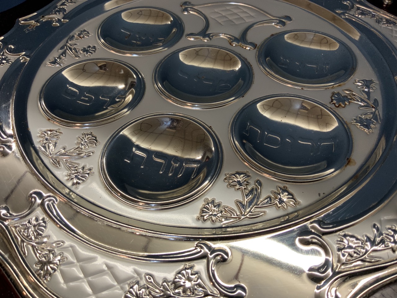 Contempoary Judaica fine Seder plate with storage, box, Judaica tools and silver plated Hanukkah Menorah. As seen in photograph preview.