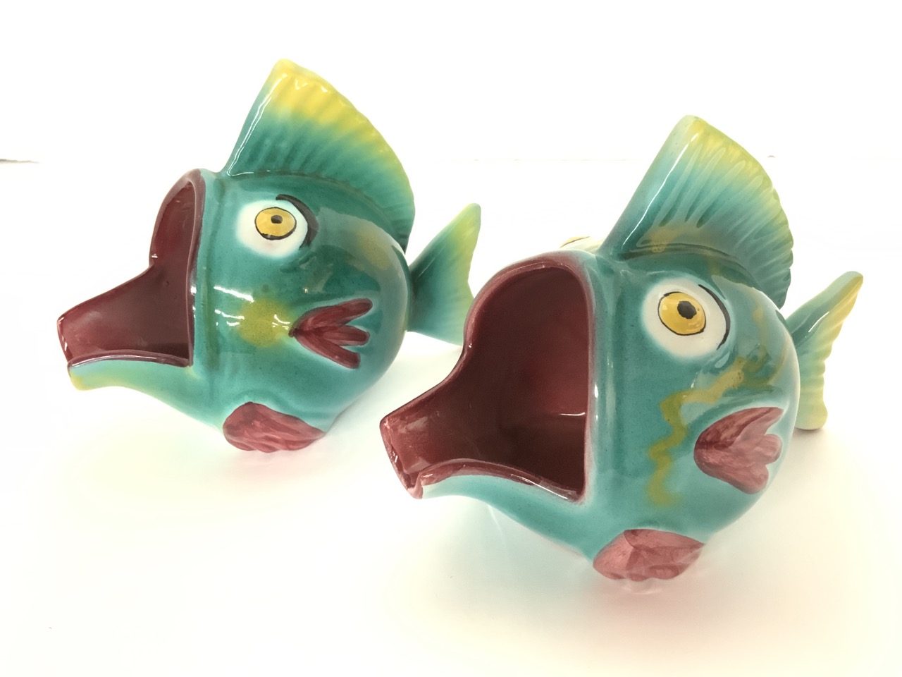 Two (2) Italian ceramic fish ashtrays. Mid Century Modern. Signed at base.