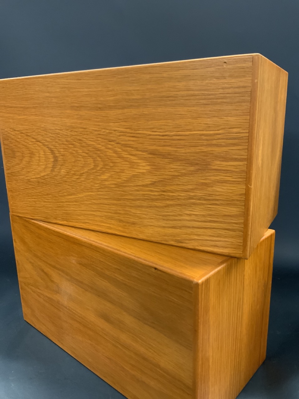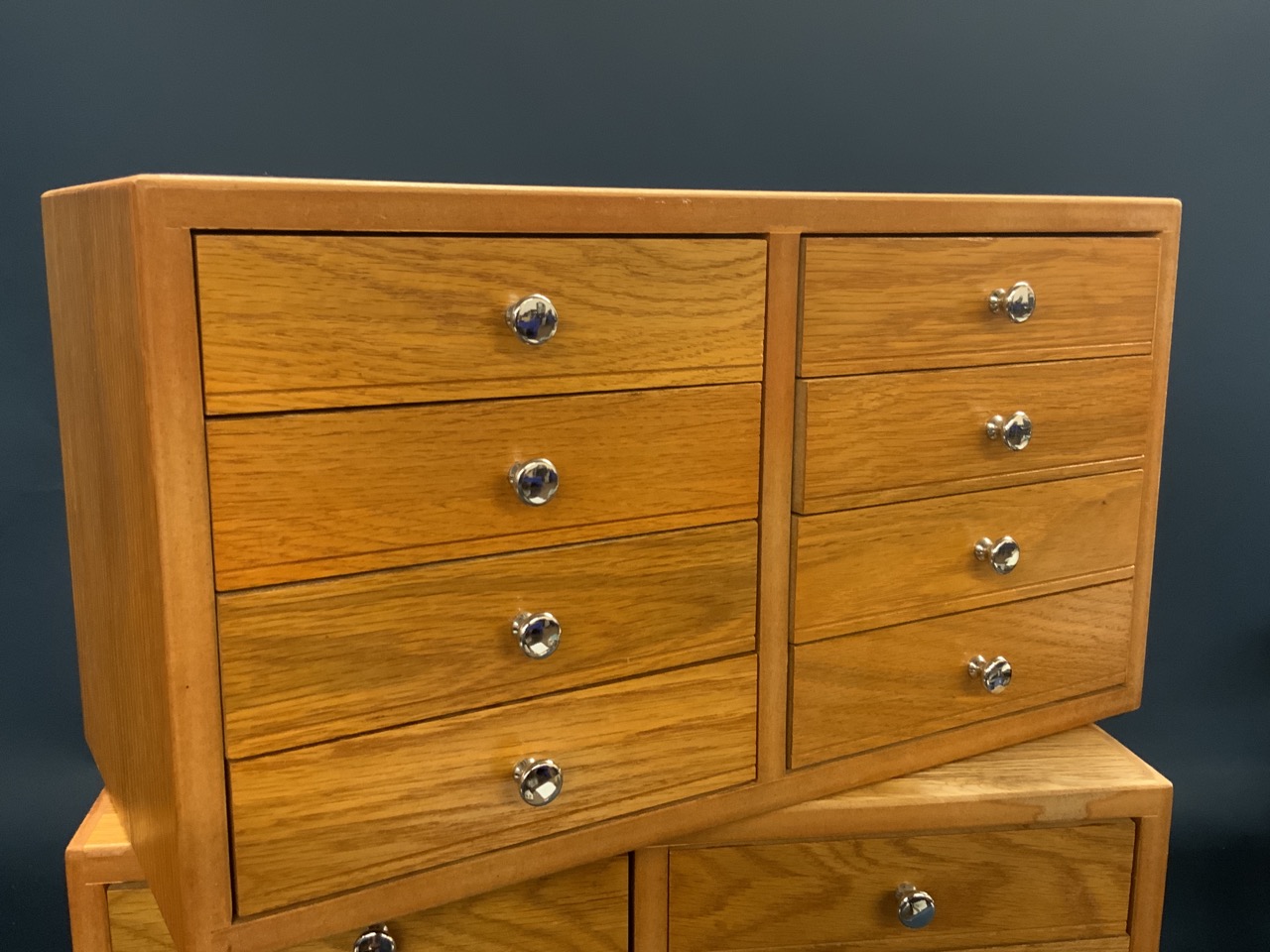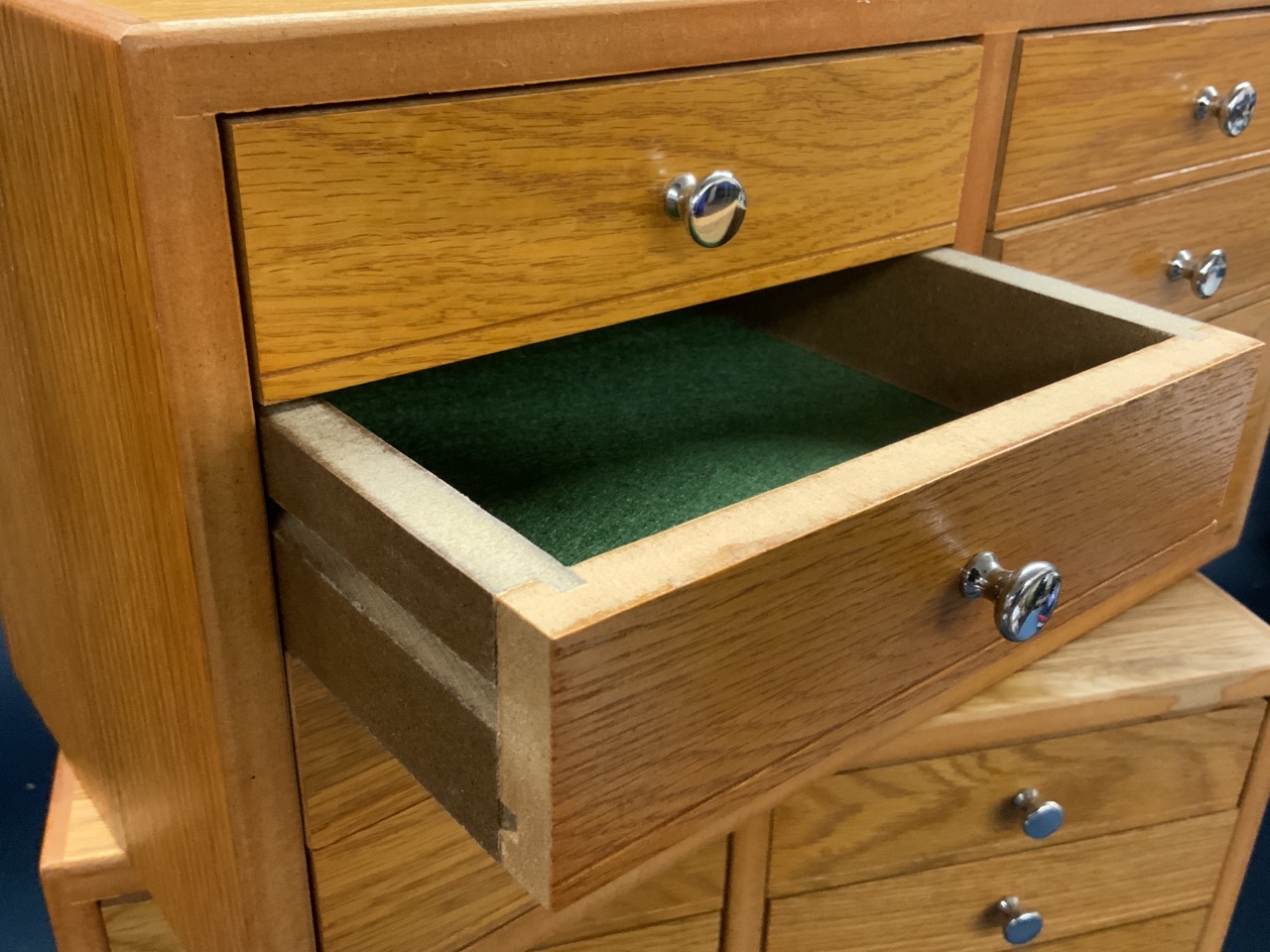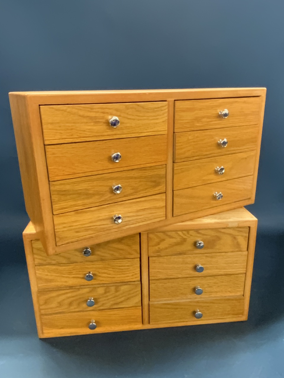 Two (2) Eight Drawer Oak Table Top Chests. Custom made with felt lined drawers. Perfect for pocket watch, fountain pen, pocket knife or jewelry collections.
