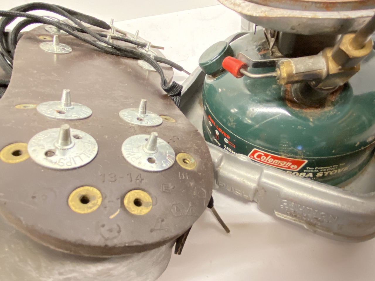 Ice Kleets, Coleman Model 508A Stove, and Steelton Multipurpose Tool