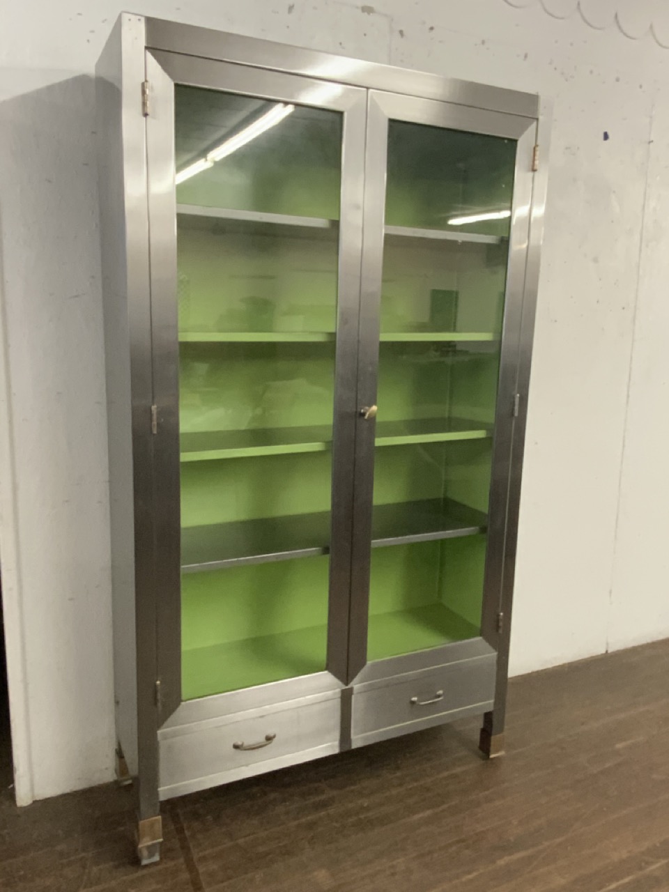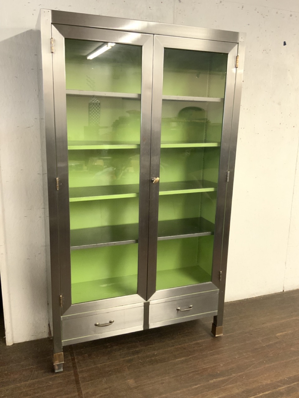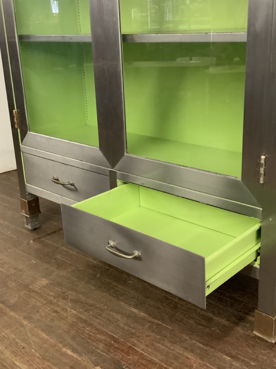 c. 1900-1900 stainless steel hospital medical cabinet. Two closing glass front doors. Re-stored and presents like new with added lime green interior paint. Brass footings.