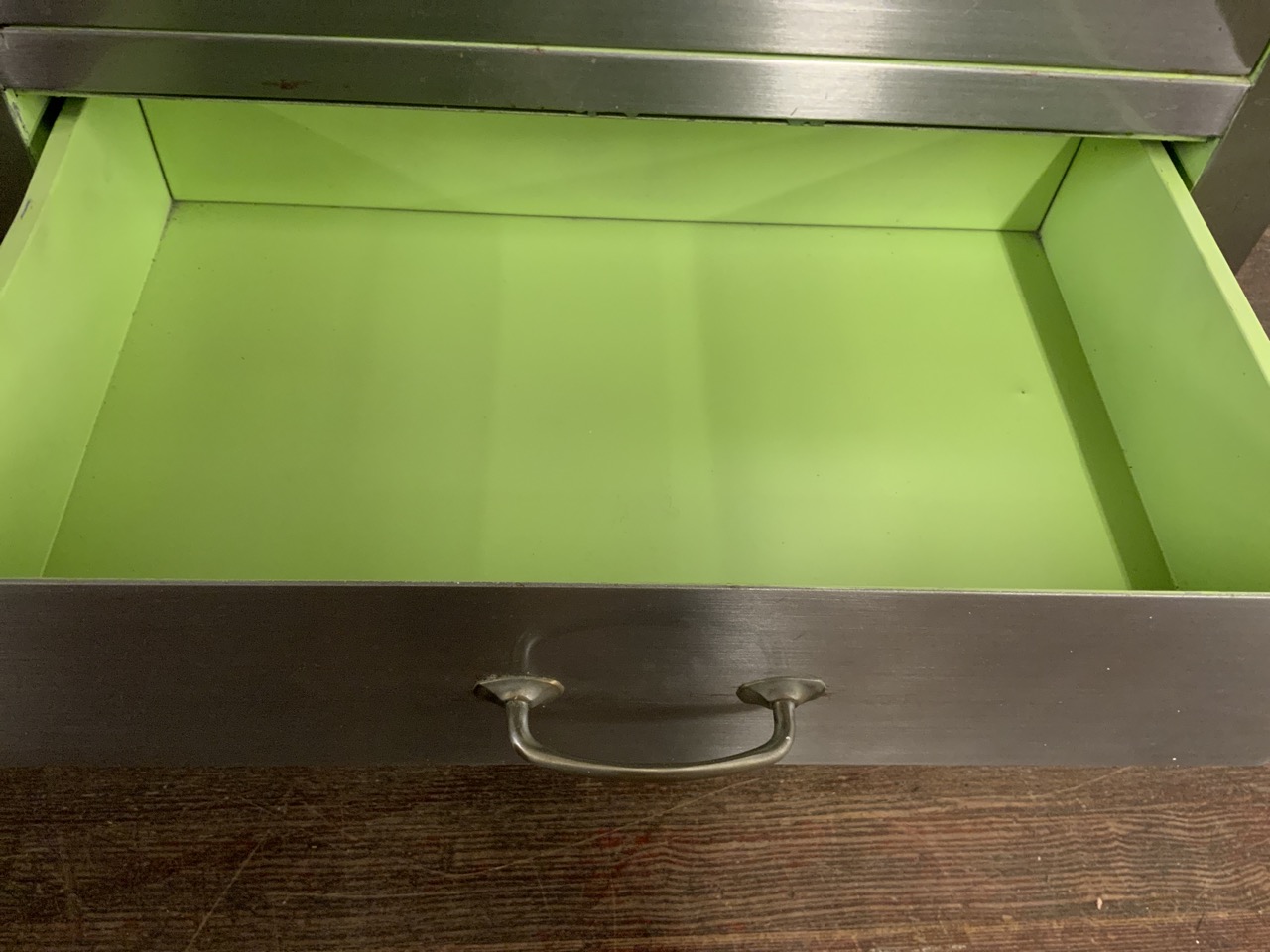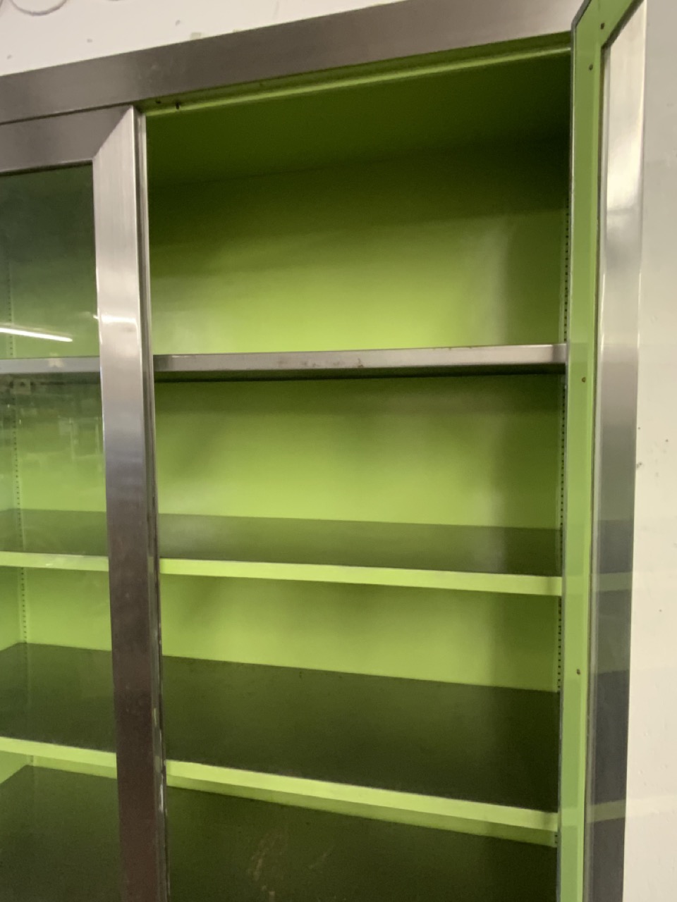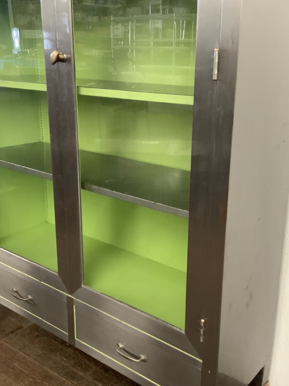 c. 1900-1900 stainless steel hospital medical cabinet. Two closing glass front doors. Re-stored and presents like new with added lime green interior paint. Brass footings.