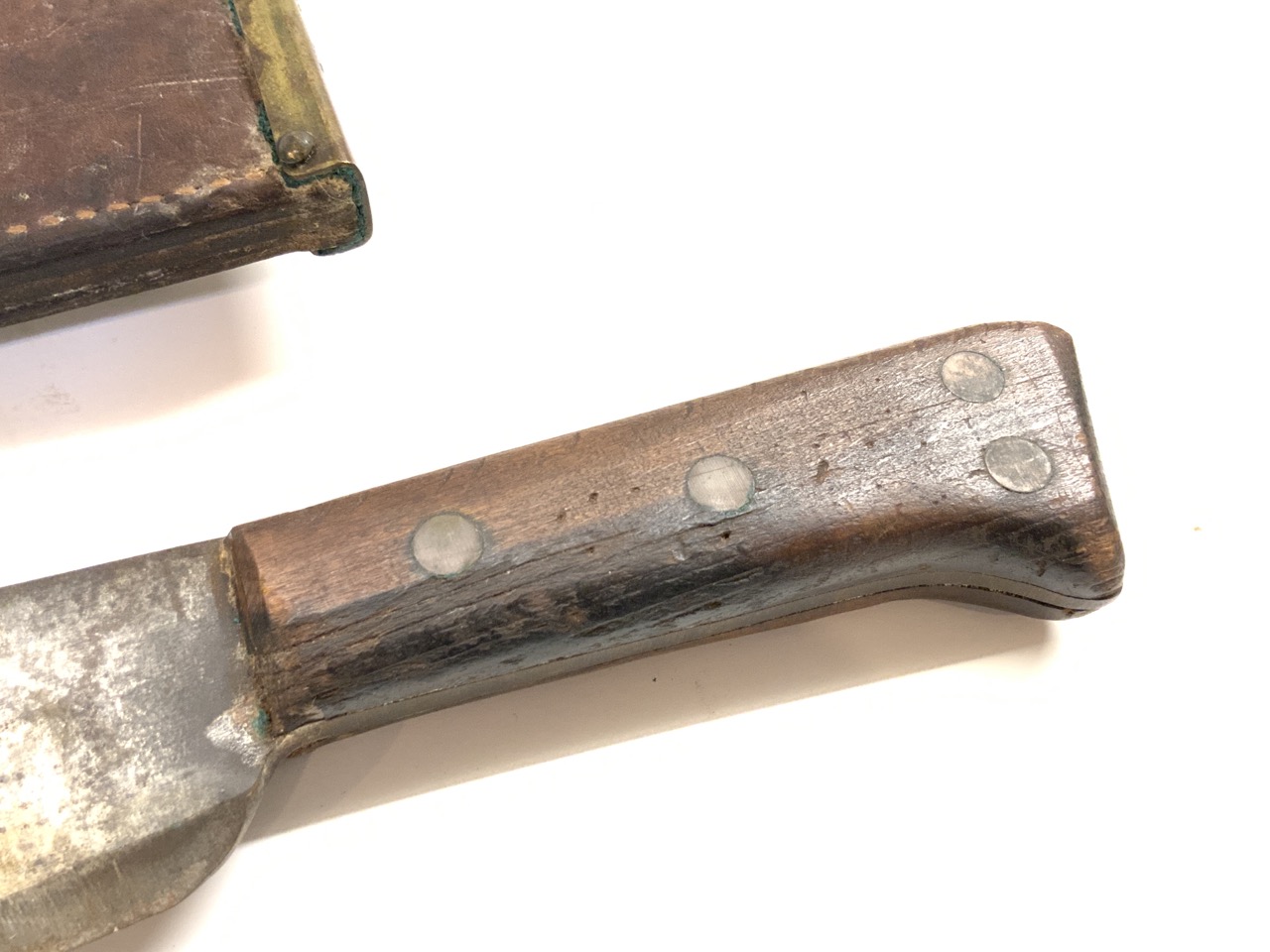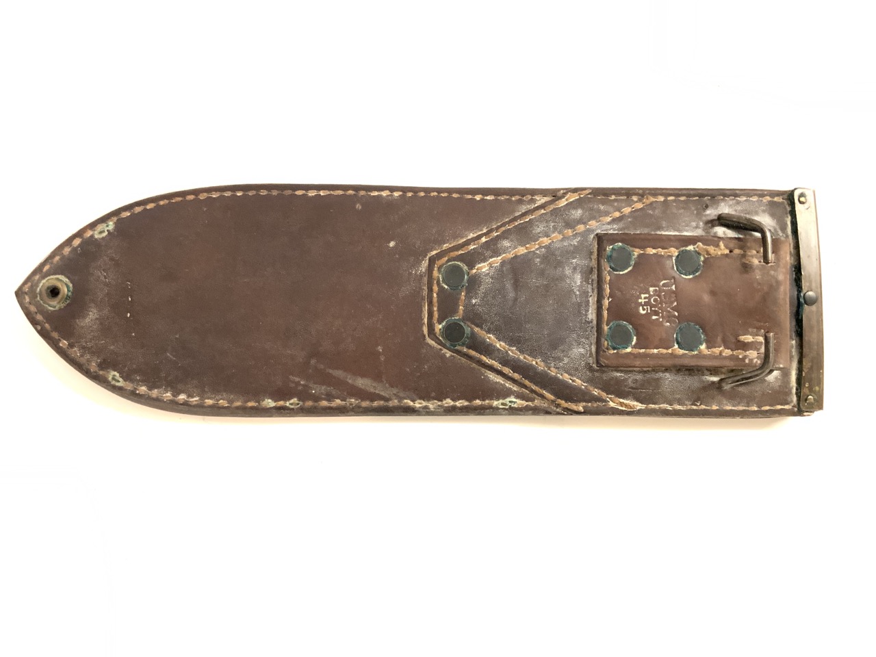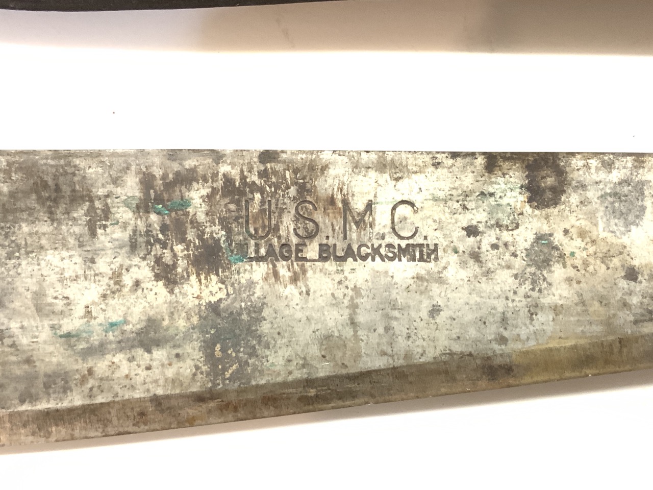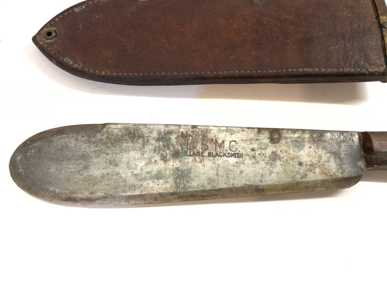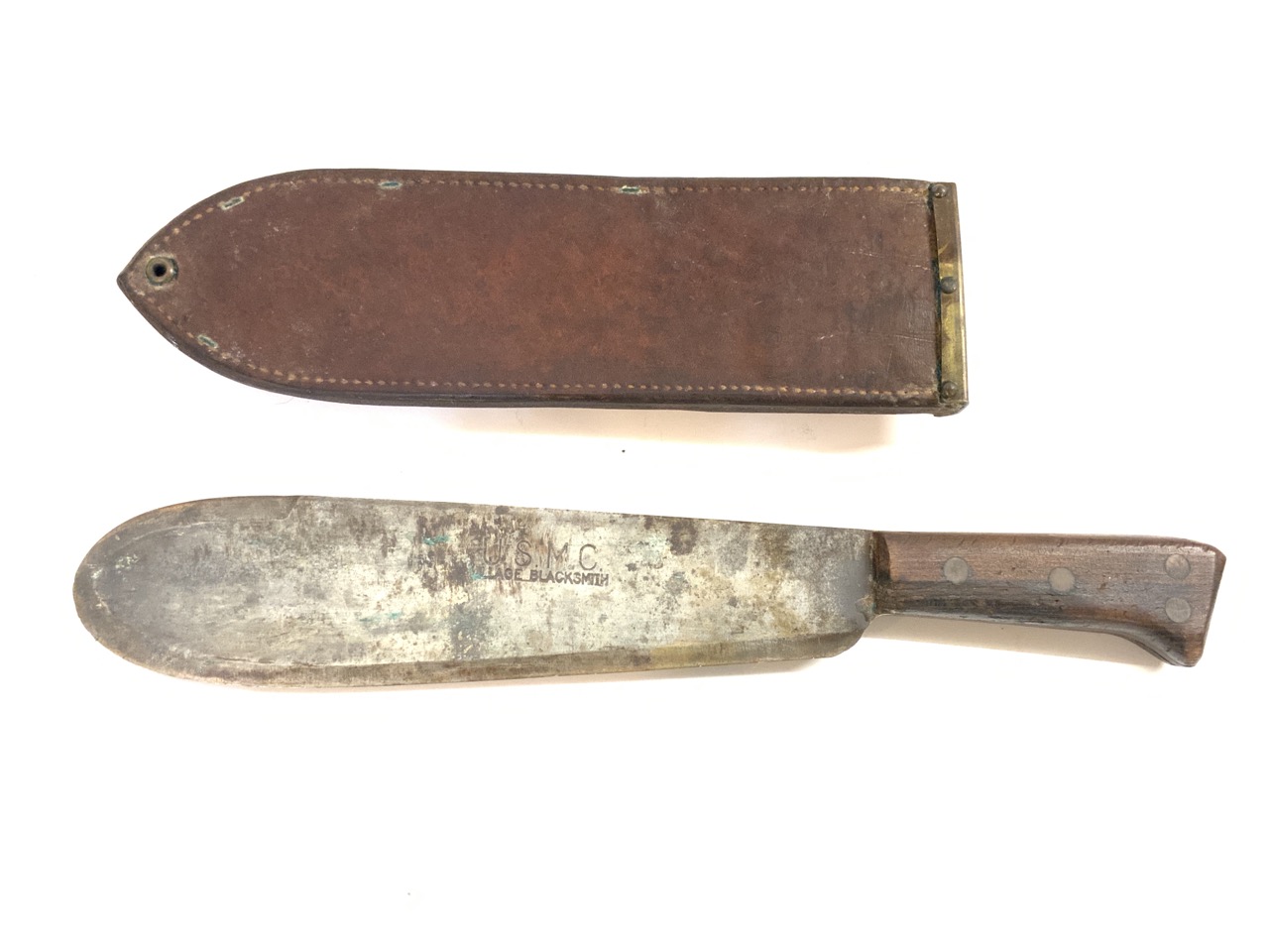1944 WWII Village Blacksmith U.S.M.C. Bolo Knife w/ Leather Sheath.