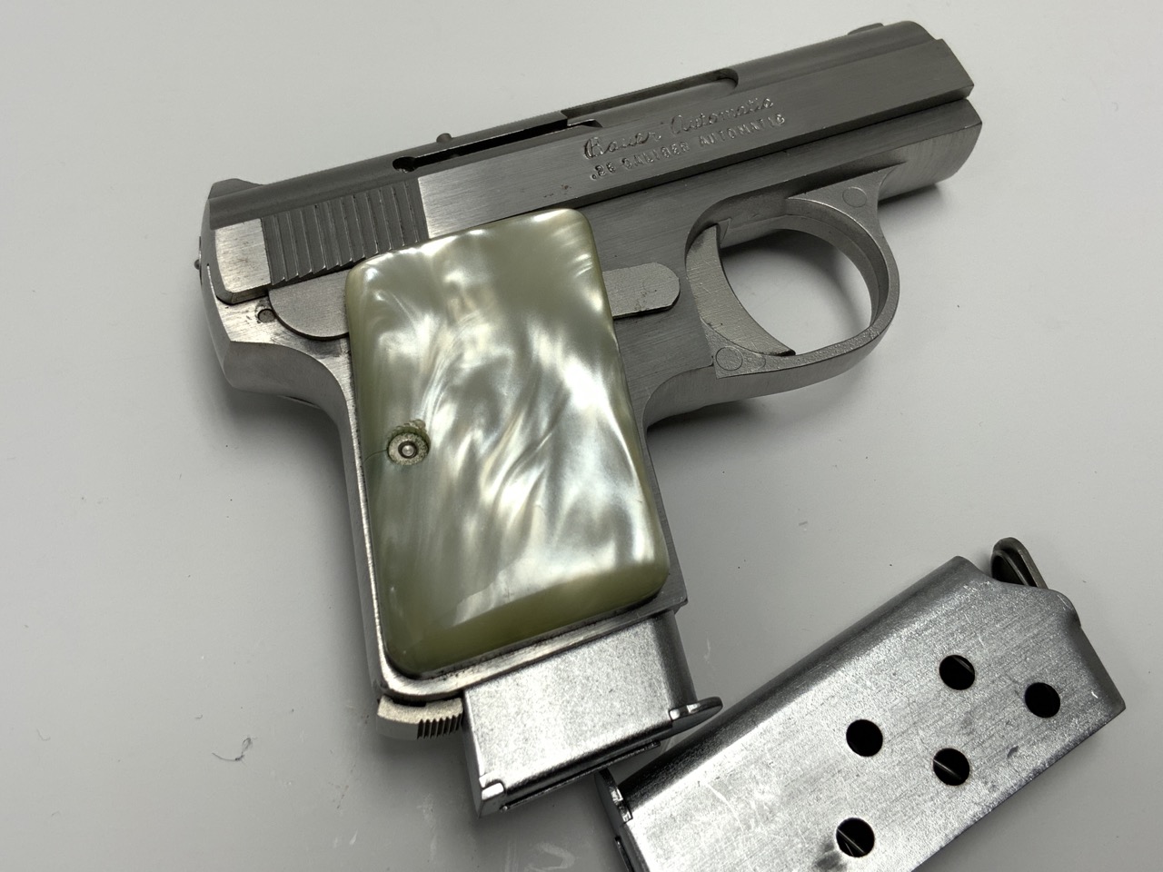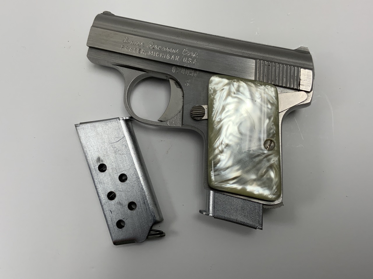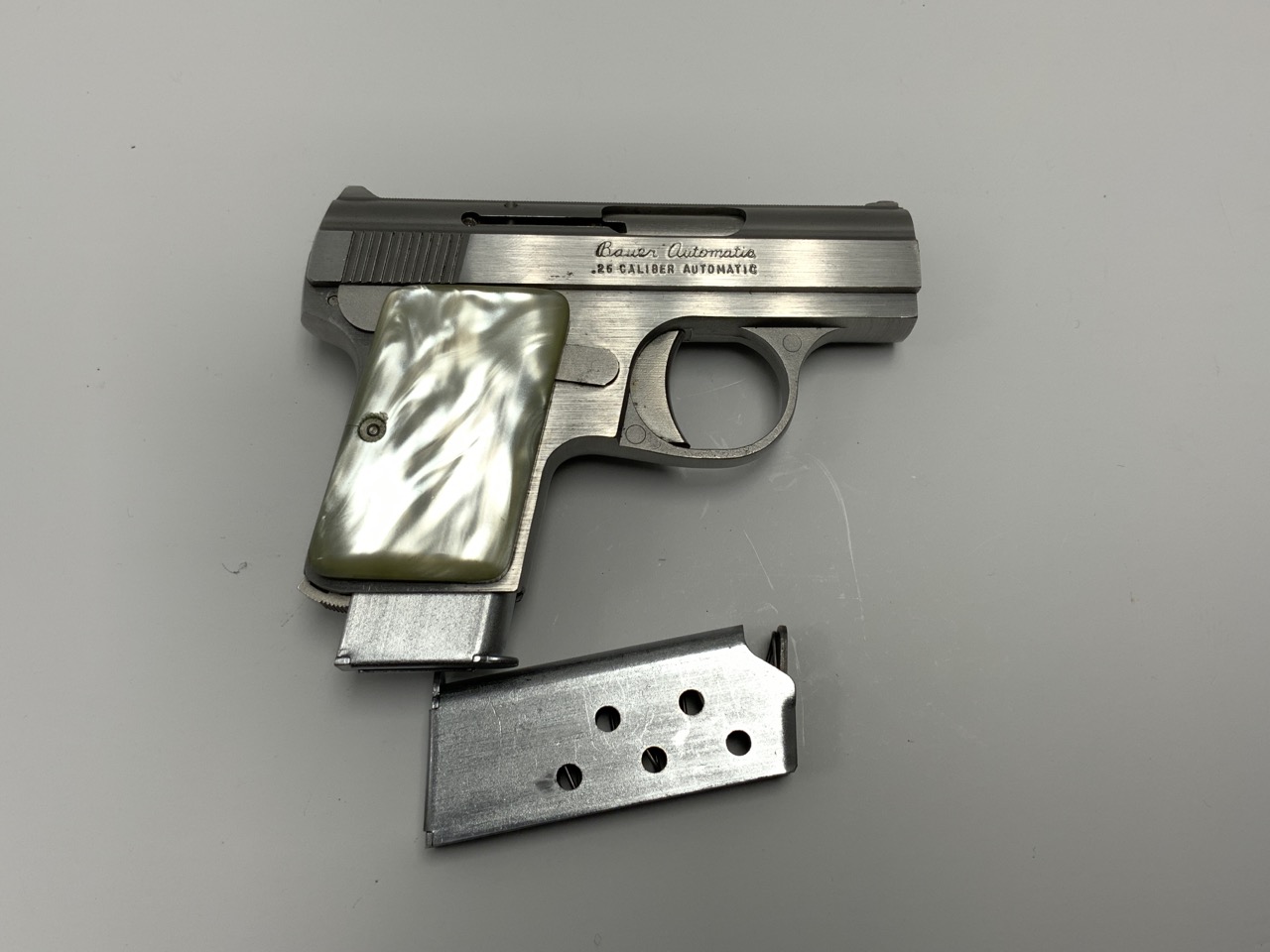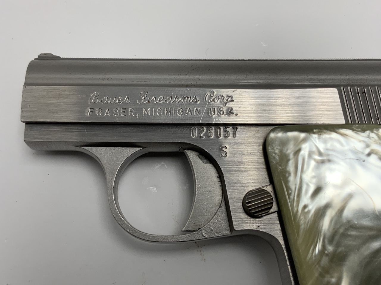 Bauer Firearms Co model Bauer Automatic chambered in .25 ACP. Stainless steel pocket pistol with faux pearl grips