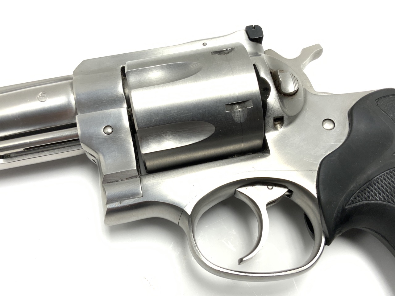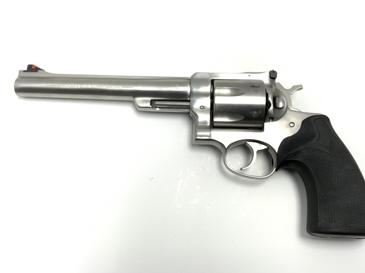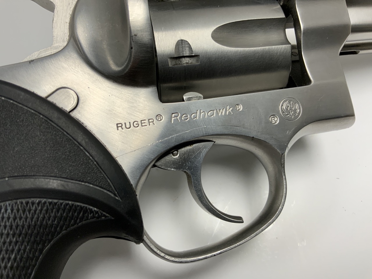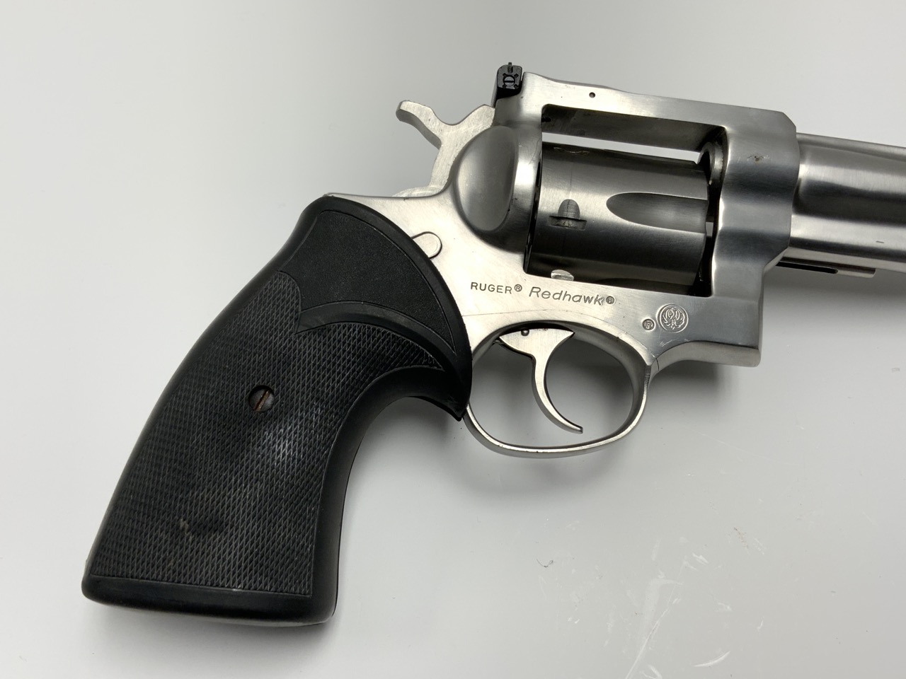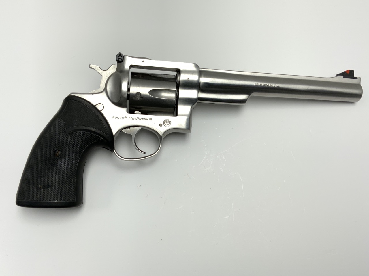 Ruger Redhawk chambered in .44 Magnum with a 7.5” barrel. Stainless steel with rubber stocks. Average handling