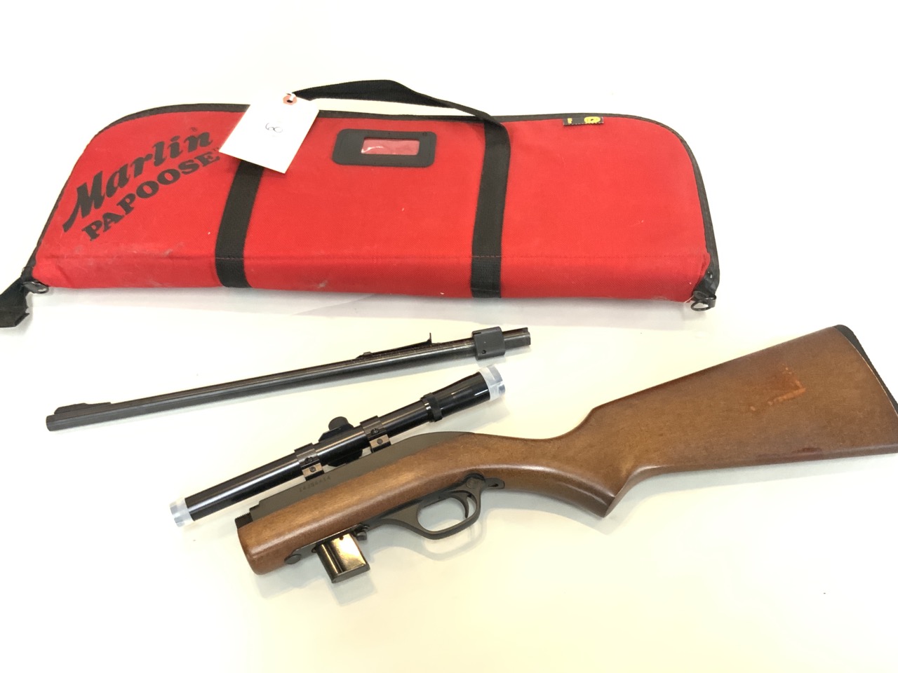 The Marlin Papoose Model 70P .22 Long Rifle is a very unique rifle that you don't see everyday. The Marlin Papoose is a collapsible .22 LR with a micro-groove barrel, making it easy item to store away.