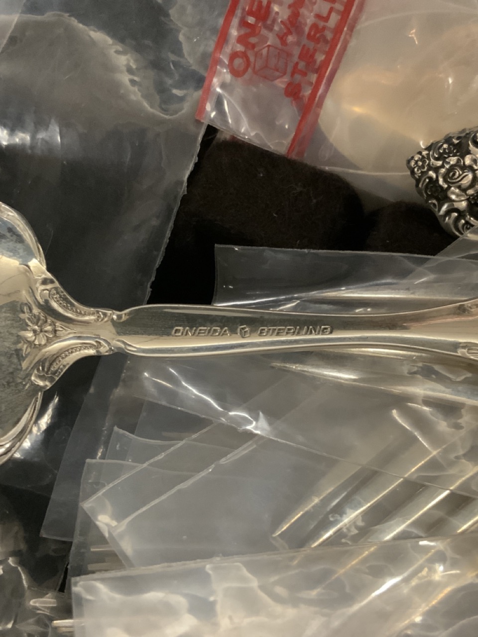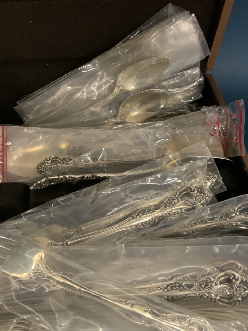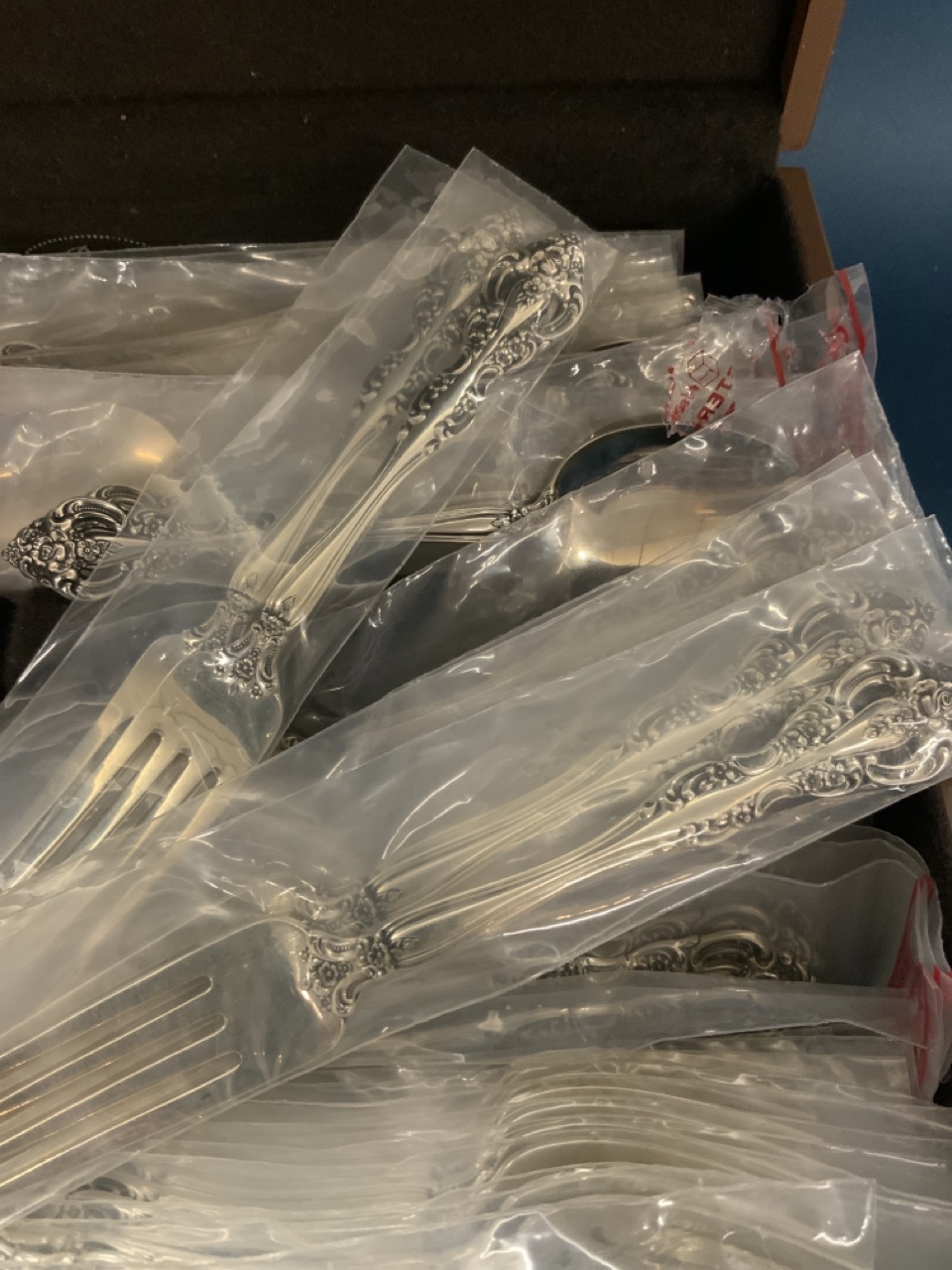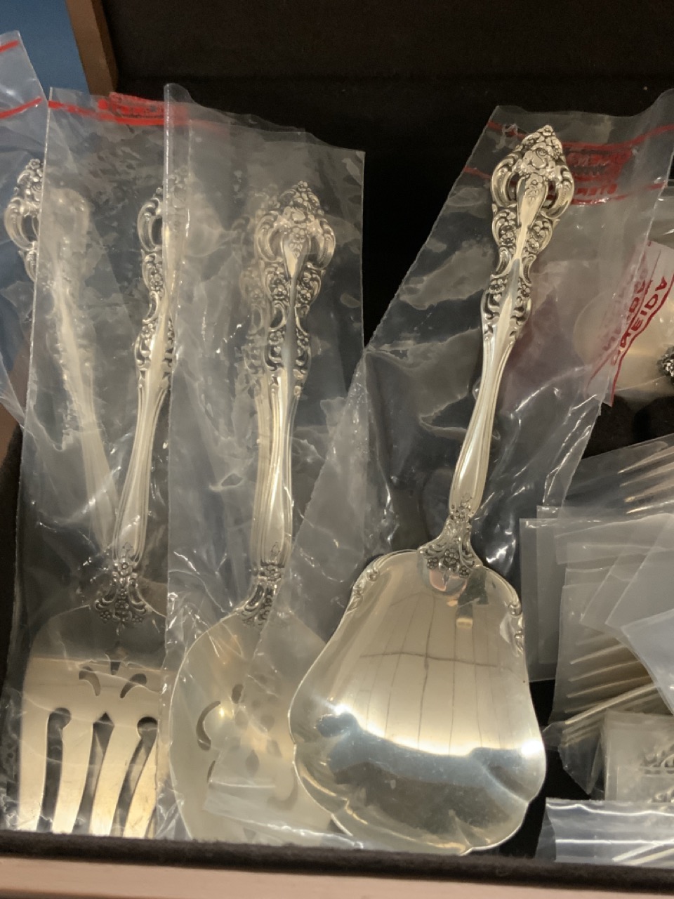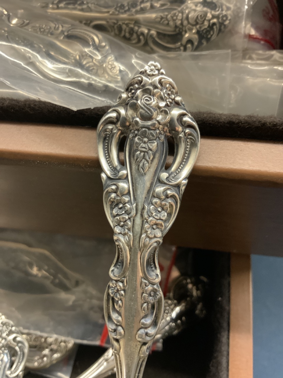 Total weight excluding knives and pie server : 101.571 Troy Ounces