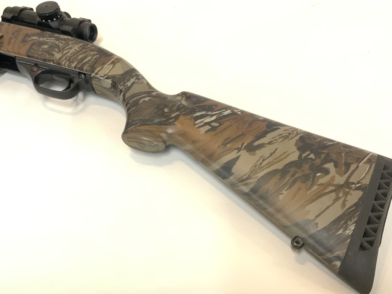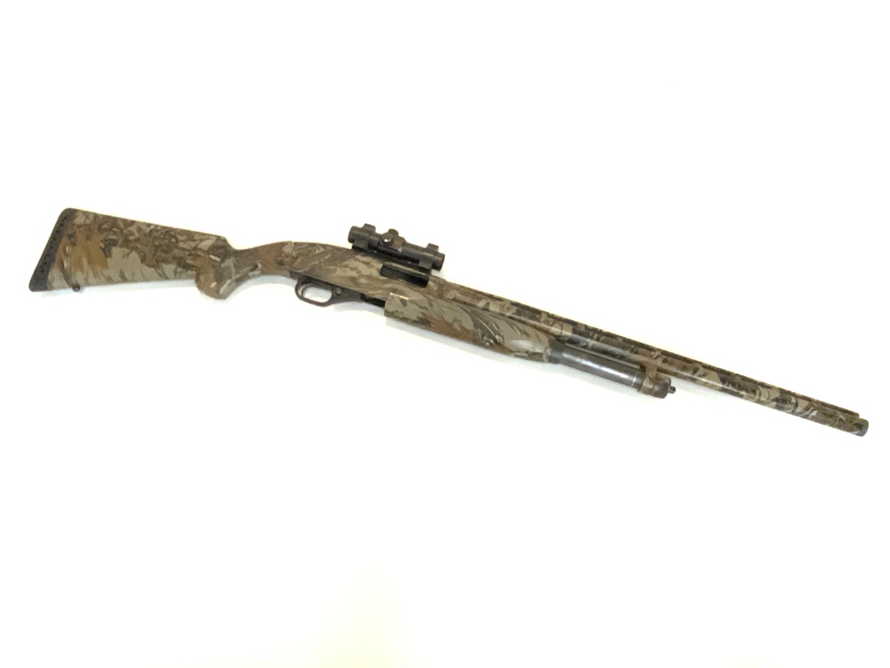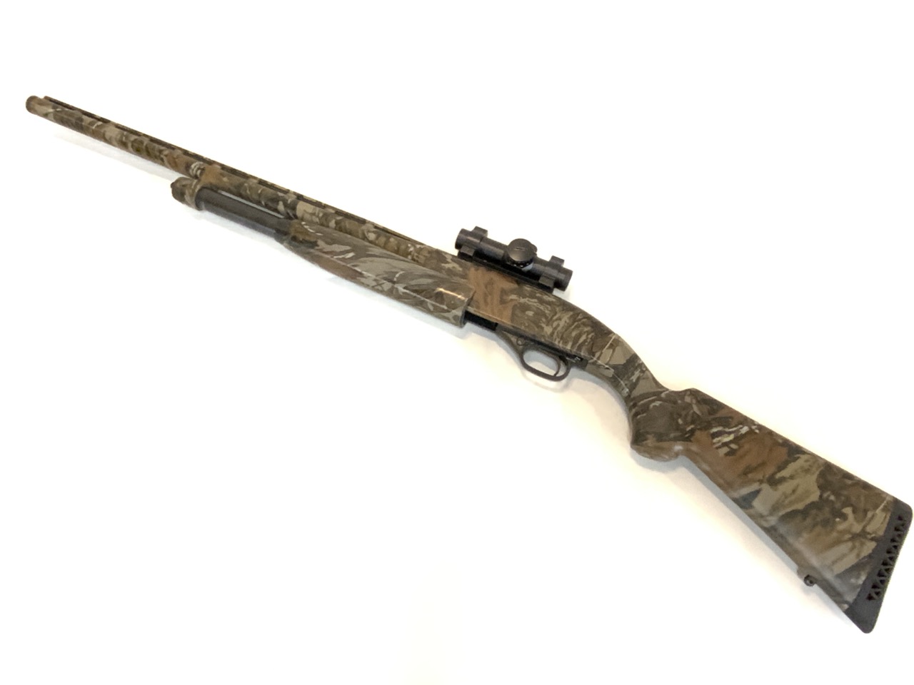 The Winchester Model 1300 12 Gauge Shotgun is a great turkey hunting gun to have. The shotgun has a full camo stock, has a redot sight equipped to it, and has a full choke attachment equipped to it as well.